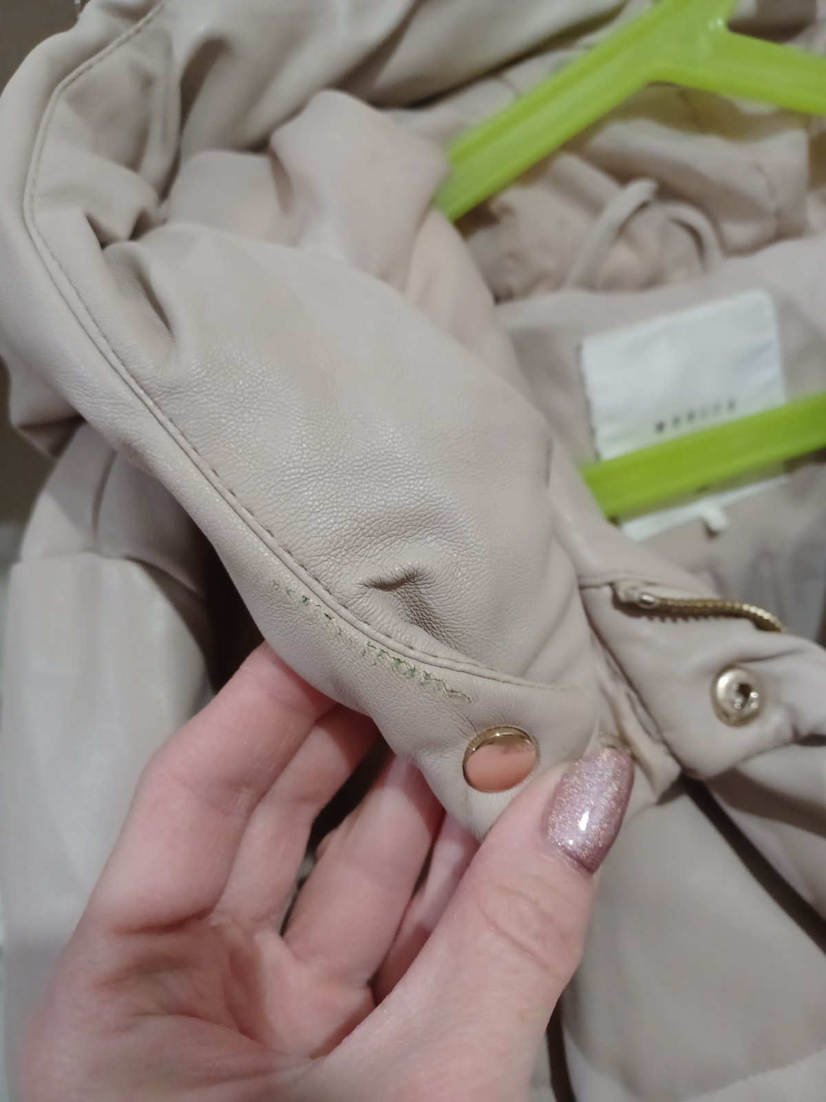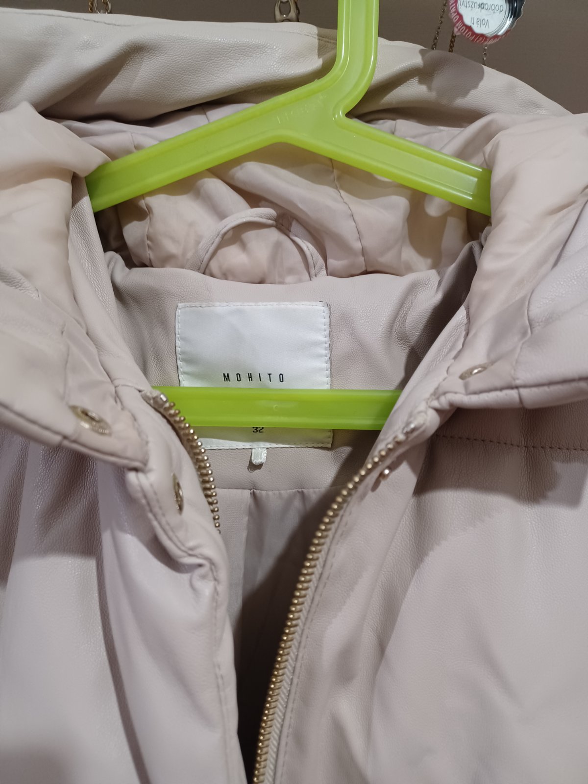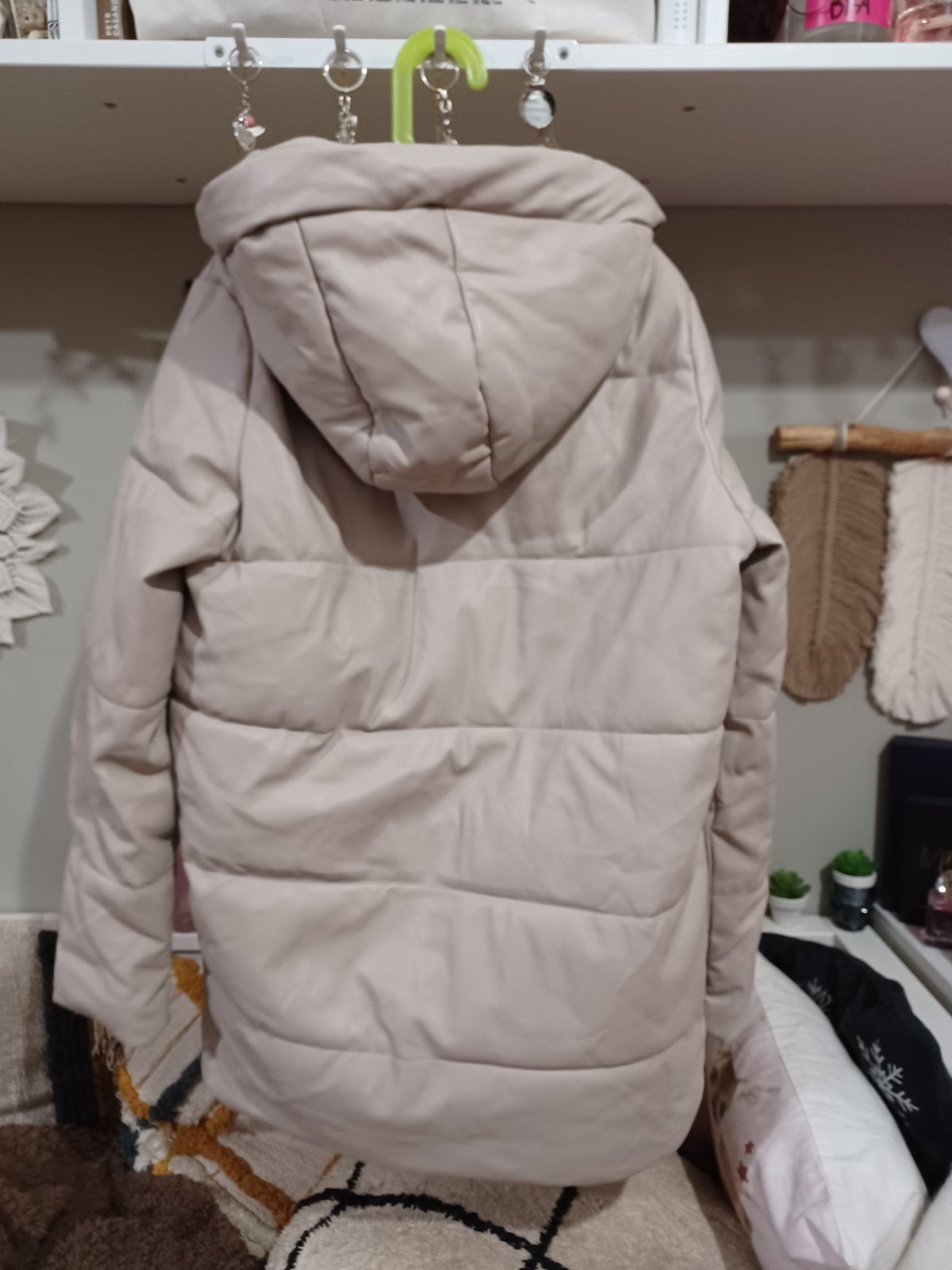 Krásná delší koženková béžová bunda oversize 32, běžné známky použití, drobné vady (klasika u koženkových bund). Sedne až po velikost S.
