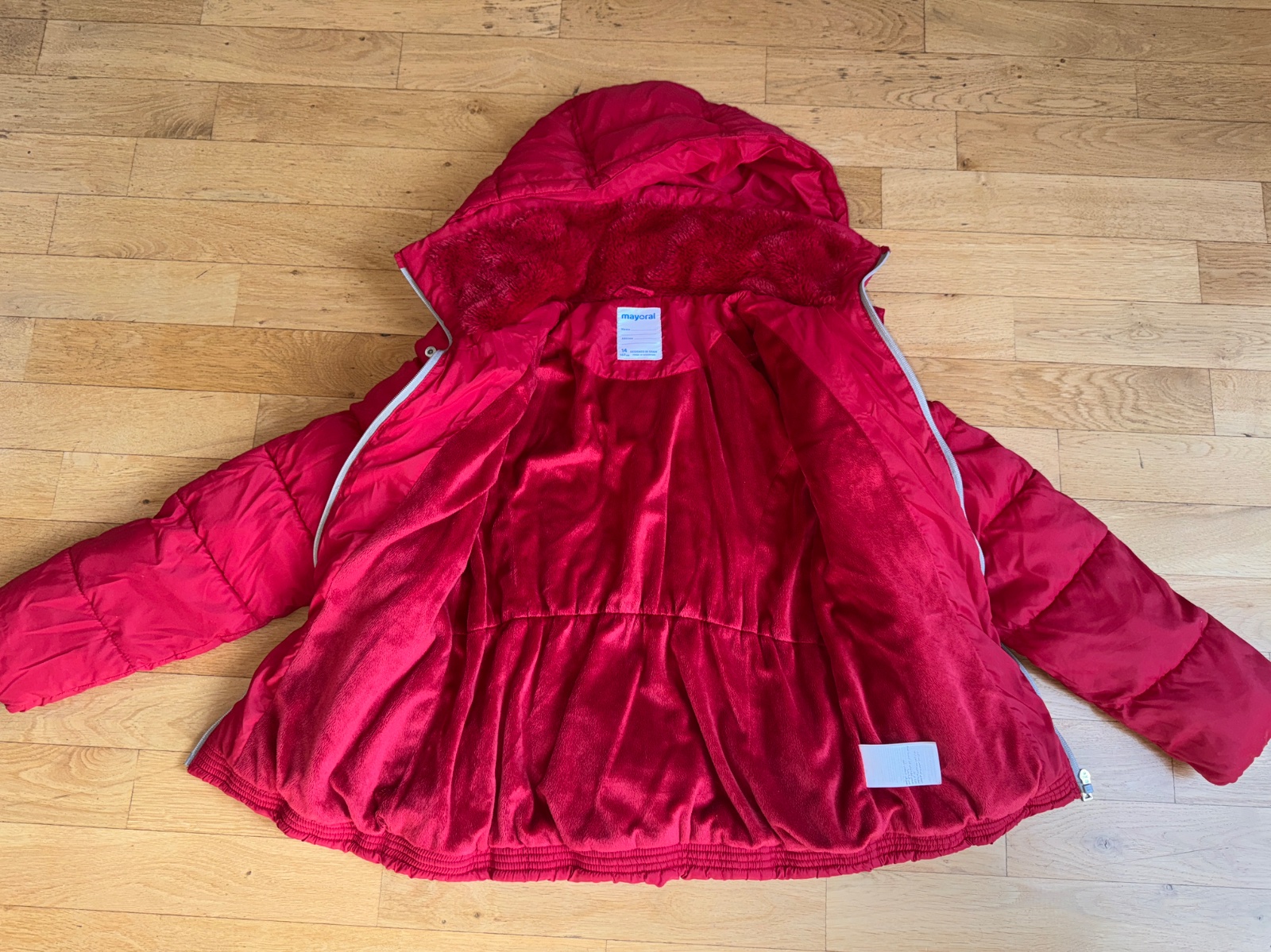 Pěkná vypasovaná bunda s odepínací kapucí, Délka rukávu 56cm, délka zad 57cm, přes hrudník 43cm. Velikost na bundě je vedena 157, podle me je menší - spíš 146-152.