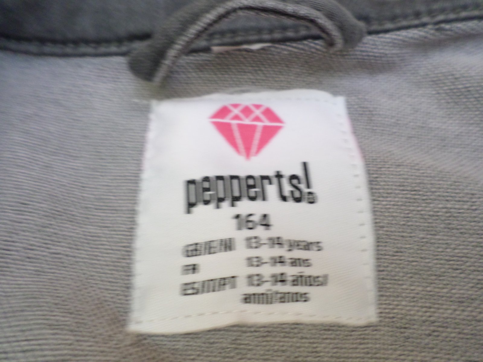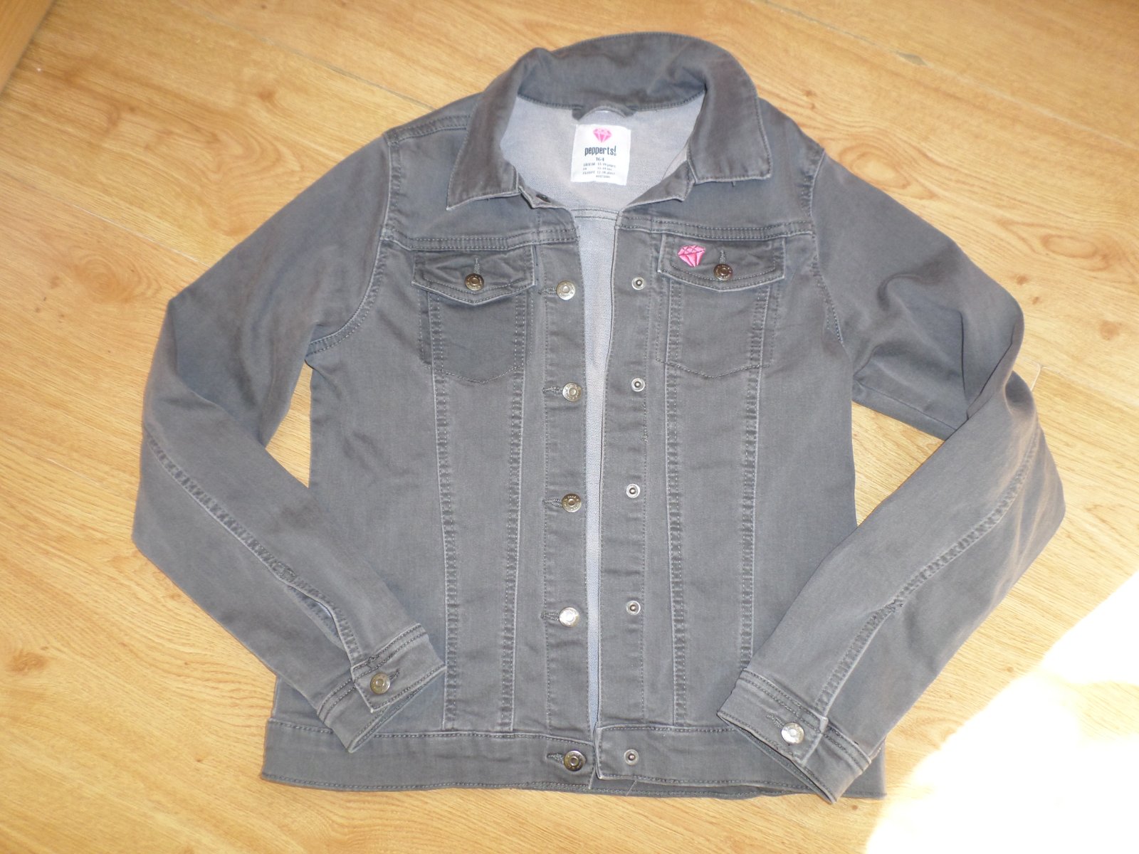 Riflová bunda z Lidlu, nošená. Vel. 164. Z vnitřní strany je zatržená nit.Dole u lemu je místo s dírkou - viz foto. Barva taková šedo-černá