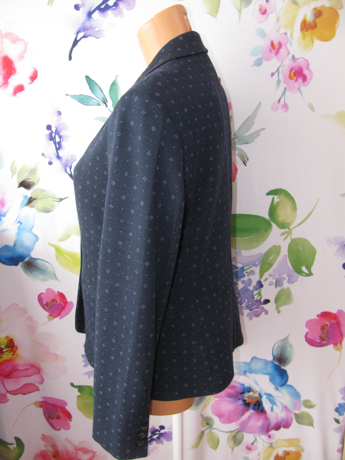 Dámské tmavě modré pohodlné sako s drobným vzorkem, zap. na dva knoflíky, dvě kapsy, podšívka, 60% bavlna, 40% polyester. dále 100% polyester. Top stav bez vady, velmi málo nošené.