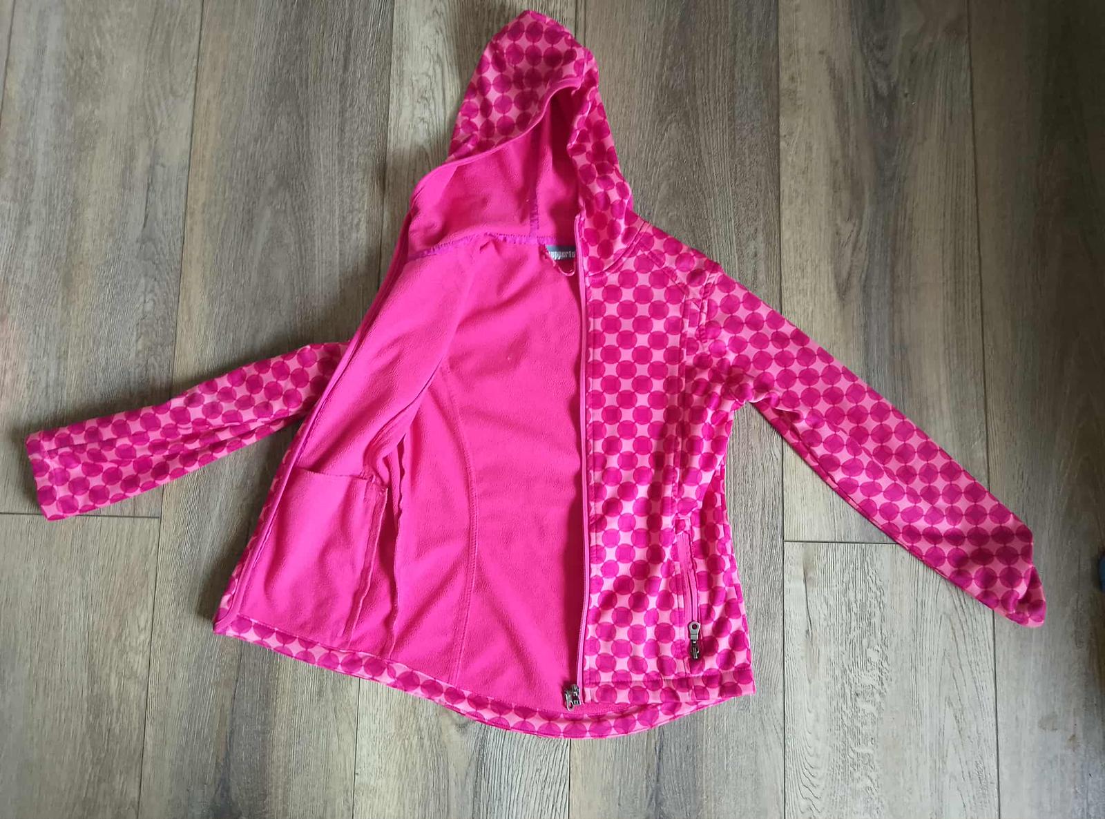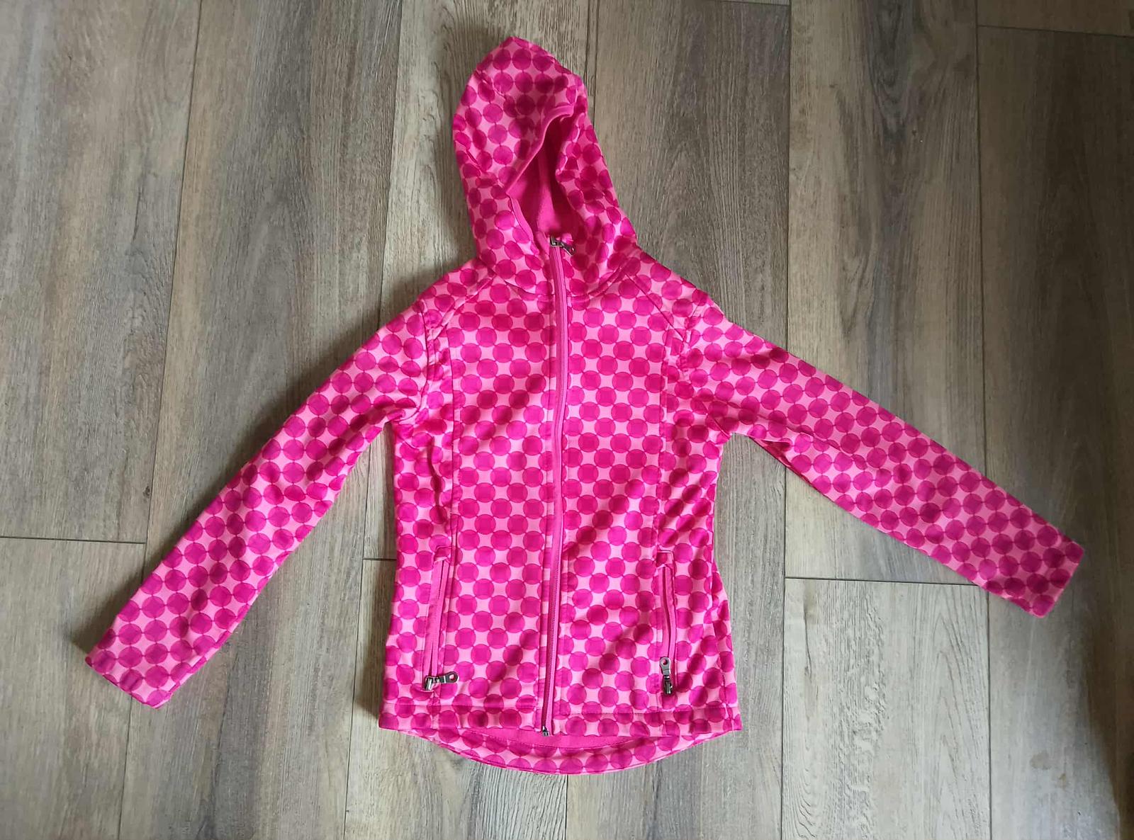 prodám sofshilovou bundu růžové kombinace barev s kapucí na pevno,zn.pepperst,vel.134/140,prodloužená záda,délka předek 52cm,rukáv od krku 51cm