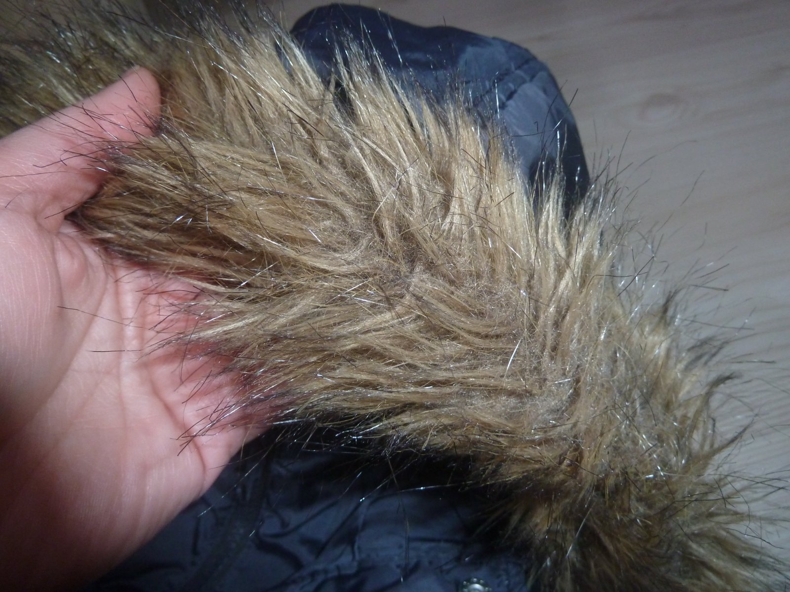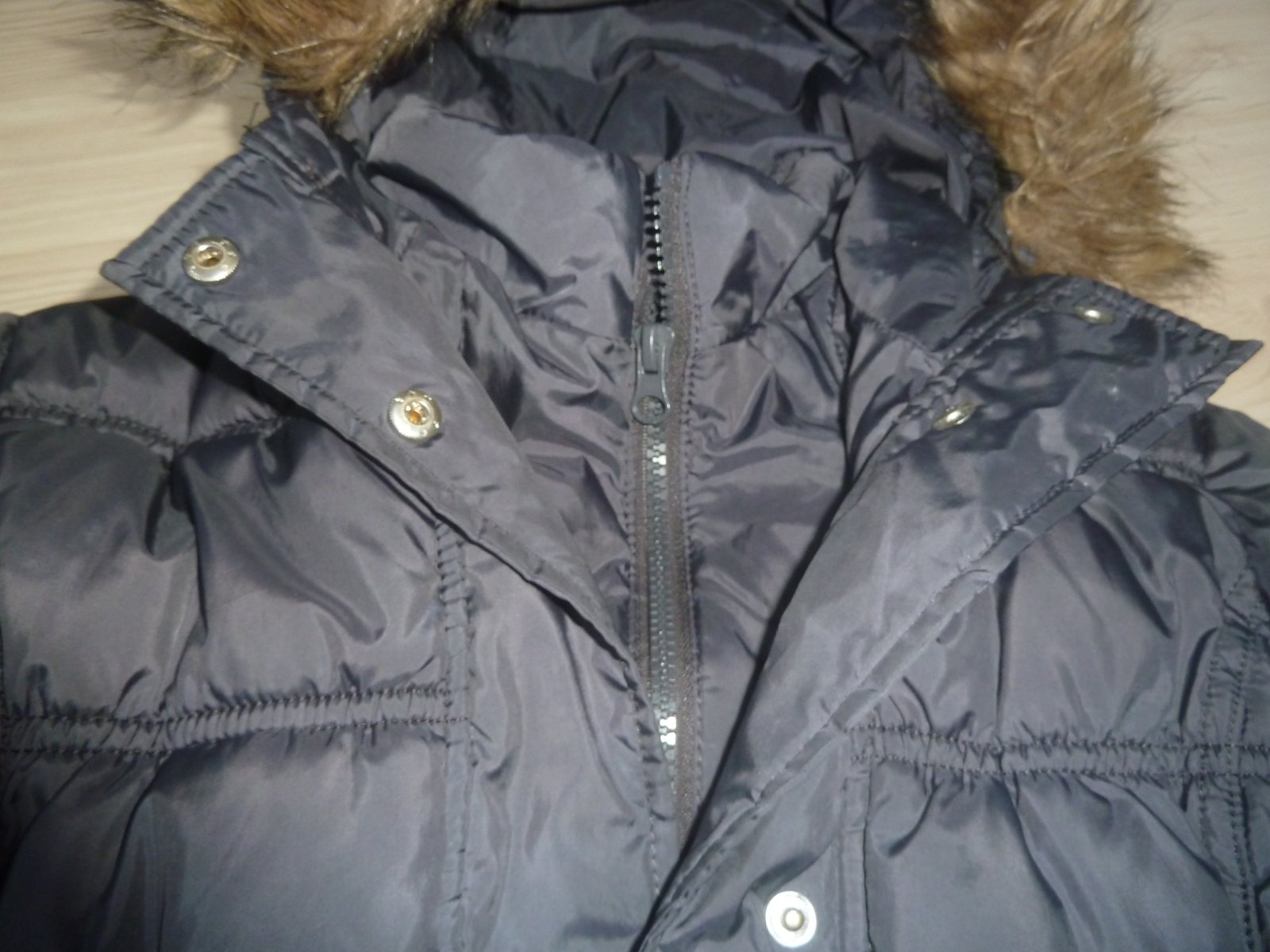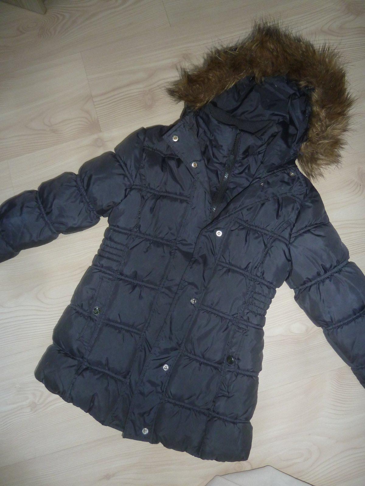 Tmavěmodrá delší zimní bunda. Výplň bez vad, kožíšek nesepraný. Dvojité zapínání na PD