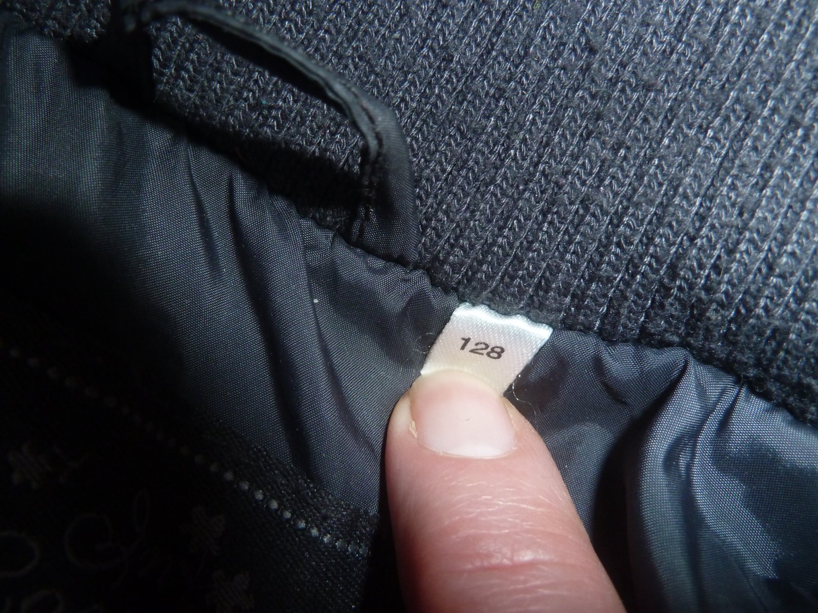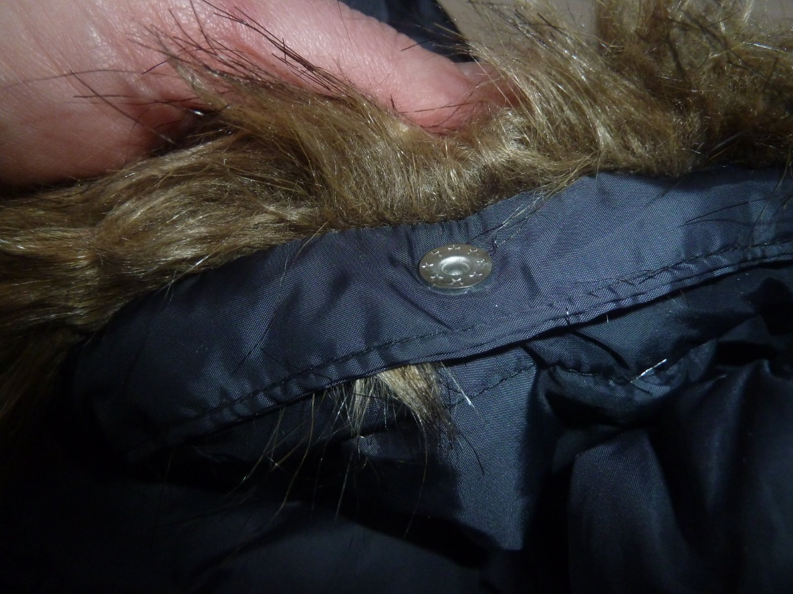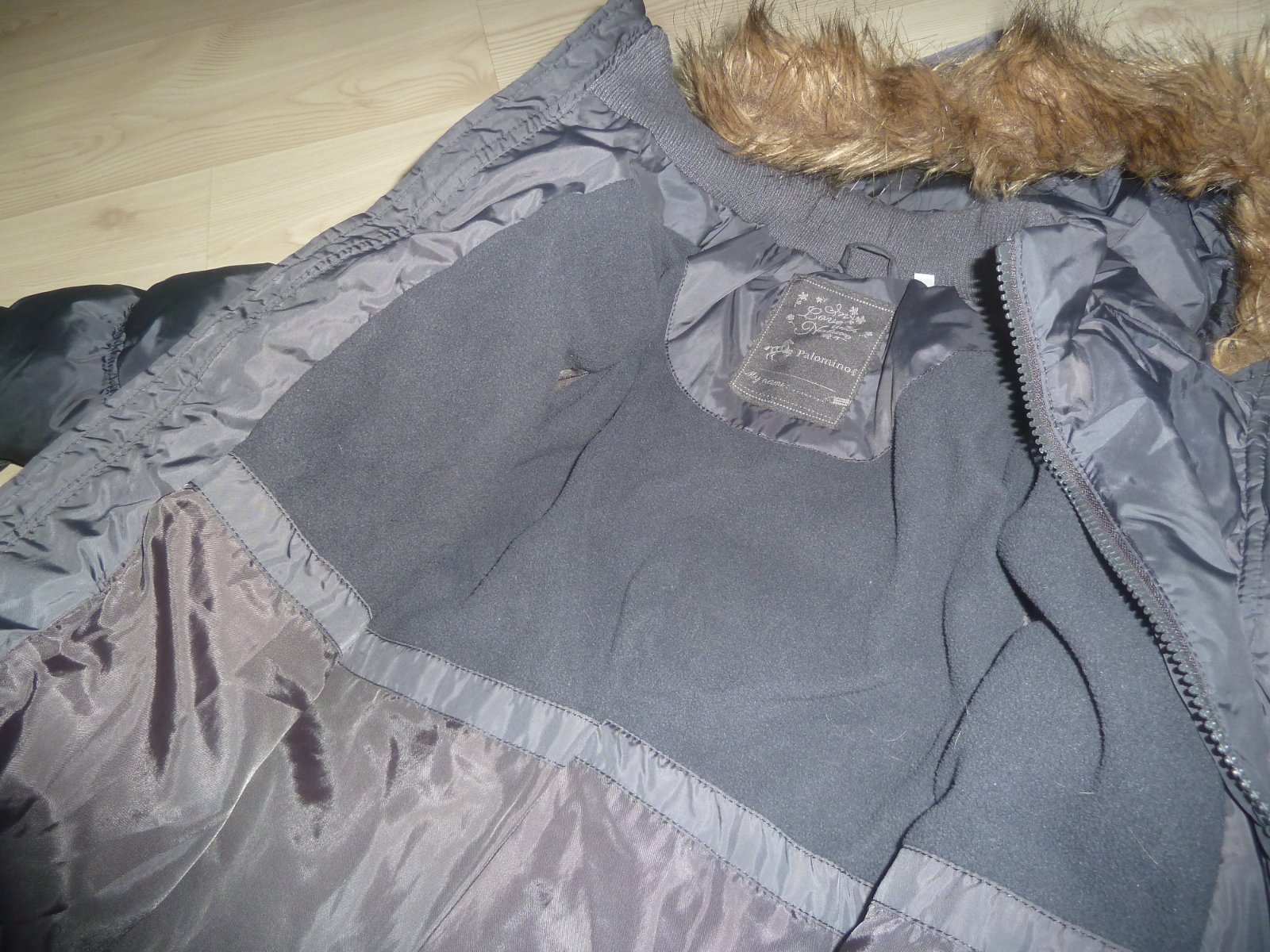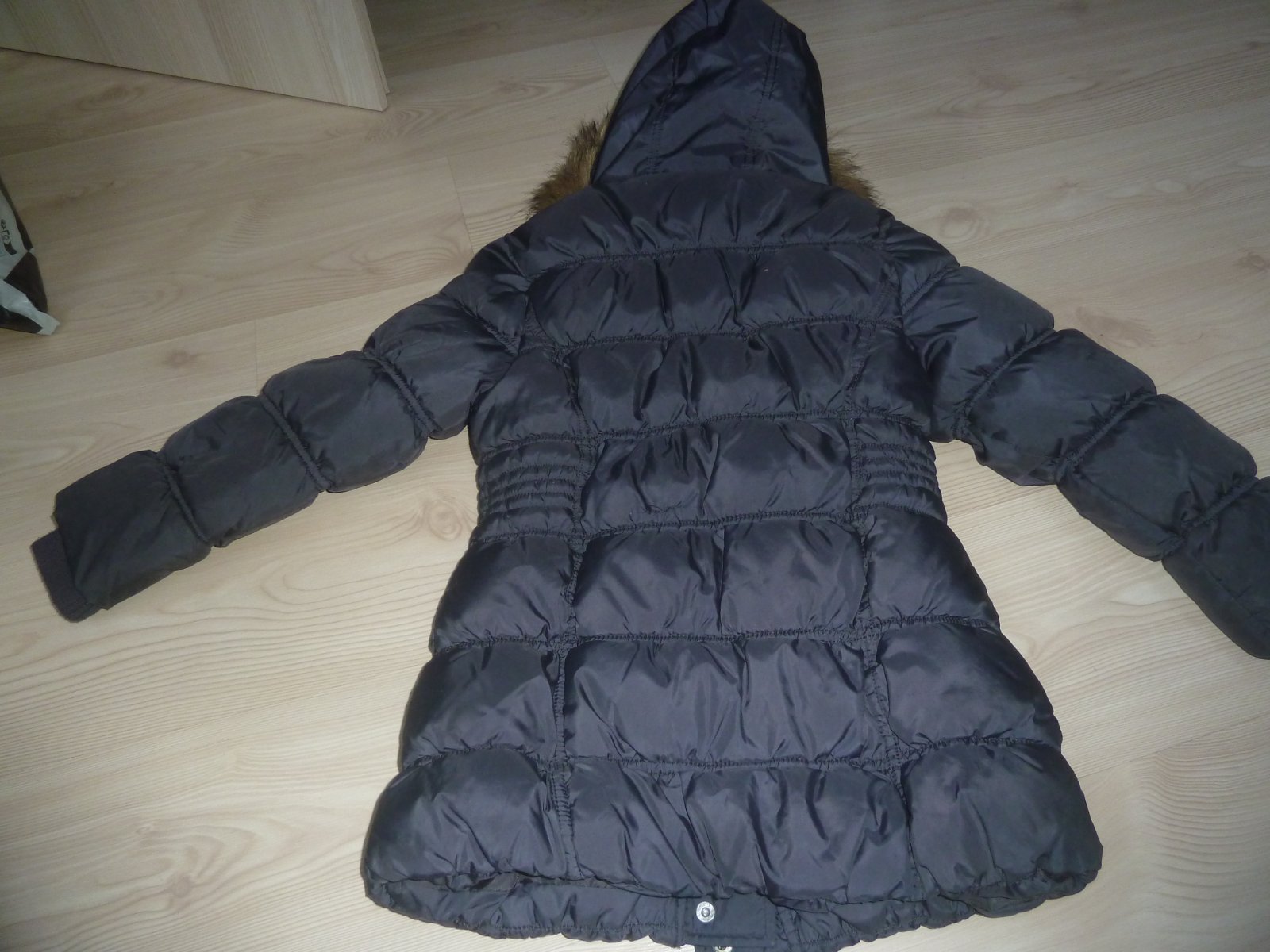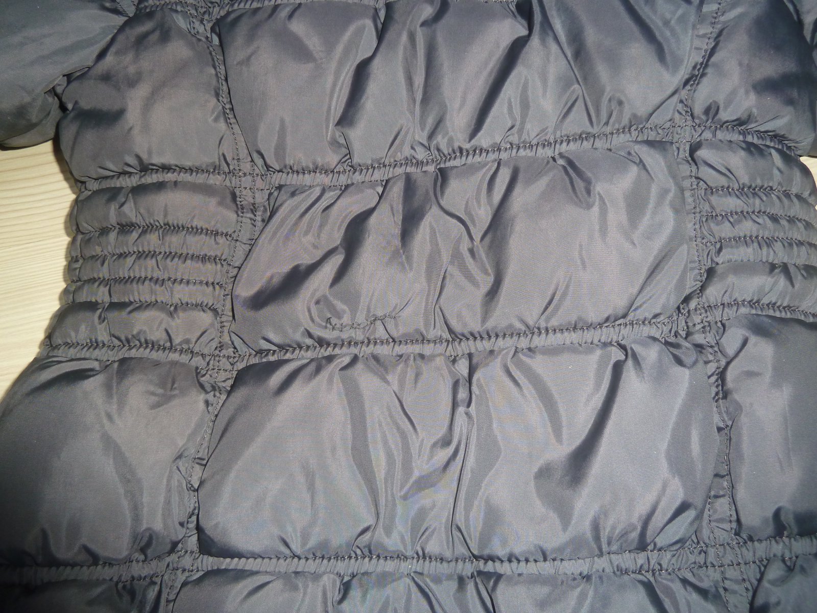 Na zádech u řasení zapošitá dírka - viz poslední foto - ztrácí se při pohledu na bundu a při nošení v řasení bundy.