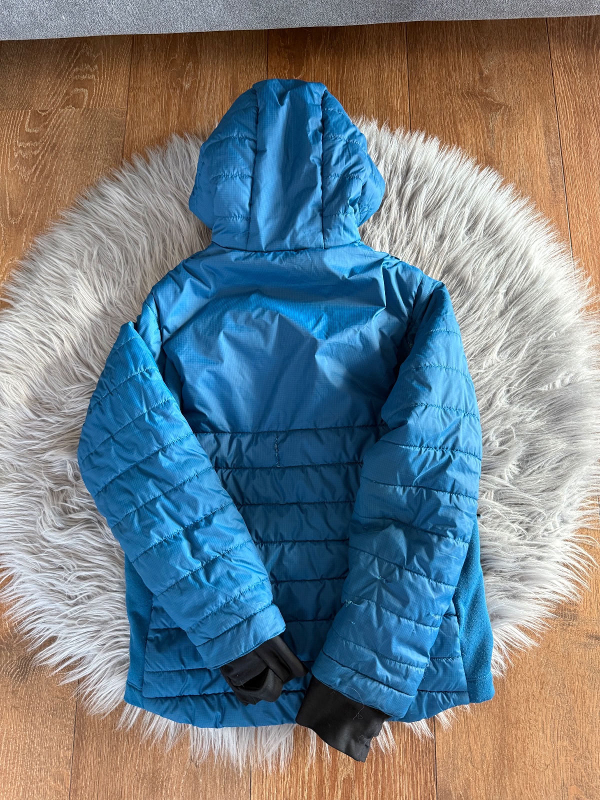 nošená, podšitá flísem, má vyrvaný jeden petentek u krku (viz foto), ale zapnout lze, jsou tam 2 kousek od sebe (prý je doplnit), na kapse jeden patentek lehce poškrábaný, jinak v pořádku