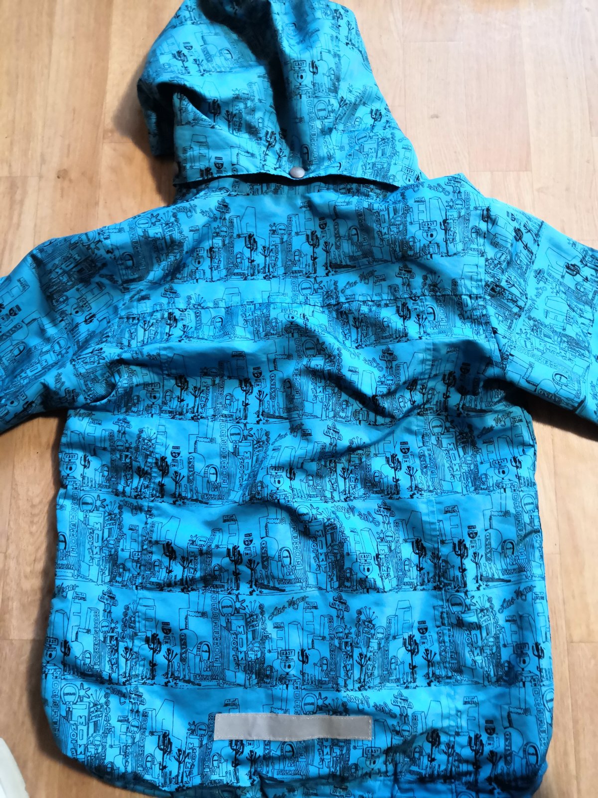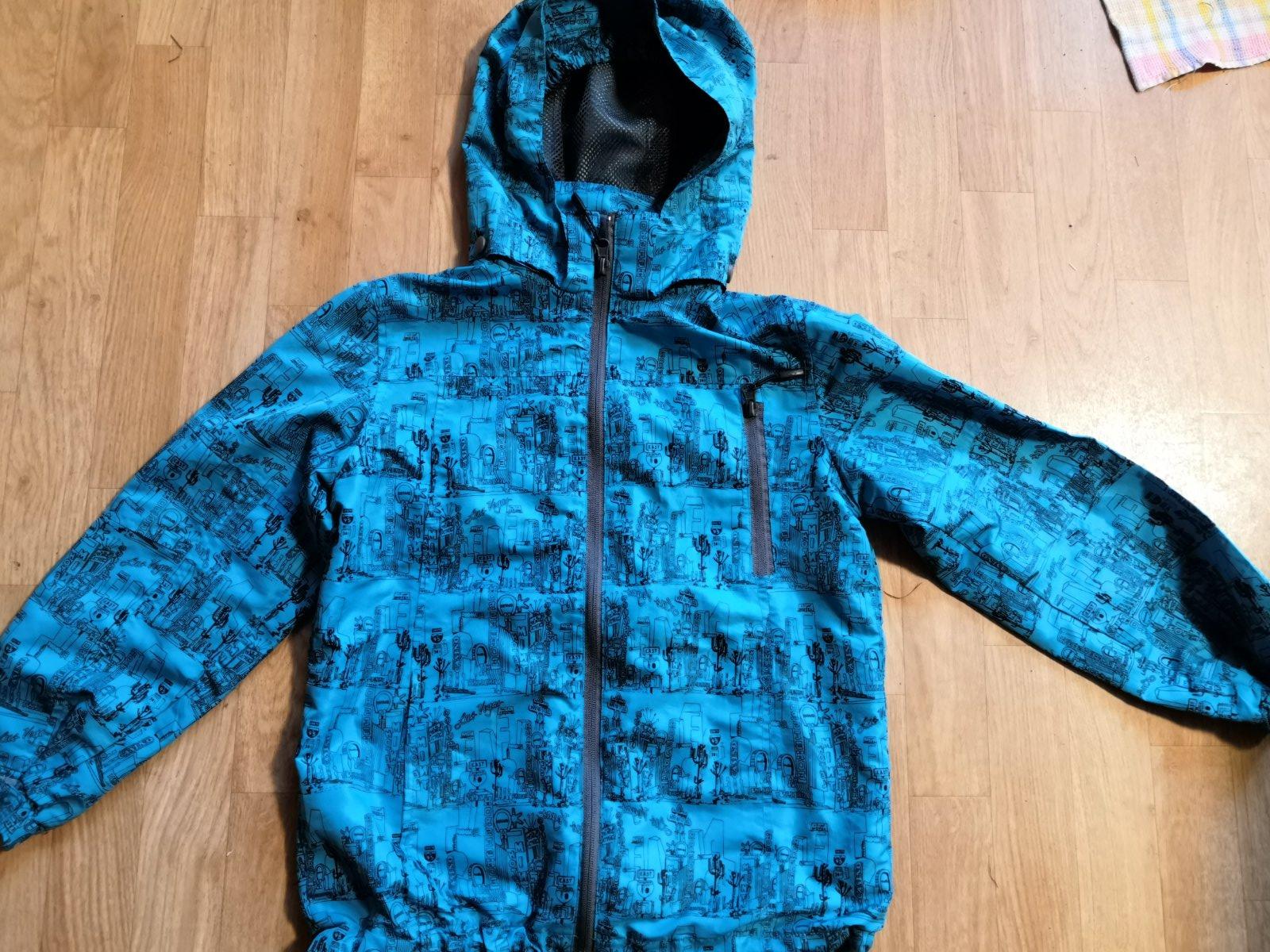 Velmi pěkná šusťákovka. Odepinaci kapuce, dole guma na stažení.
