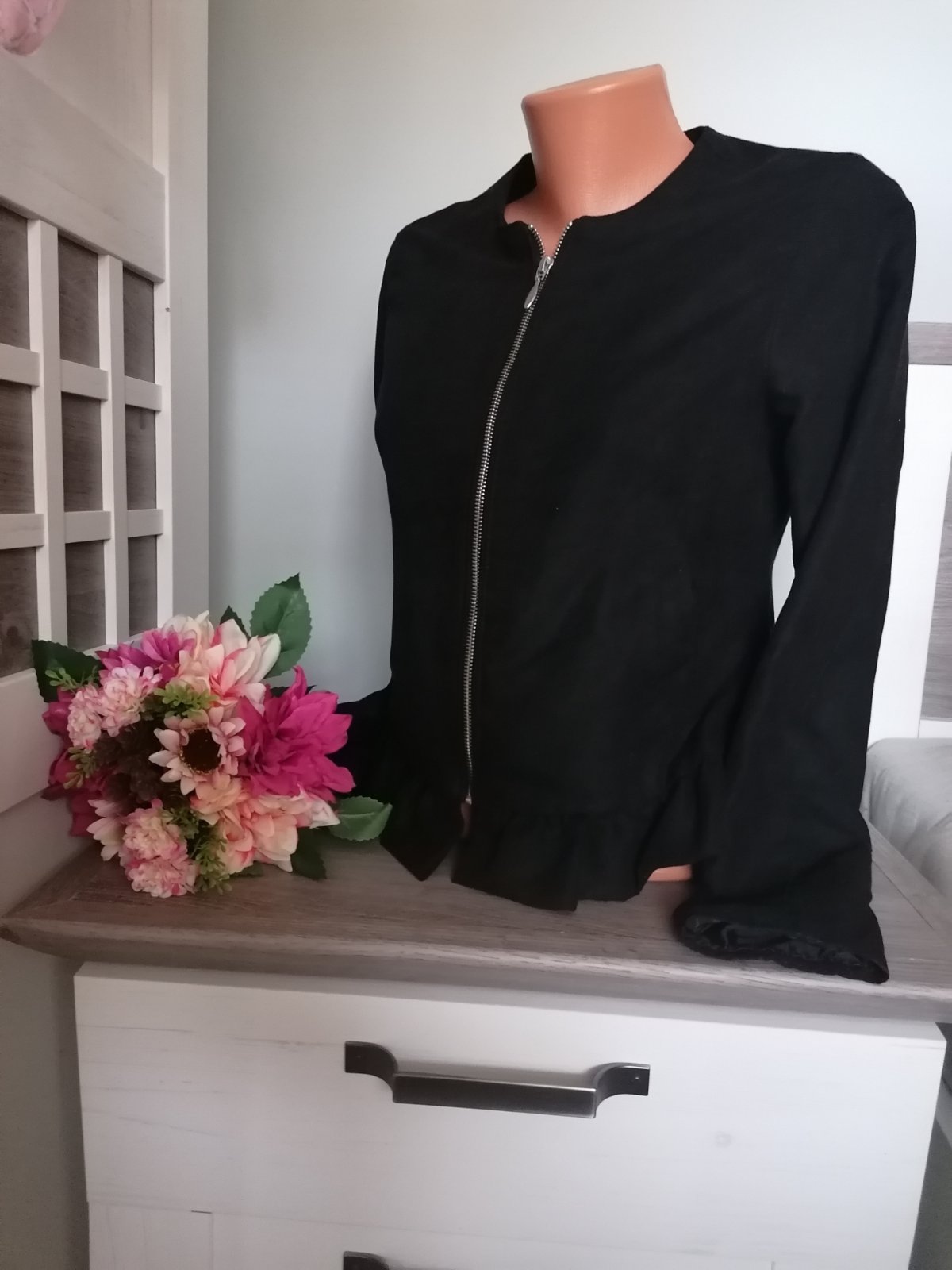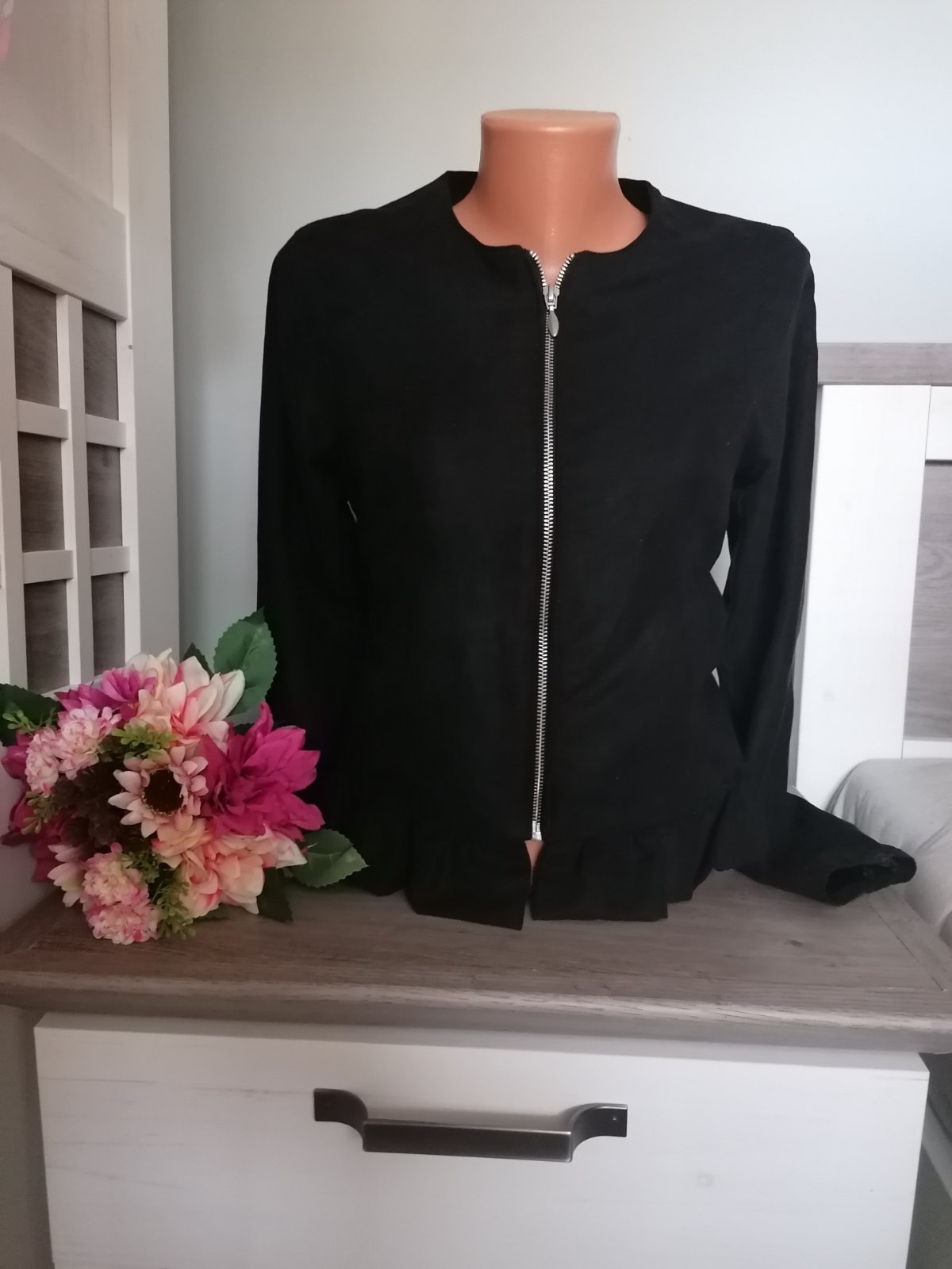 Super lehká bunda s podšívkou a volánkem na spodním lemu. Má kapsy 😊 Bunda je v perfektním stavu. Materiál sametový, příjemný 😊 100 % polyester.....Míry : délka 55 cm, pas 2 x 44 cm, průramky 2 x 47 cm a délka rukávu od krku je 67 cm. Poštovné - balíkovna za 85 Kč nebo zásilkovou za 90 Kč.