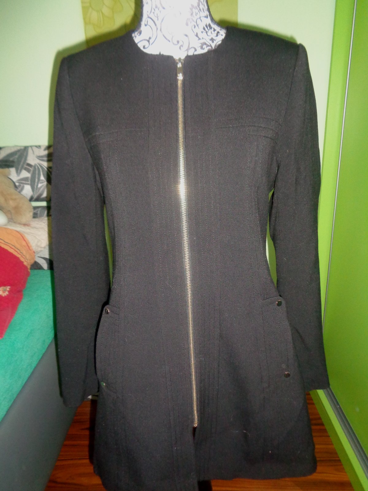 JAKO NOVÝ- NOŠENÍ NENÍ ZNÁT. VELMI KVALITNÍ PEVNÝ A NEMAČKAVÝ MATERIÁL 67% PES, 29% VISKOZA A 4% ELASTEN. CELÝ KABÁT MOC PĚKNÝ PROŠÍVANÝ A PODŠITÝ ČERNÝM ŠUSŤÁKEM PES. NA ZIP. VPŘEDU DVĚ KAPSY. ÁČKOVÝ STŘIH.