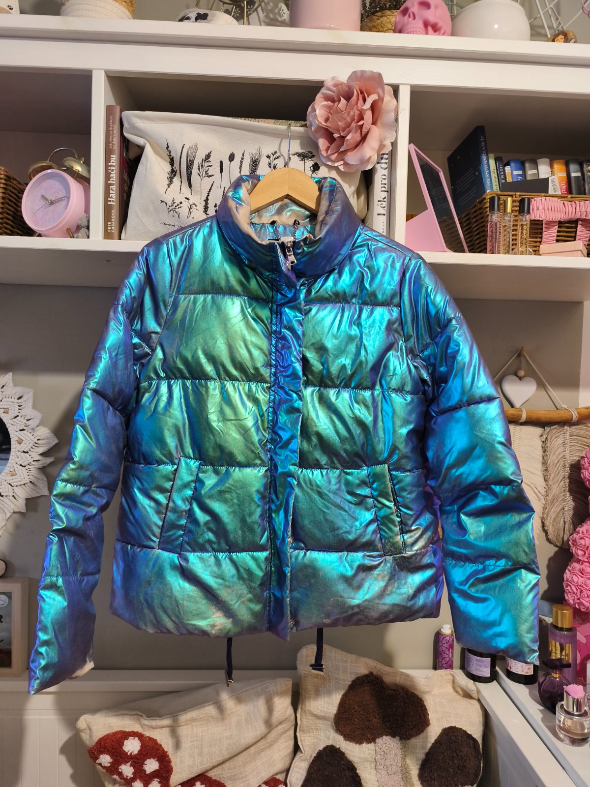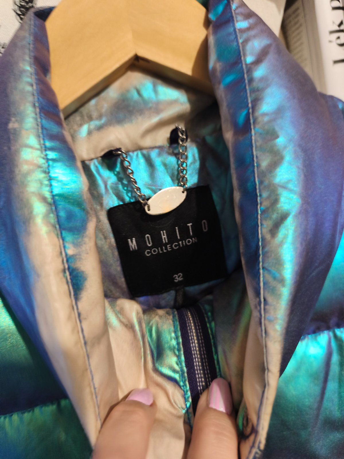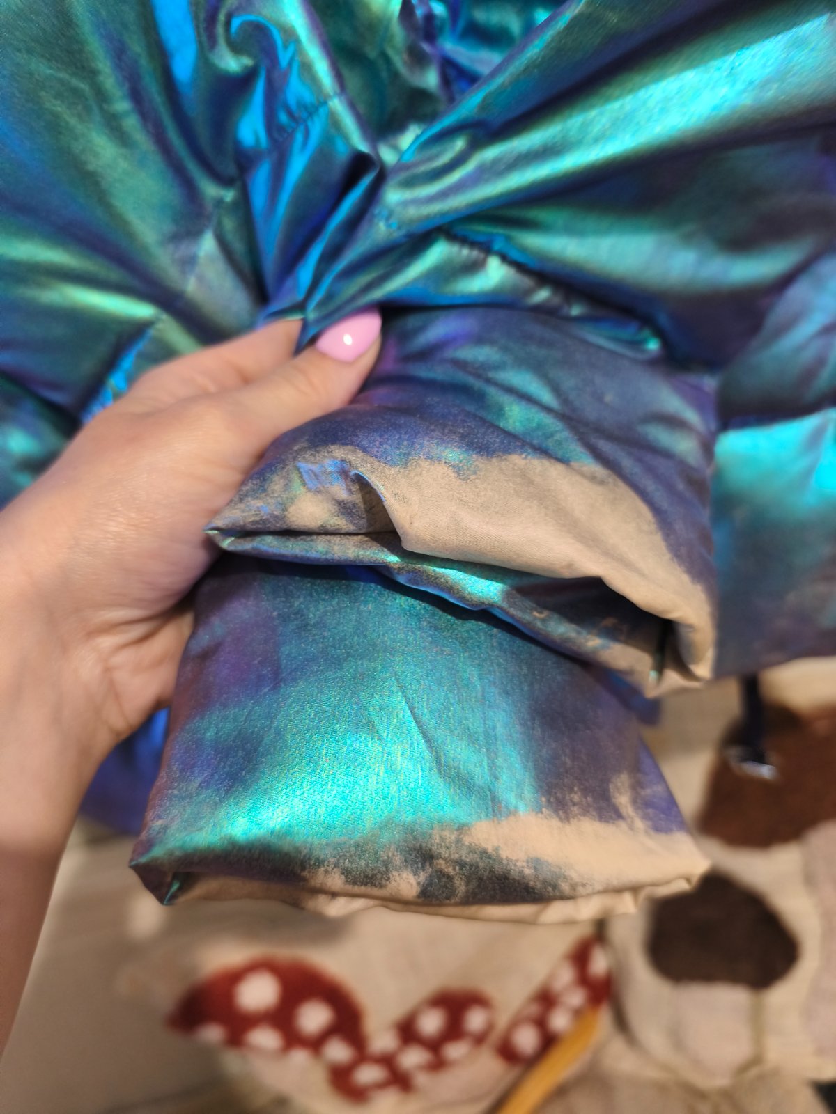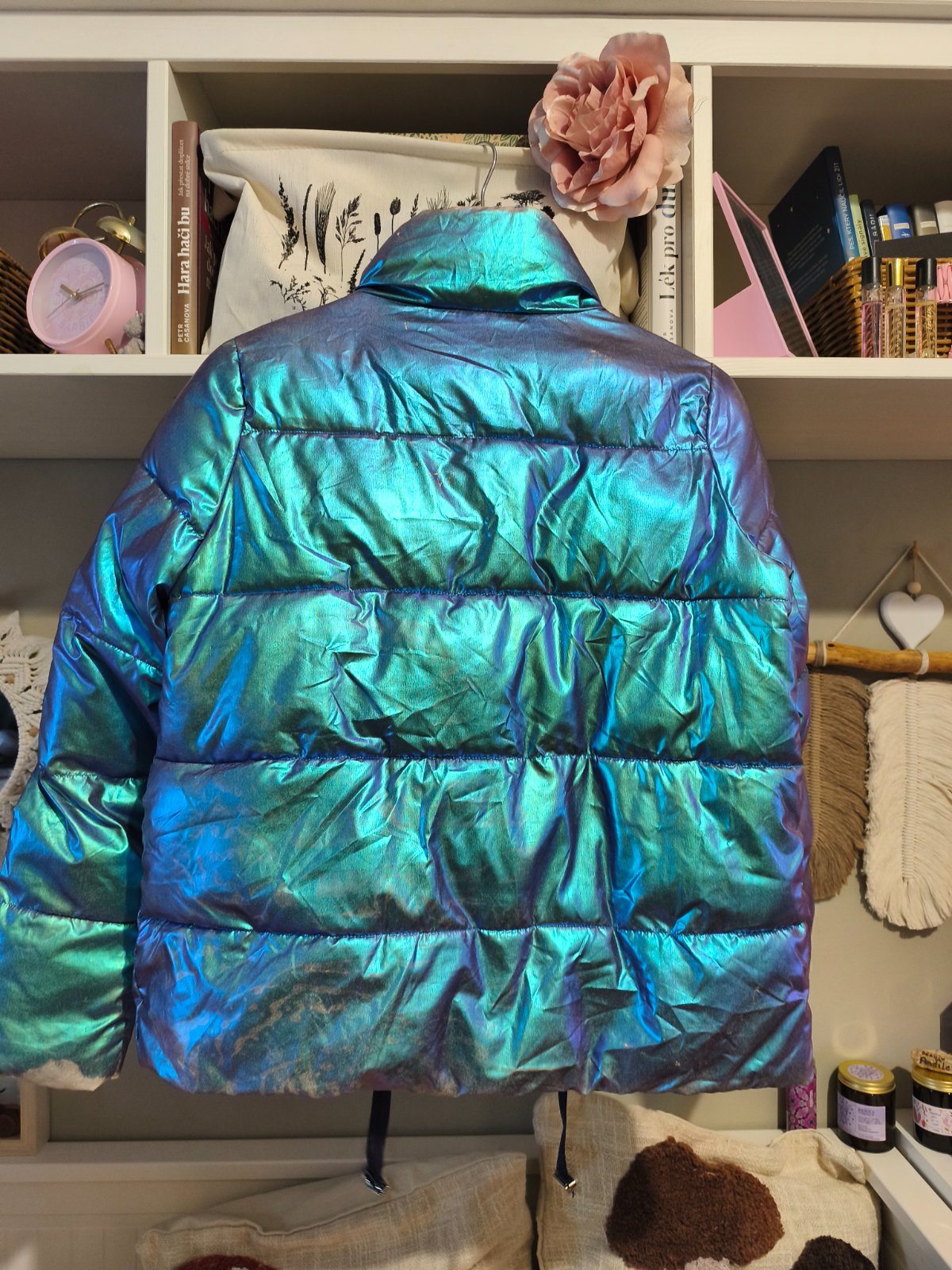 Holografická bunda Mohito 32, sedí i XS/S, na triko sedí i na M, odlesky modré a fialové, bohužel ošoupaná viz fotky, než vyhodím, zkouším nabídnout zde zdarma k objednávce nebo dle dohody...