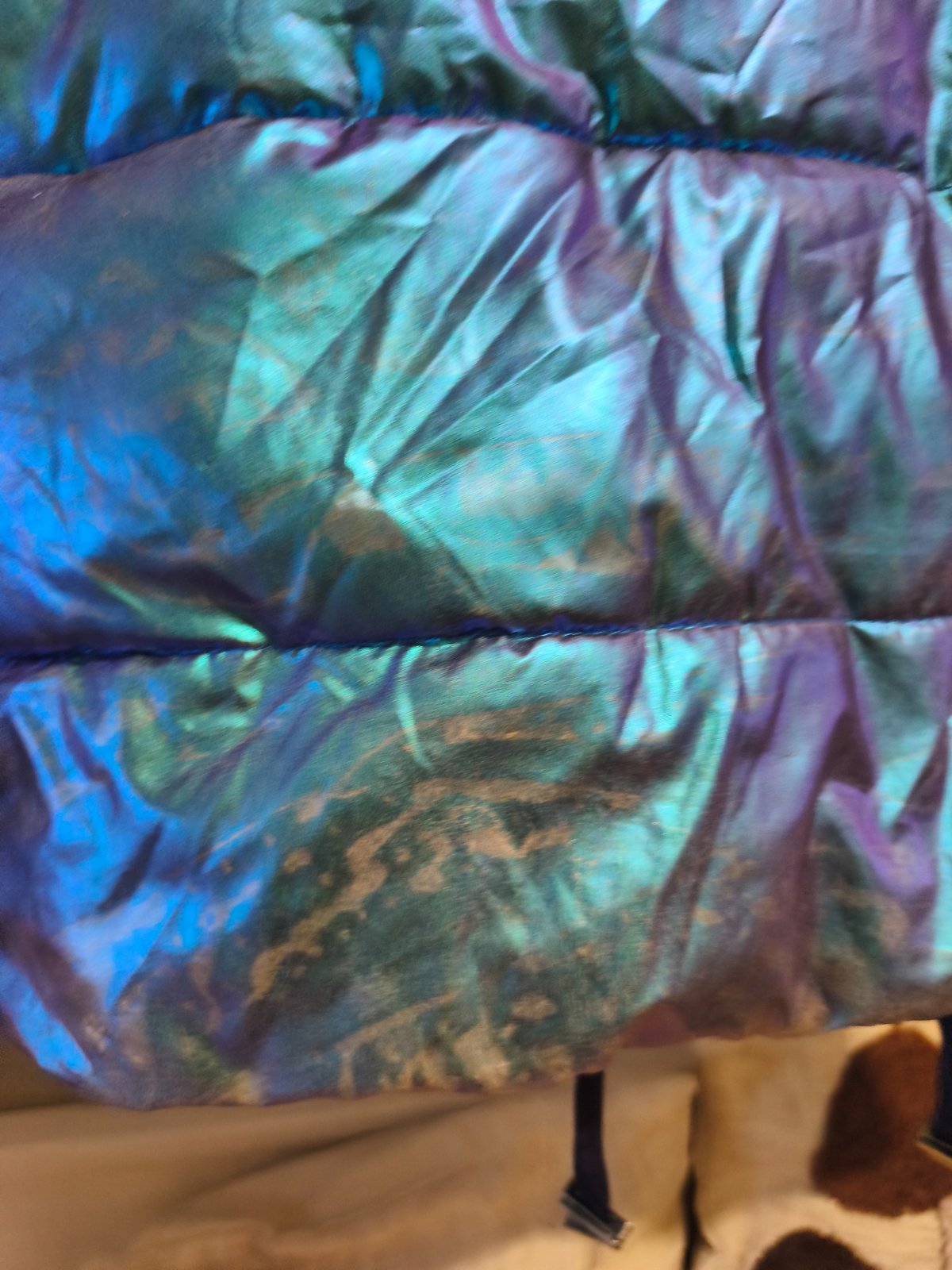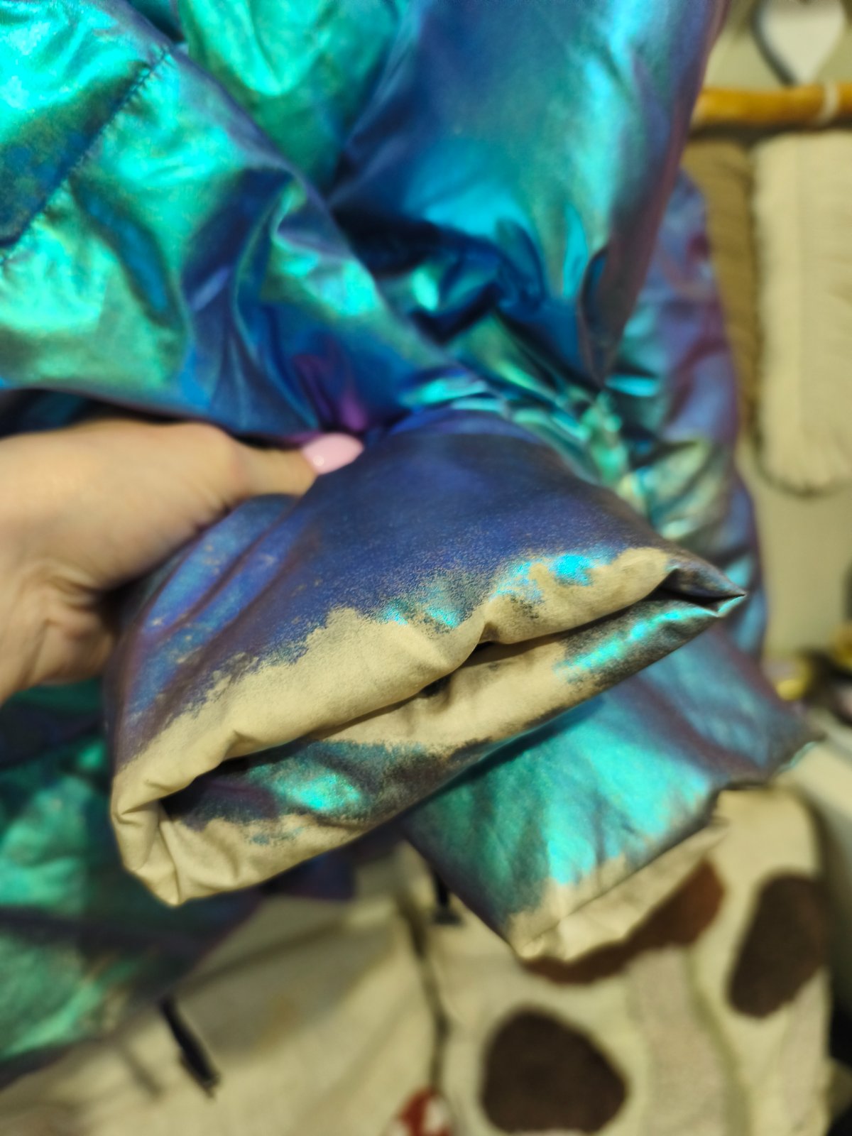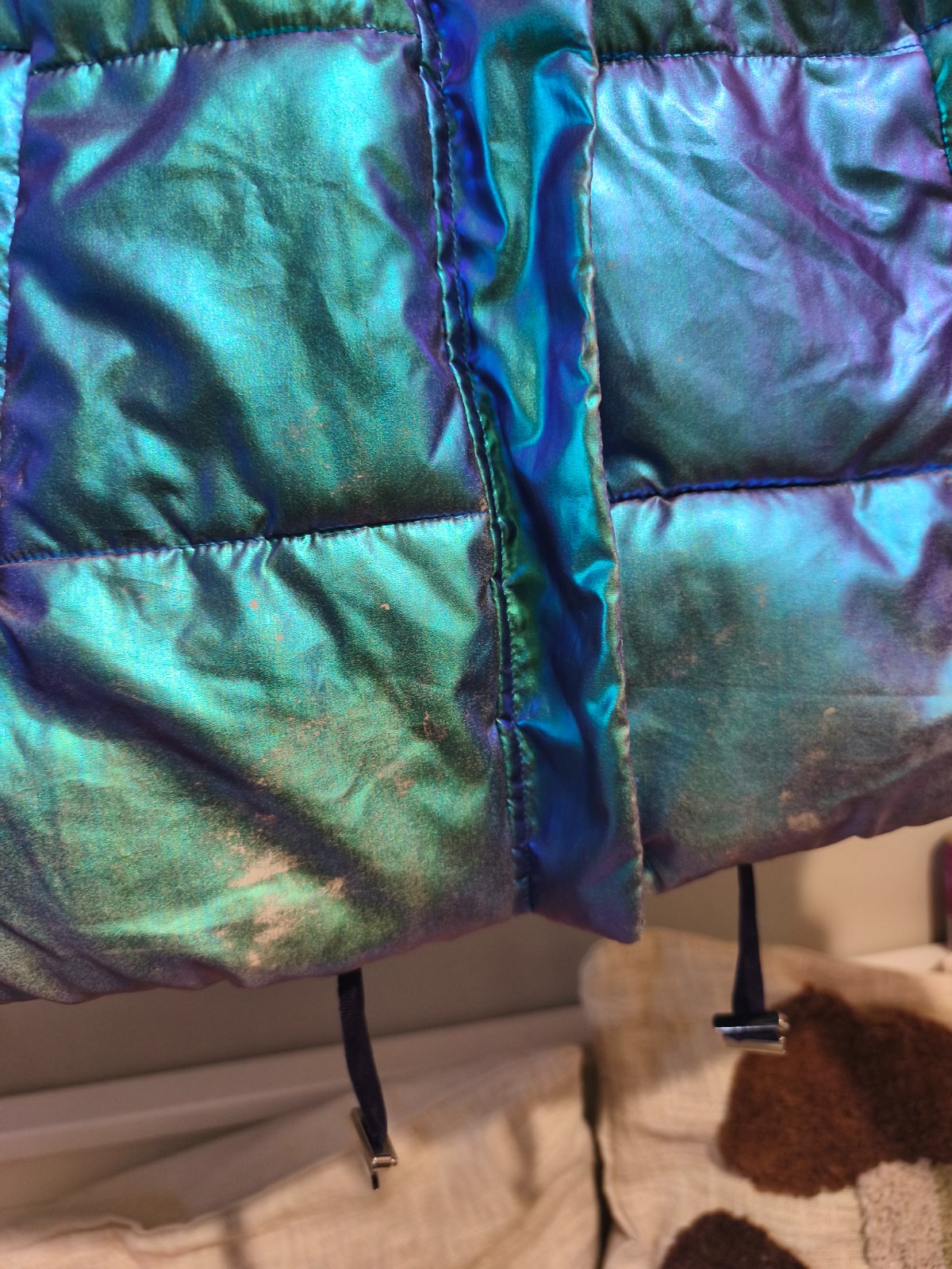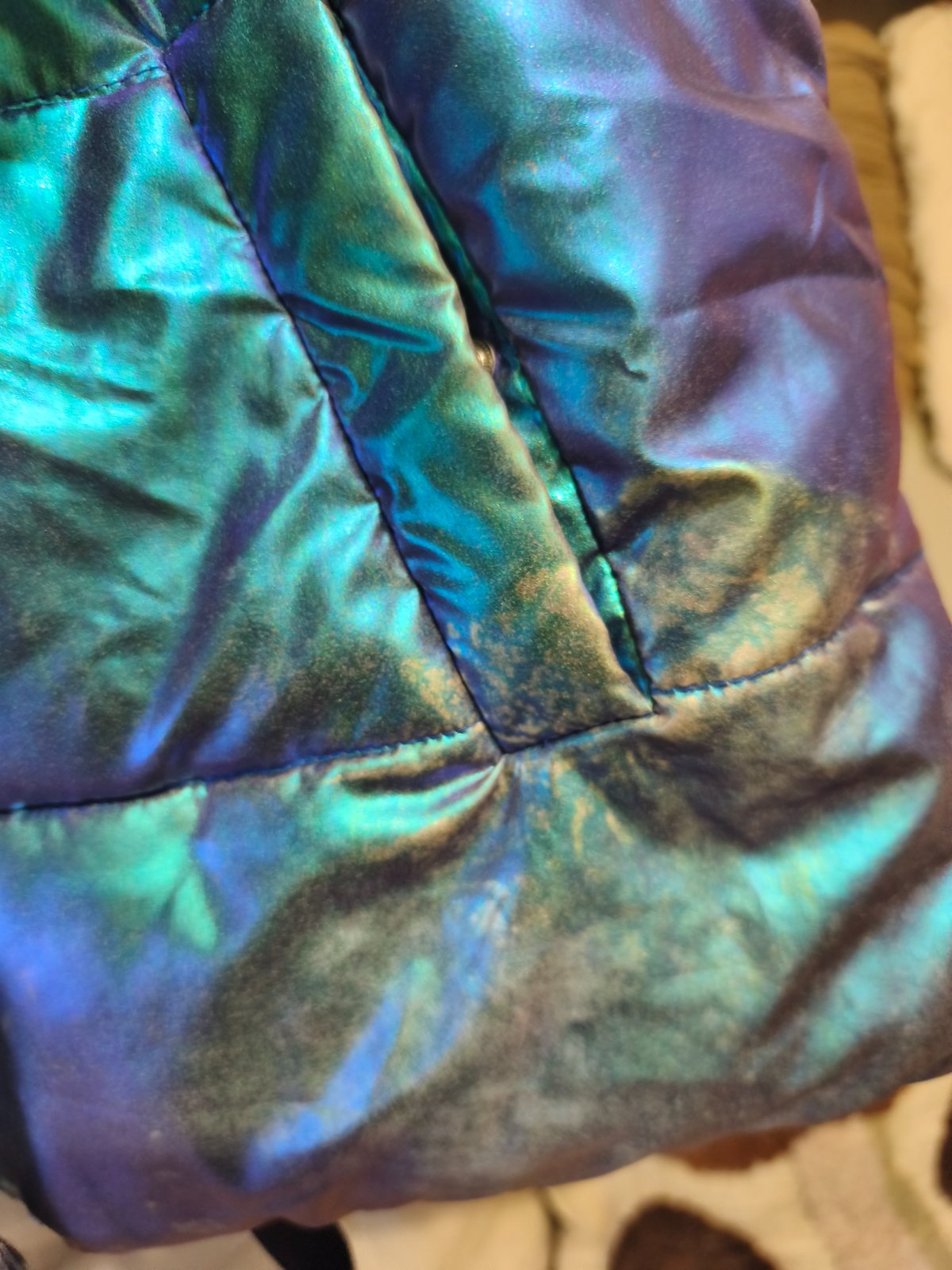 Holografická bunda Mohito 32, sedí i XS/S, na triko sedí i na M, odlesky modré a fialové, bohužel ošoupaná viz fotky, než vyhodím, zkouším nabídnout zde zdarma k objednávce nebo dle dohody...