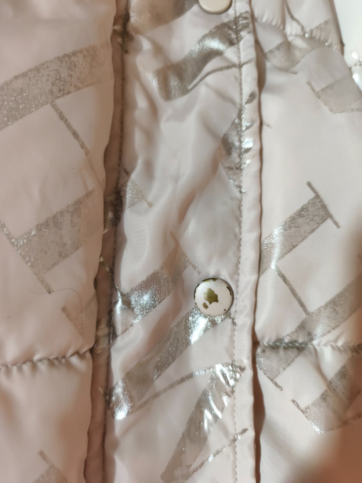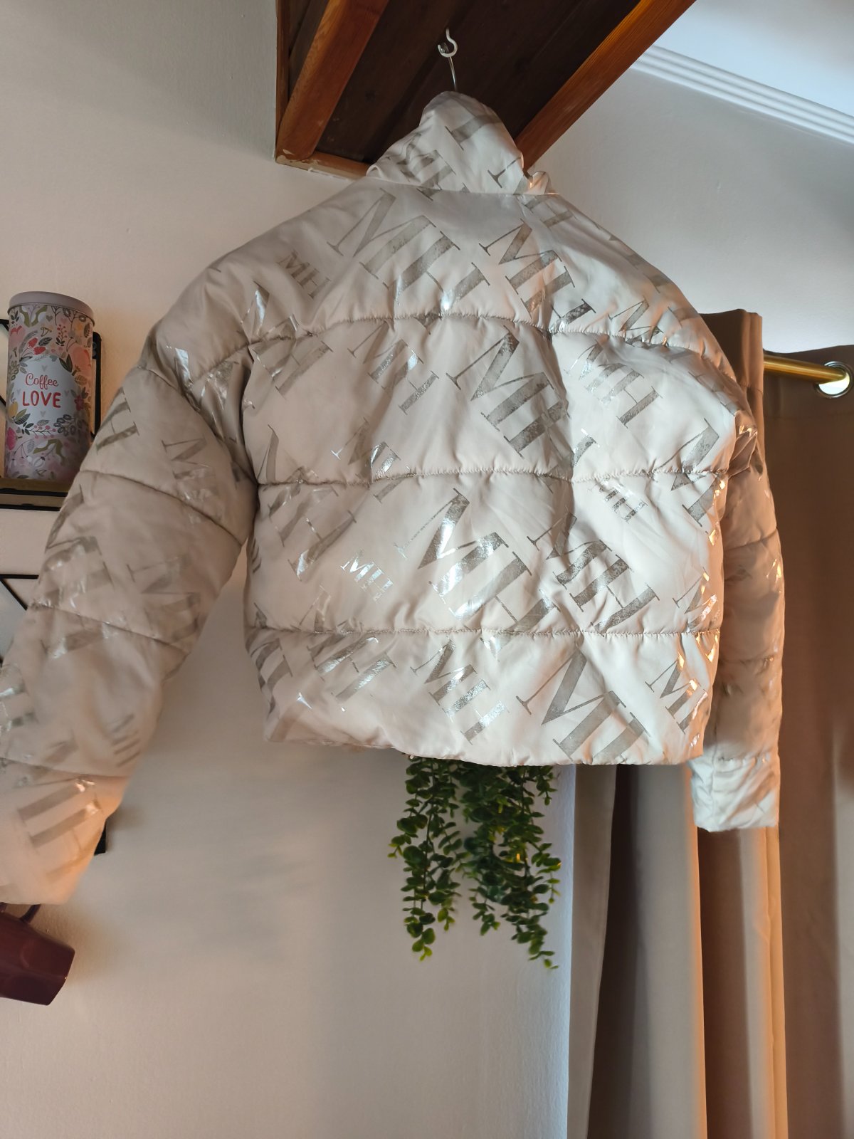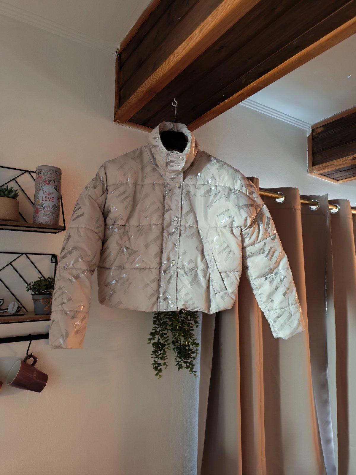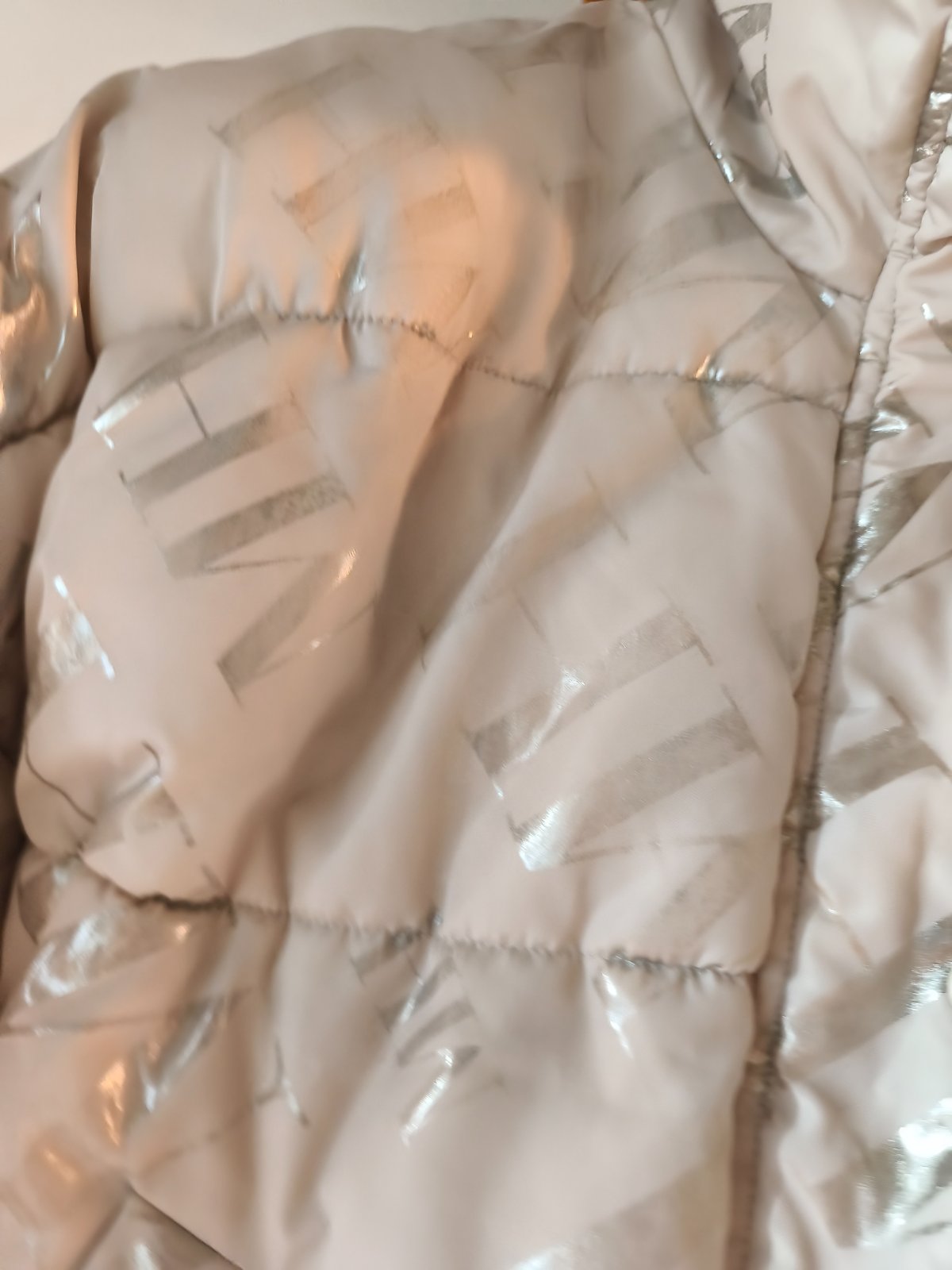 Nošená zimní bunda Mohito vel 32, oversize, nošená při XS/S, nerovnoměrná výplň a ošoupané stříbrné nápisy. Barva krémová. Cena symbolická.