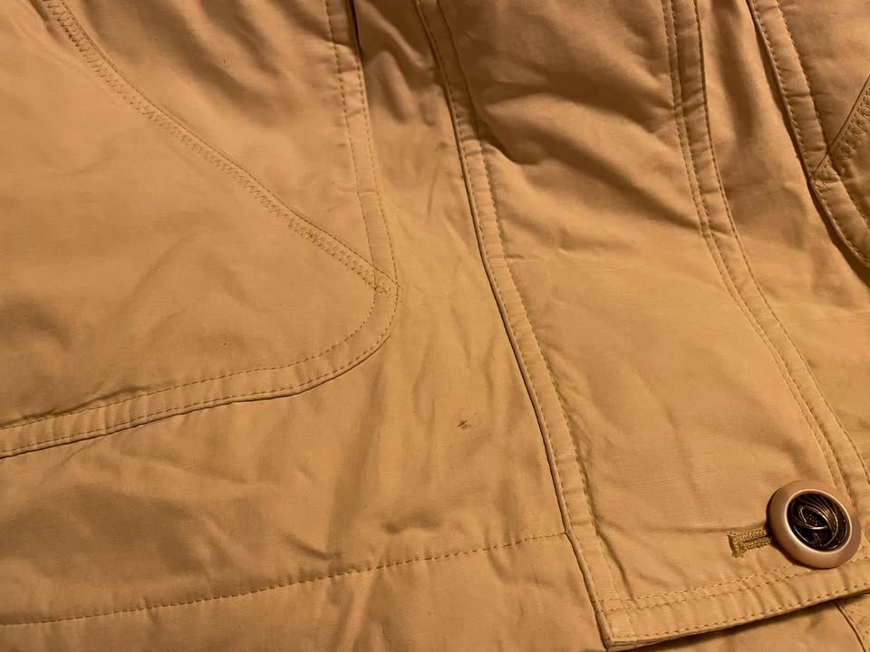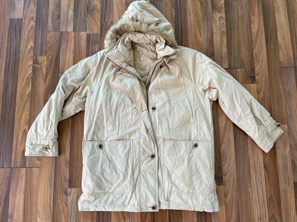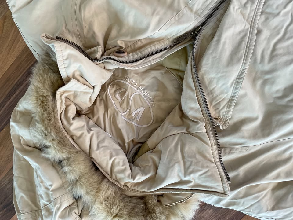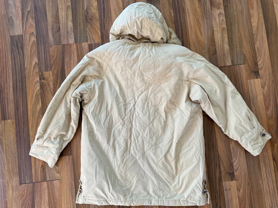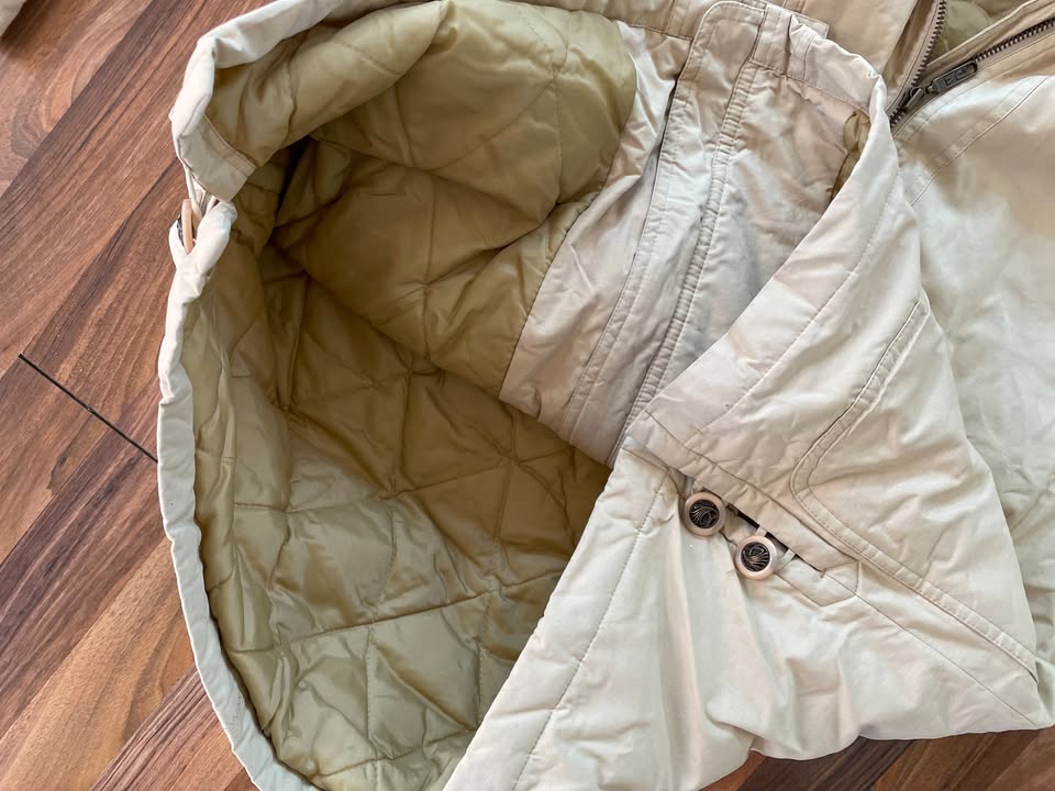 3471. nabízím k prodeji tuto nenošenou zateplenou bundu s odepínací kapucou a kožíškem, vel 36/tedy S, ale je hodně široká tedy i více, VD. Barva světlá béžová/teplejší krémová (na fotu je světlejší, ale není tak tmavá jak na detailu s ťupkou). Je prošitá vycpávkou, a i díky vrchnímu materiálu poměrně teplá. kapuci i kožíšek lze odepnouut - knoflíky. Materiál 48% bavlna,36% polyester, 16% polyamid. 100% polyester a 100% polyamide. Ramena vycpávky. Nenošená, ale u kapsy jsem našla malou ťupku (při nošení nic rušivého, je to malé a zaniká) tak jsem zkoušela vyprat ale asi chce odstraňovač nebo neřešit - je to malinké, jinak bez vad, krásná