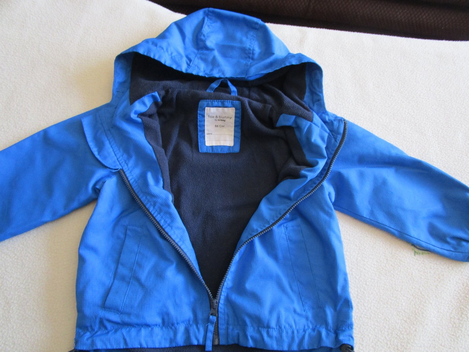Velmi pěkná modrá bundička s kapucí, slabší flaušová podšívka, vhodná na jaro či podzim,, zapínání na zip, ochrana brady, kapsy, vel. 86, jako nové, cena jen 69 Kč, Sinsay.