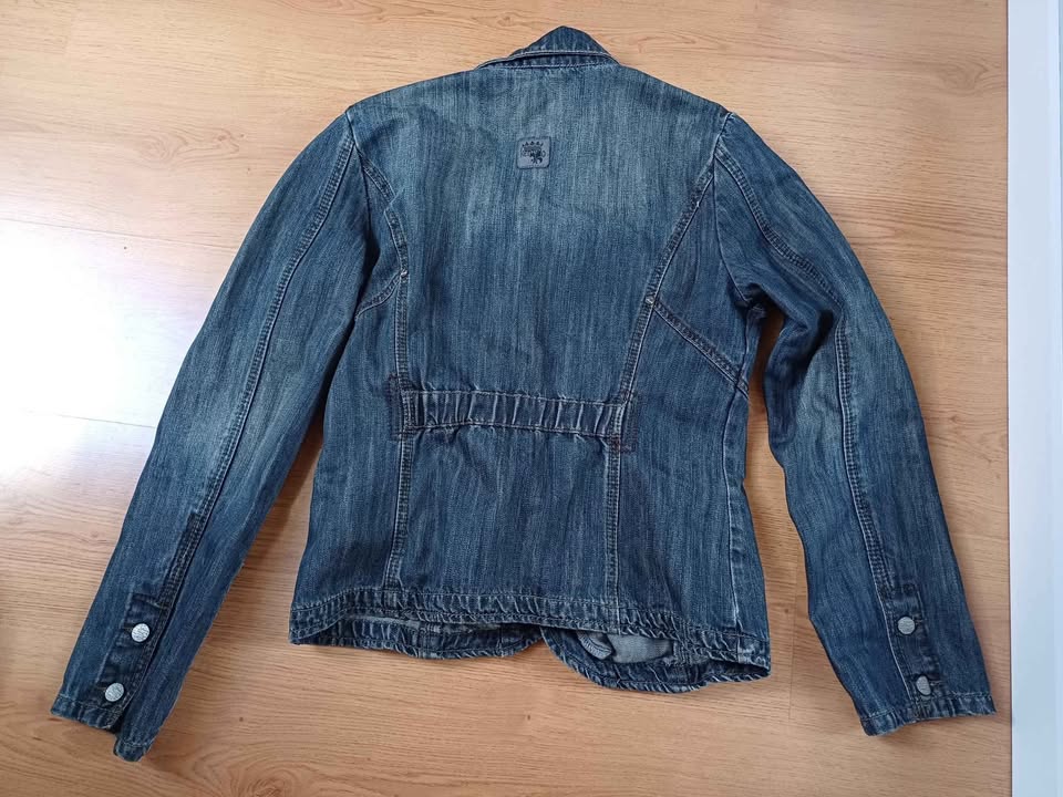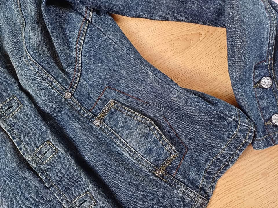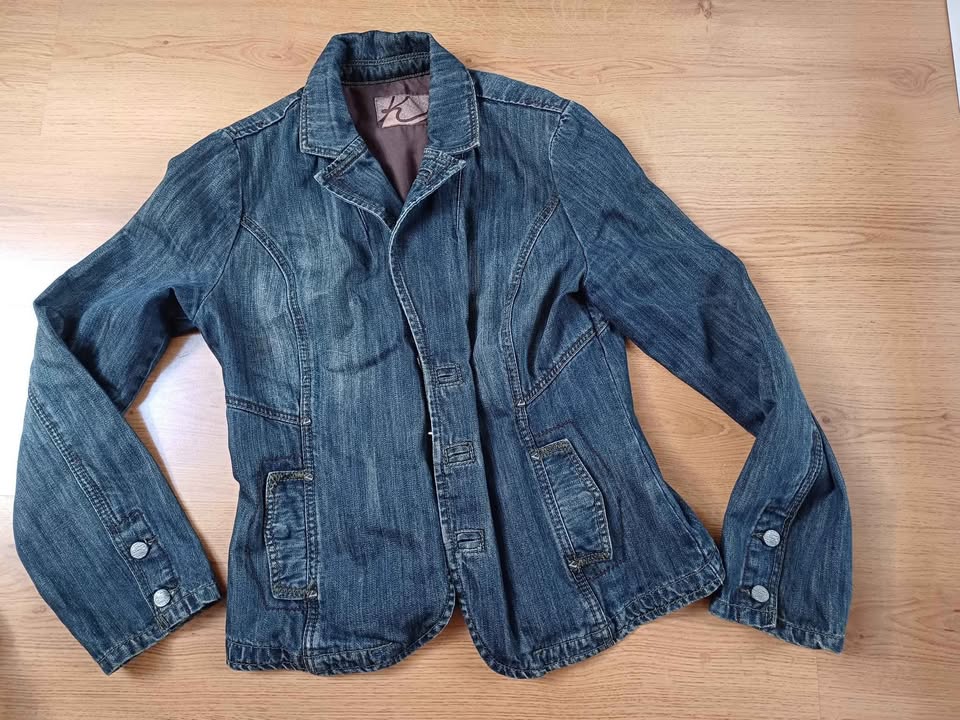 Moderní sako z džínoviny, vzadu vypasované gumičkou, bez vady, ale řekla bych, že odpovídám velikosti M, max L