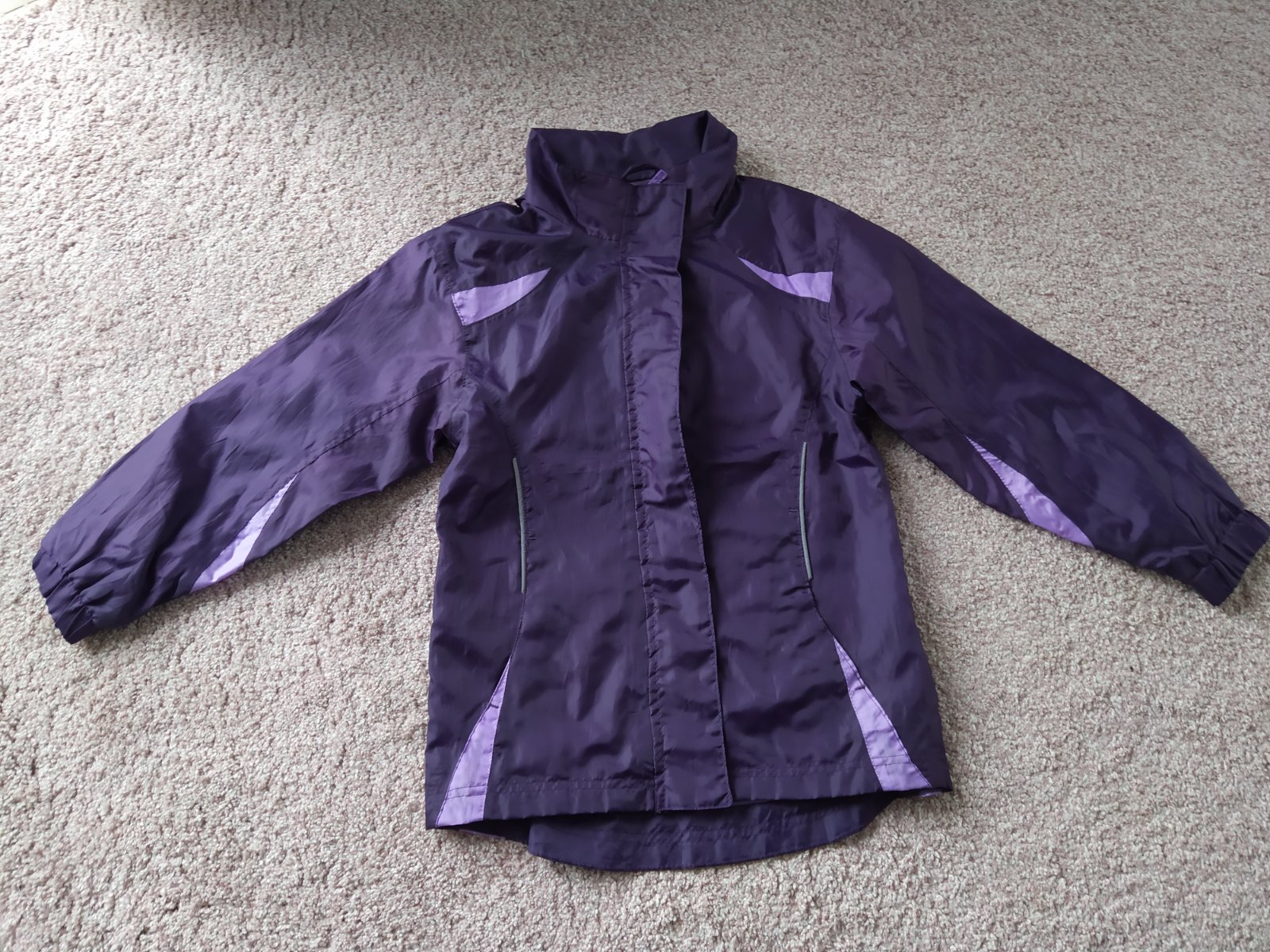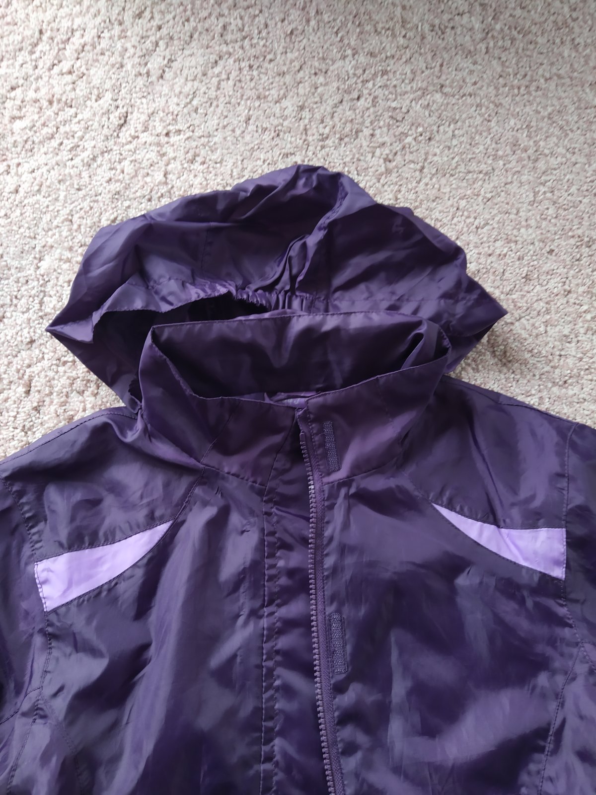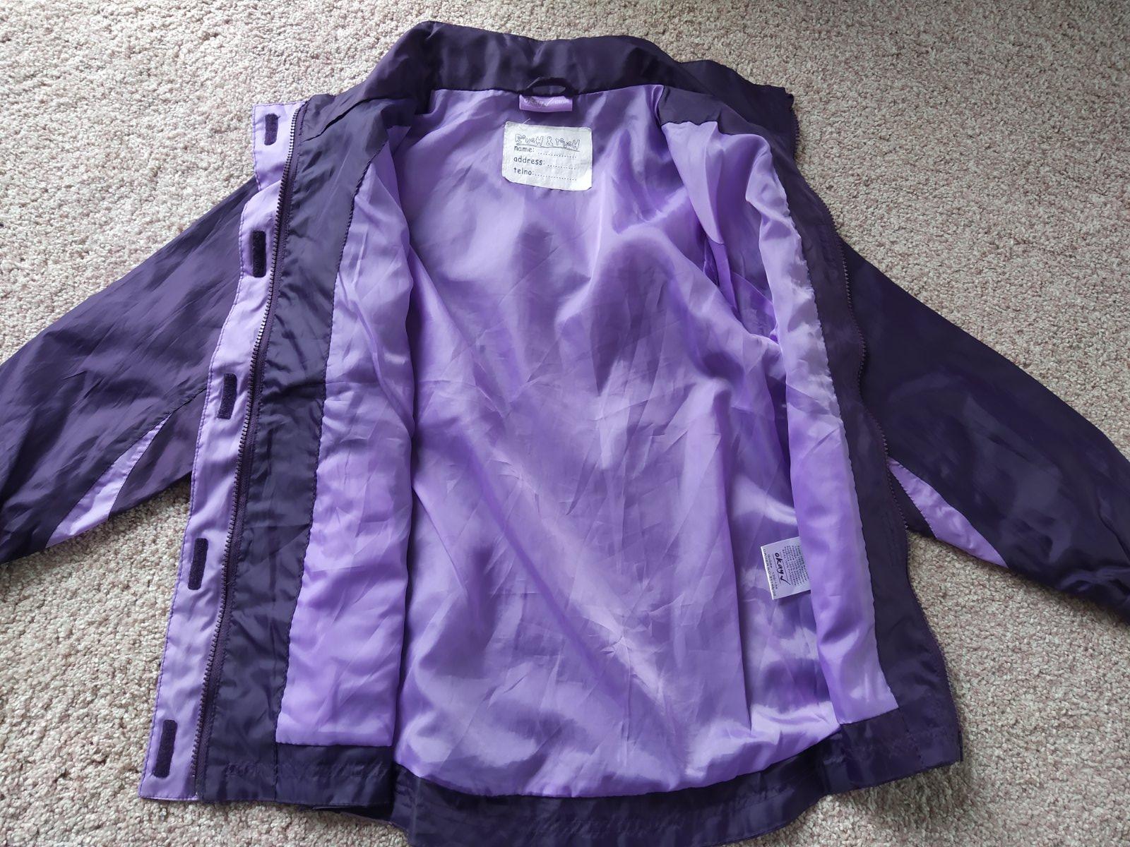 Fialová bunda v pěkném stavu,vel.128/134, kapuce je skrytá na zátylku.