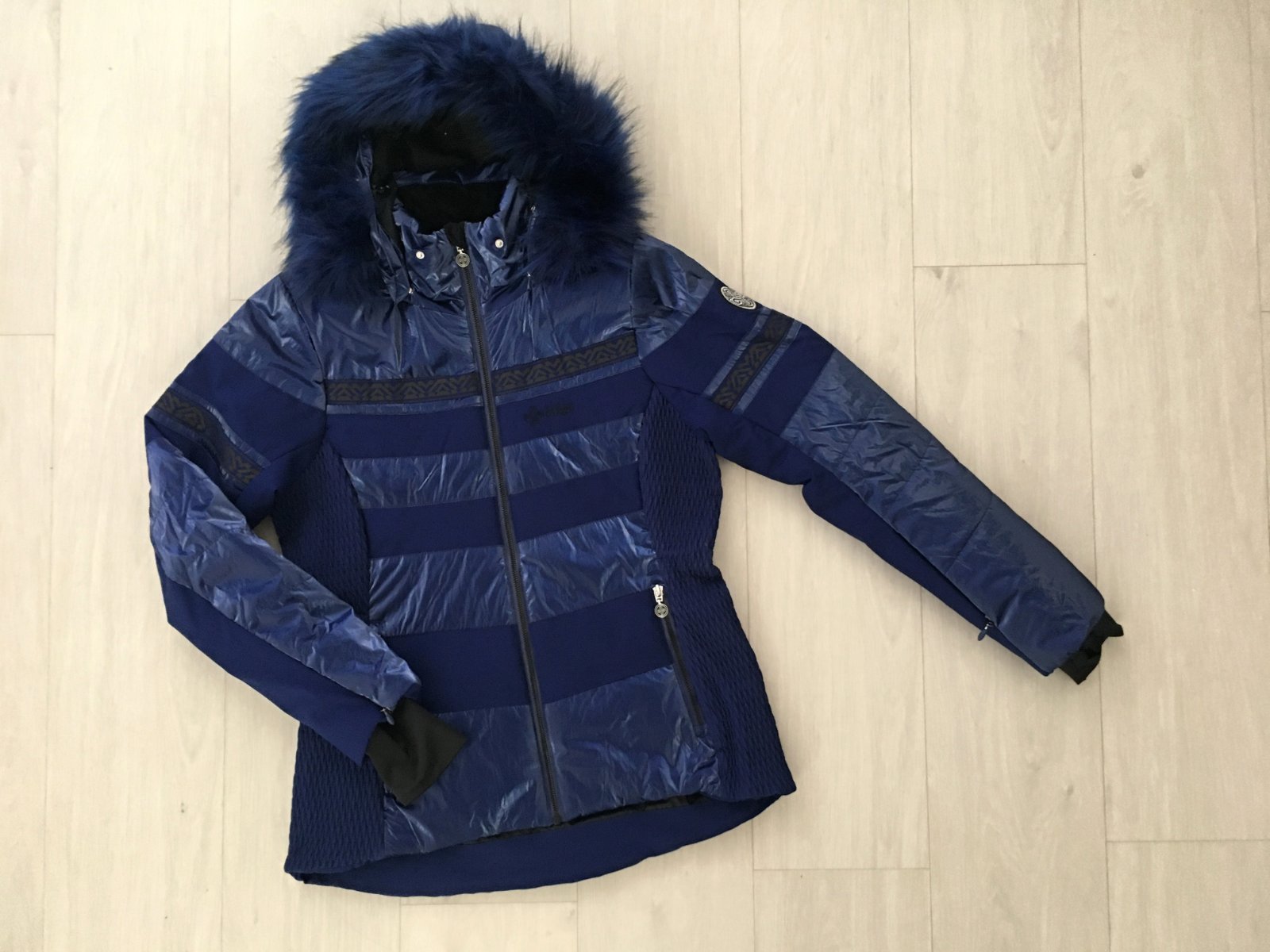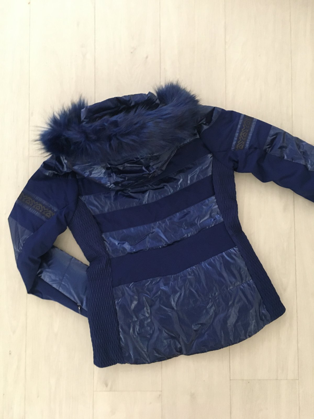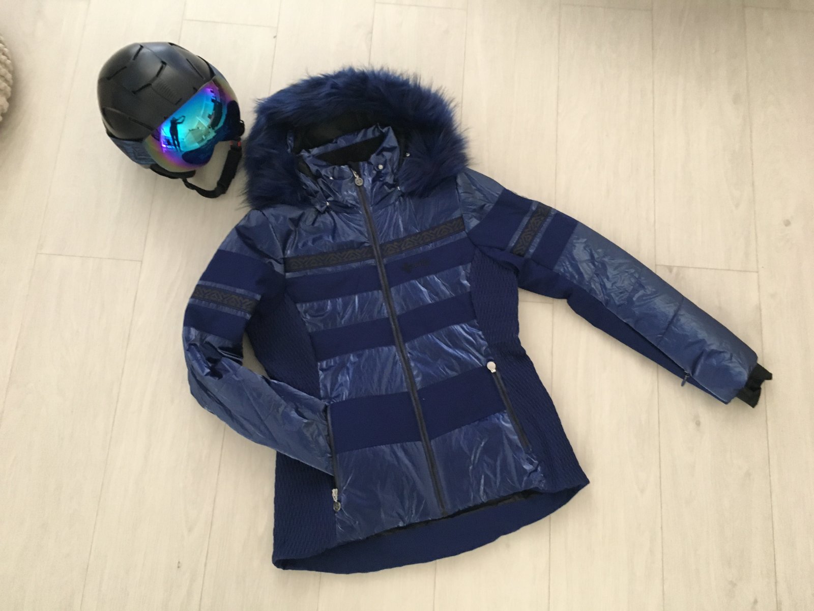 Rukávové sněhové manžety s otvory na palce, protisněhový límec, odepínací sněžný pás, vnitřní kapsa s hadříkem na čištění brýlí; nastavitelná a odnímatelná kapuce s umělou kožešinou; dvě zipové kapsy s metalickými zipy, rukávová kapsa na skipass;
