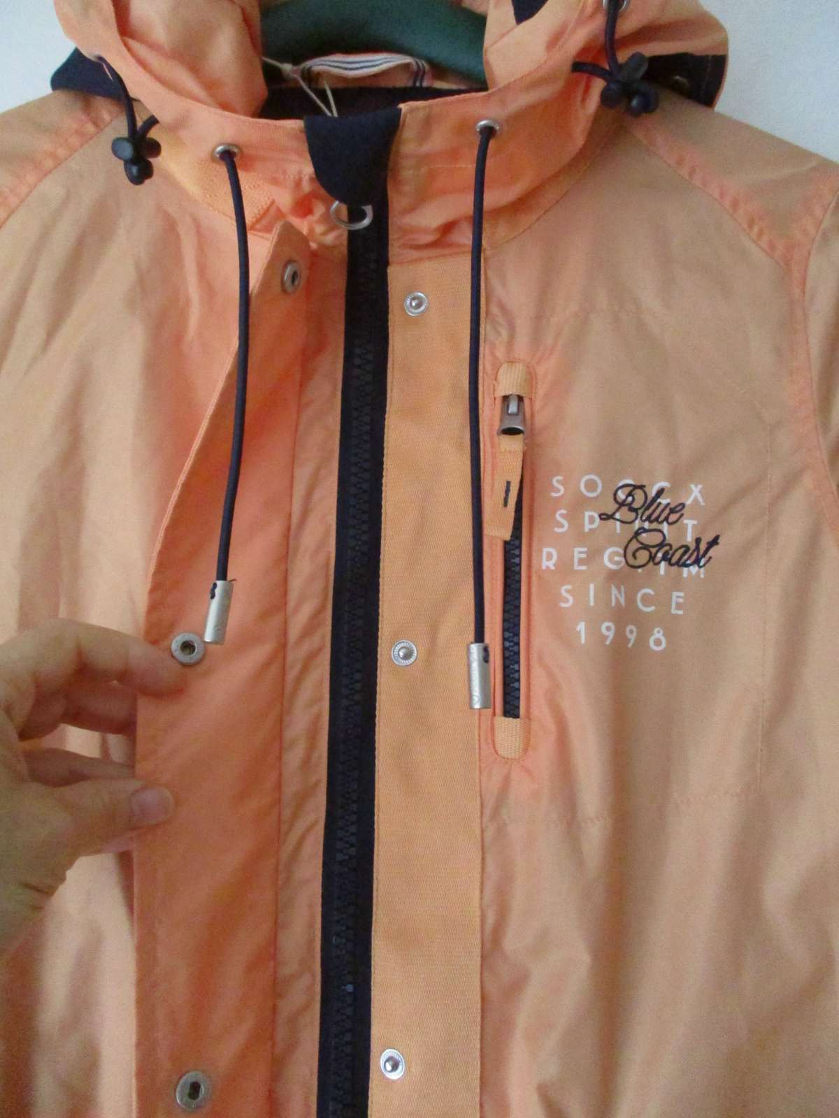Nabízím dámskou přechodovou parku zn. Soccx vel. M, nová, nenošená. Barva oranžová + tmavomodrá. Materiál pevný šusťák, zrubu síťovina. Kapuca napevno + olivky, kapsy, rukávy s regulací na suchý zip, v pase olivky na utáhnutí. Rozměry: mezi podpažími 51 cm, pas volně cca 47 cm, boky/spodní okraj bundy 55 cm, délka 69 cm, rukáv od kapuce 73 cm.