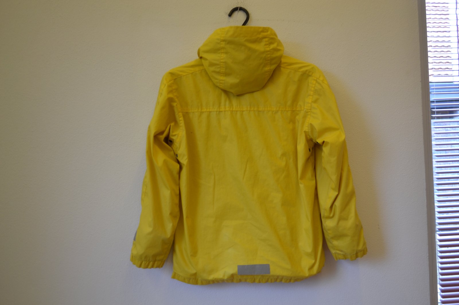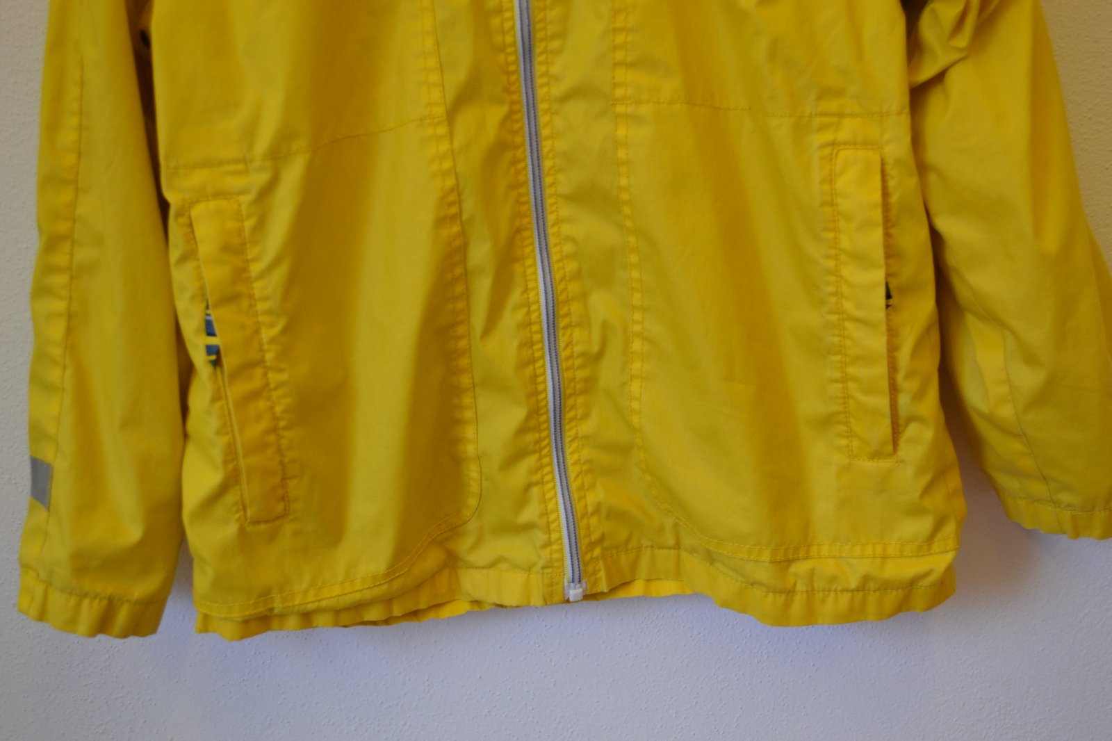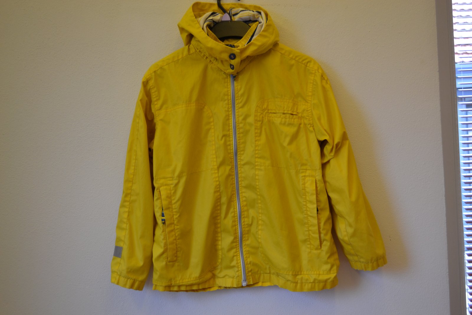 Nabízím nošenou bundu zn. H&M vel.140. Délka 57 cm, šířka v průramcích 2 x 50 cm, rukávek od krku 63 cm - uvnitř náplet. Bavlněná podšívka. Odepínací kapuce. Voděodolná úprava. Na předním a zadním díle skvrnky - viz. foto. Na tábor nebo do přírody ještě super. Unisex.