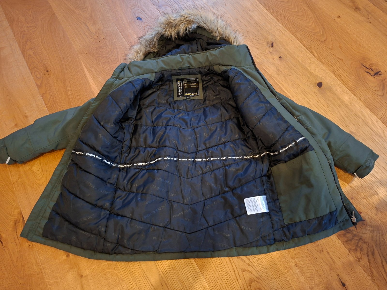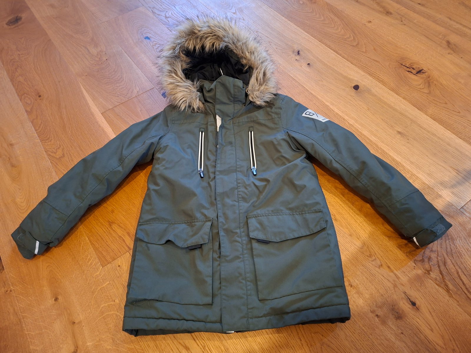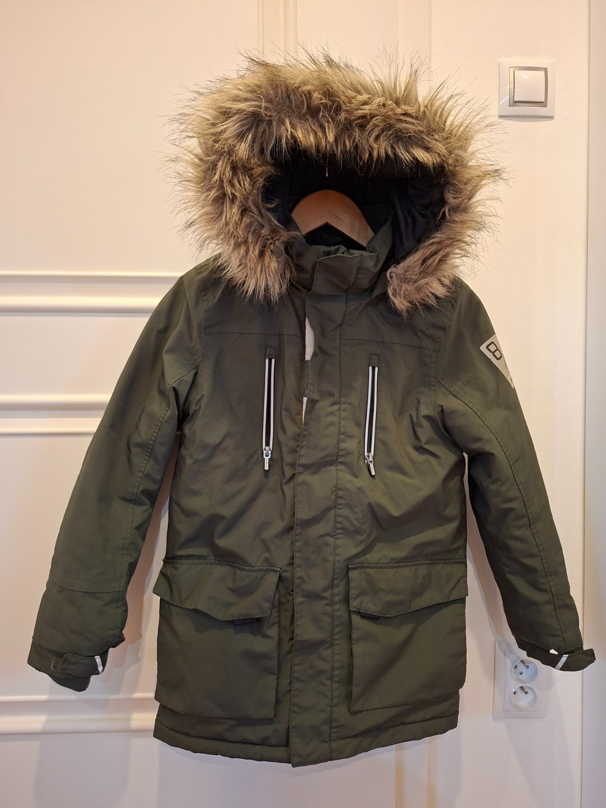 Větrotěsná a vodotěsná nepromokavá bunda z prodyšného materiálu s výplní. Kapuce s odnímatelným lemem z umělé kožešiny, reflexní prvky, dvě kapsy na zip a dvě kapsy s klopami. Konce rukávů se záložkami na suchý zip a všitými žebrovanými náplety a hladká vnitřní podšívka.