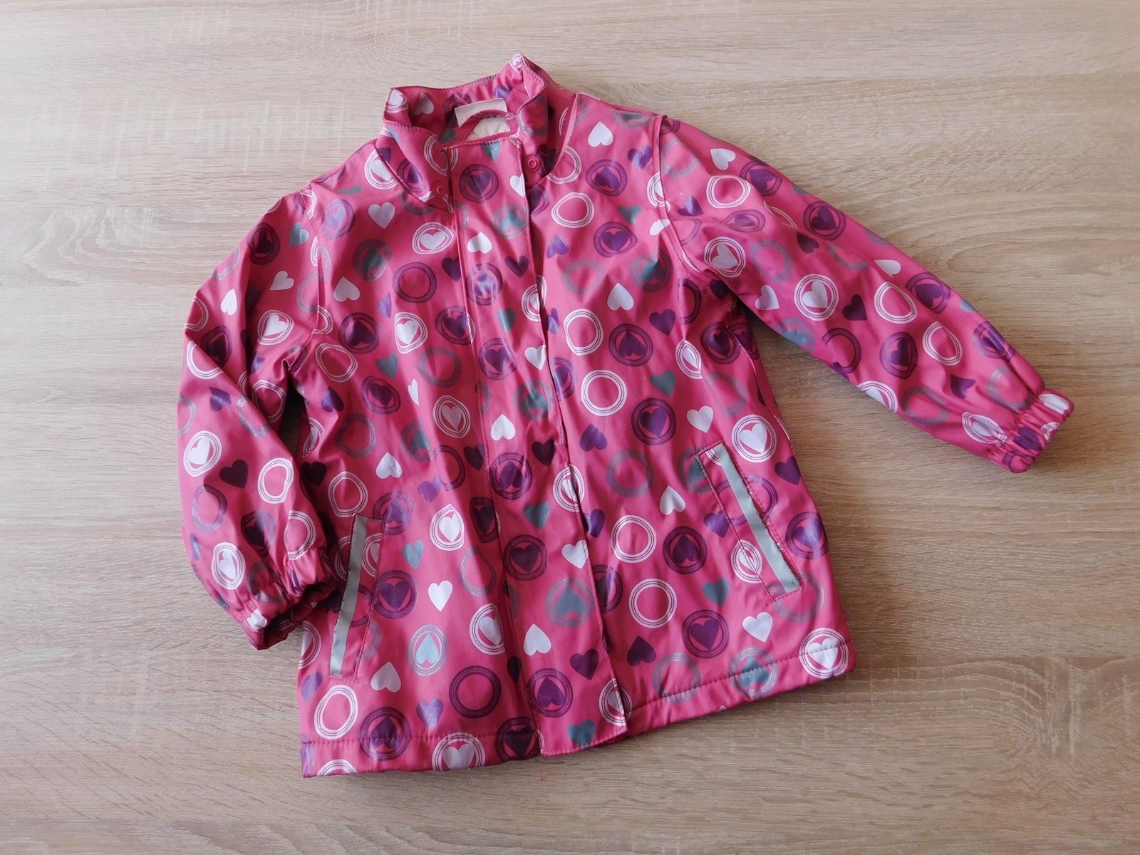 srdíčkový vzor,zateplená flísovou podšívkou,bez kapucky,zapínání na zip,reflexní prvky ,d.42cm,š.35cm,ruk.od krku 39cm. Na některých místech(viz.foto) se loupe svrchní pogumování.Na ven nebo do školky