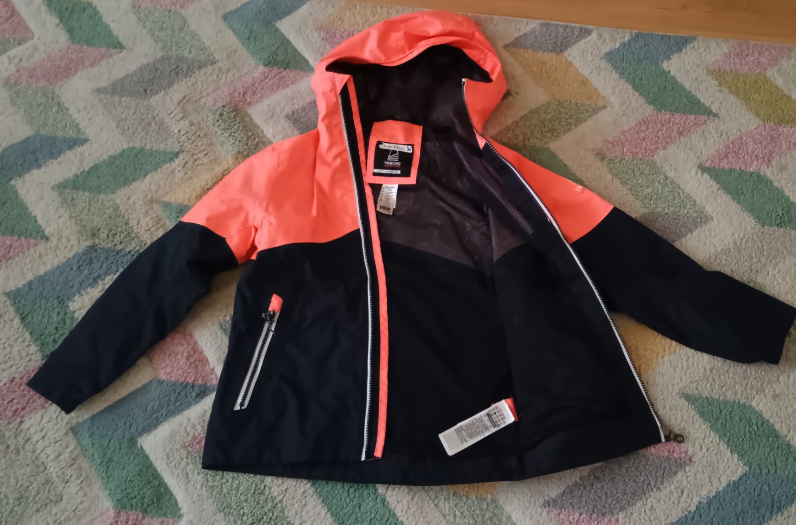 Krásná, kupovaná na hory, minimálně oblečená jedním dítětem, vodě a větru odolná lyžařská bunda na zip, krytka proti poškrábání, kapuce napevno zapínání do kukly, u krku stoják, vodní sloupec a par...