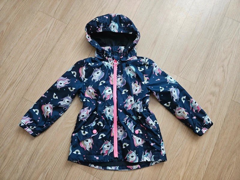 Bunda z H&M, vhodná na jaro/podzim, má podšívku, kapuca se dá odepnout, velikost 98, ale vydrží déle, dcera nosila i při velikosti 104, v pase se dá stáhnout, dole na jednom místě odřená, na 2 místech pak kaz, vytržená nitka ale nikde se nepáře nebo není díra, nošená ale ještě poslouží, krásný potisk