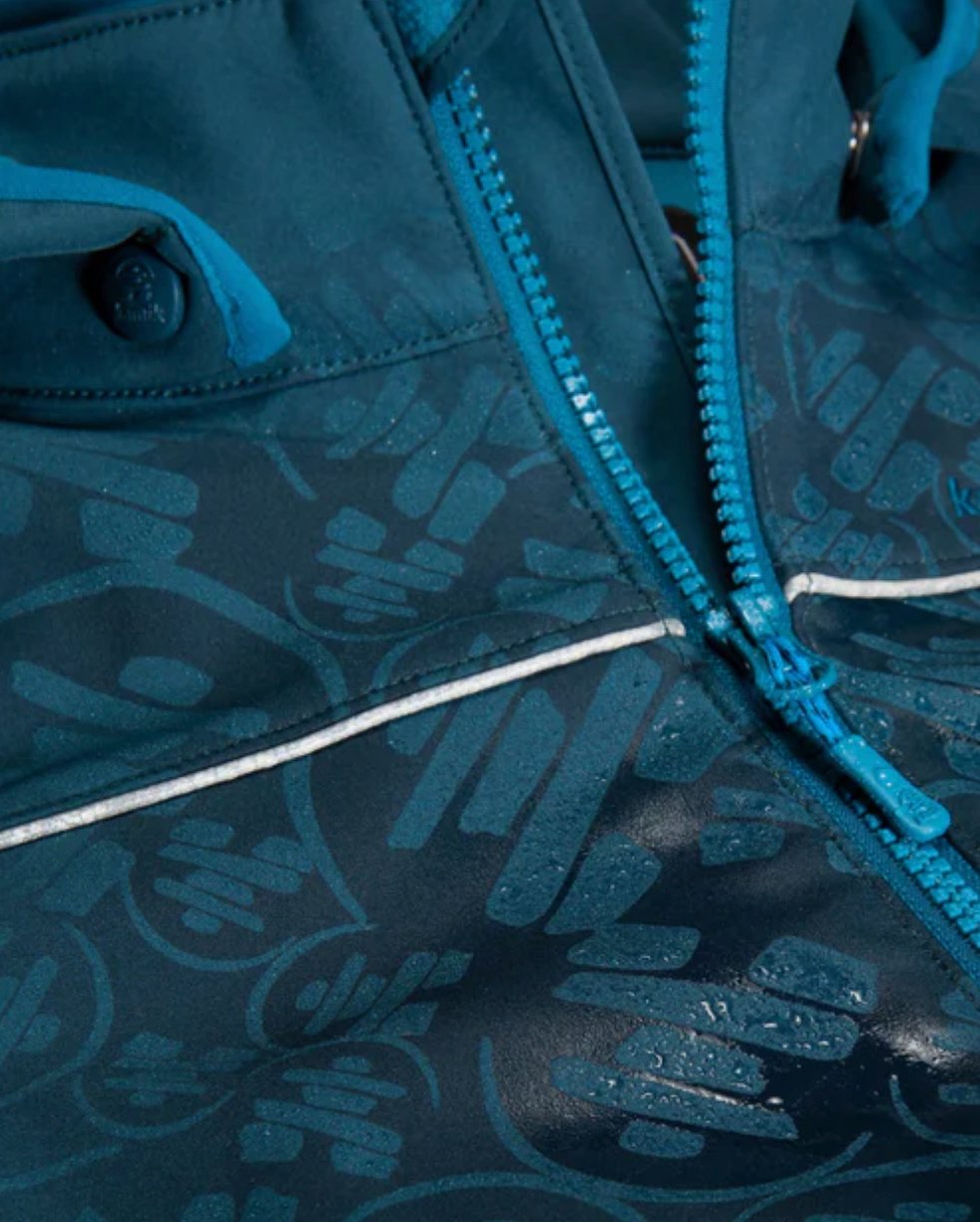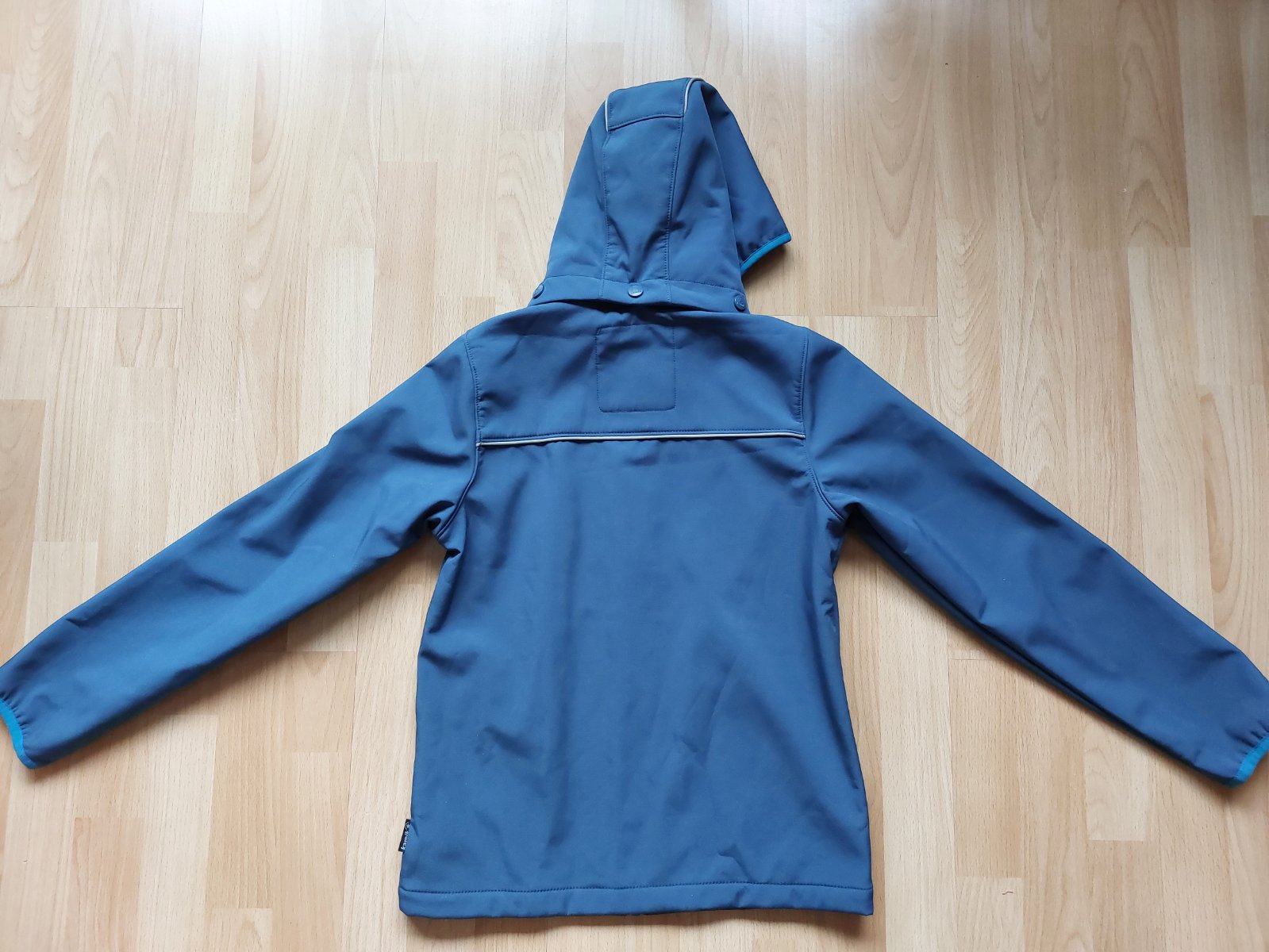Krásná softshellová bunda, syn měl asi 2x, zajímavost: při dešti se barva bundy na povrchu změní, resp. objeví se obrázek s ornamenty viz foto. Zajímavá barva.