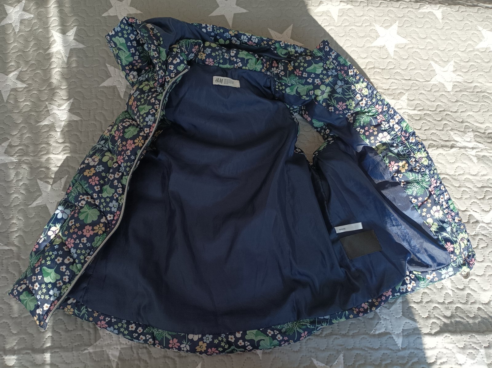 Pěkná vesta s kytičkami, vel. 122/128, 2 malé kapsy, odepínací kapuce
