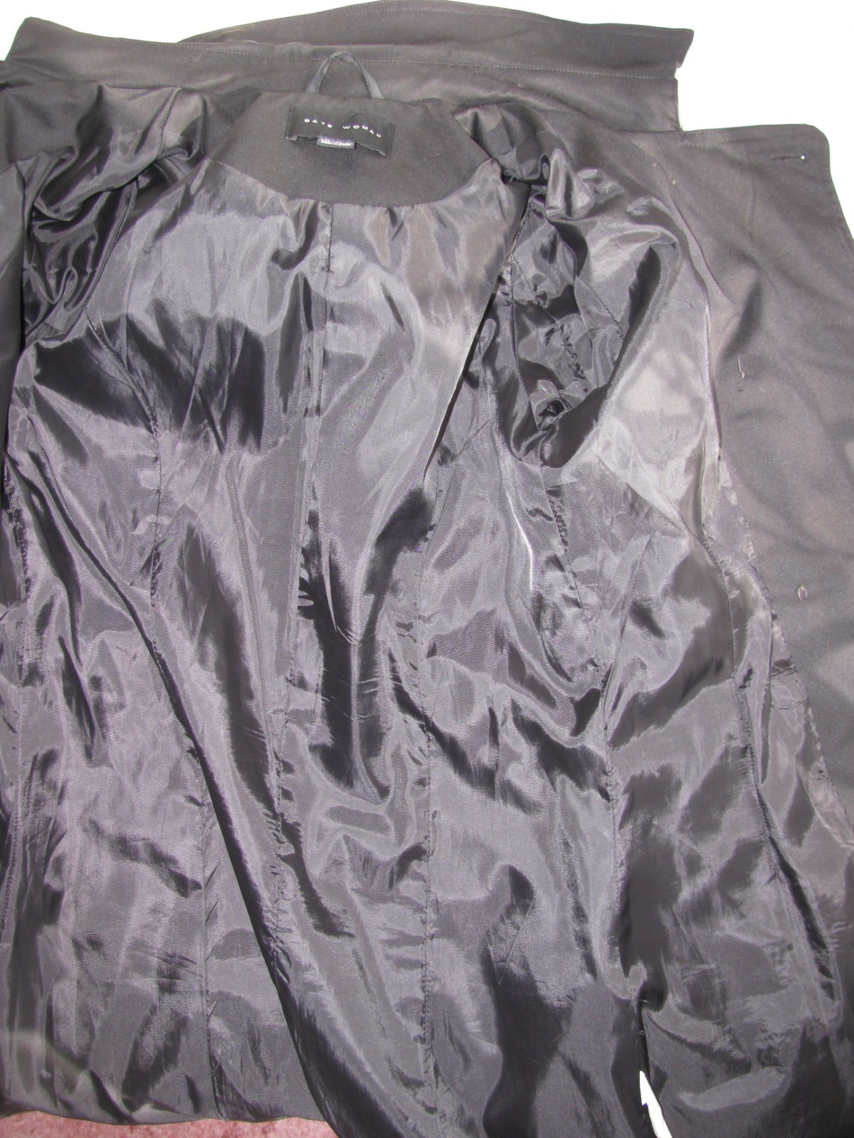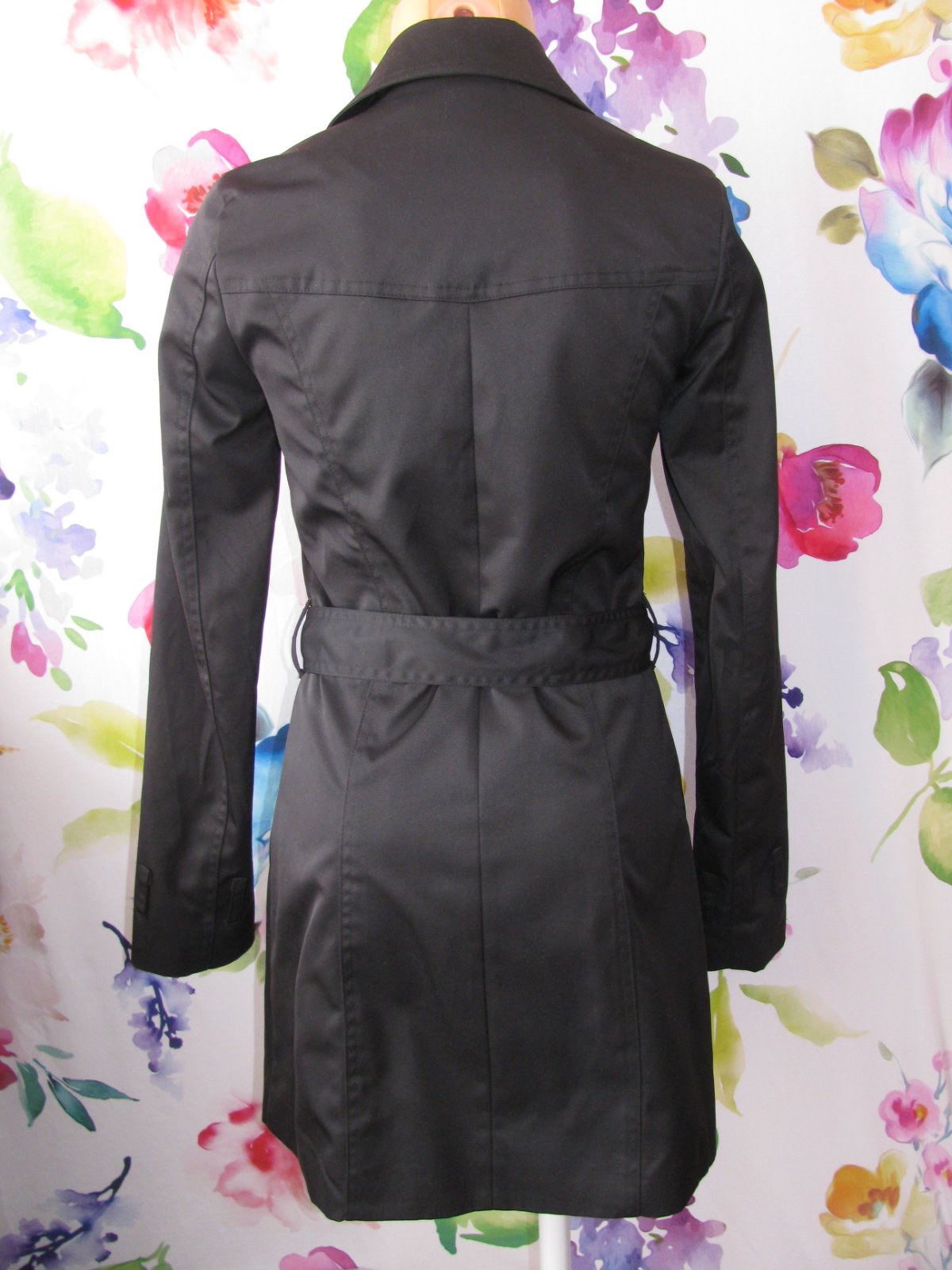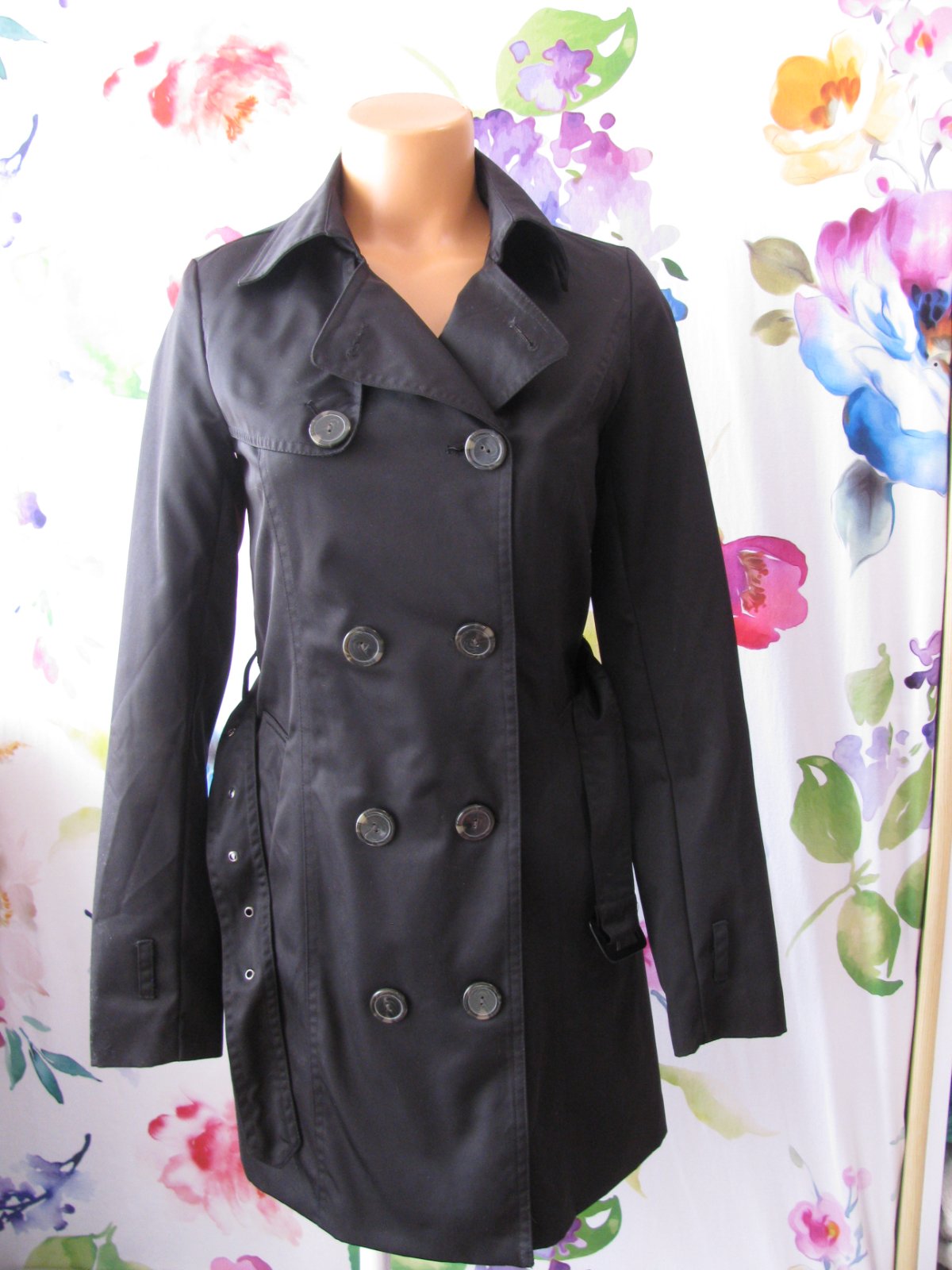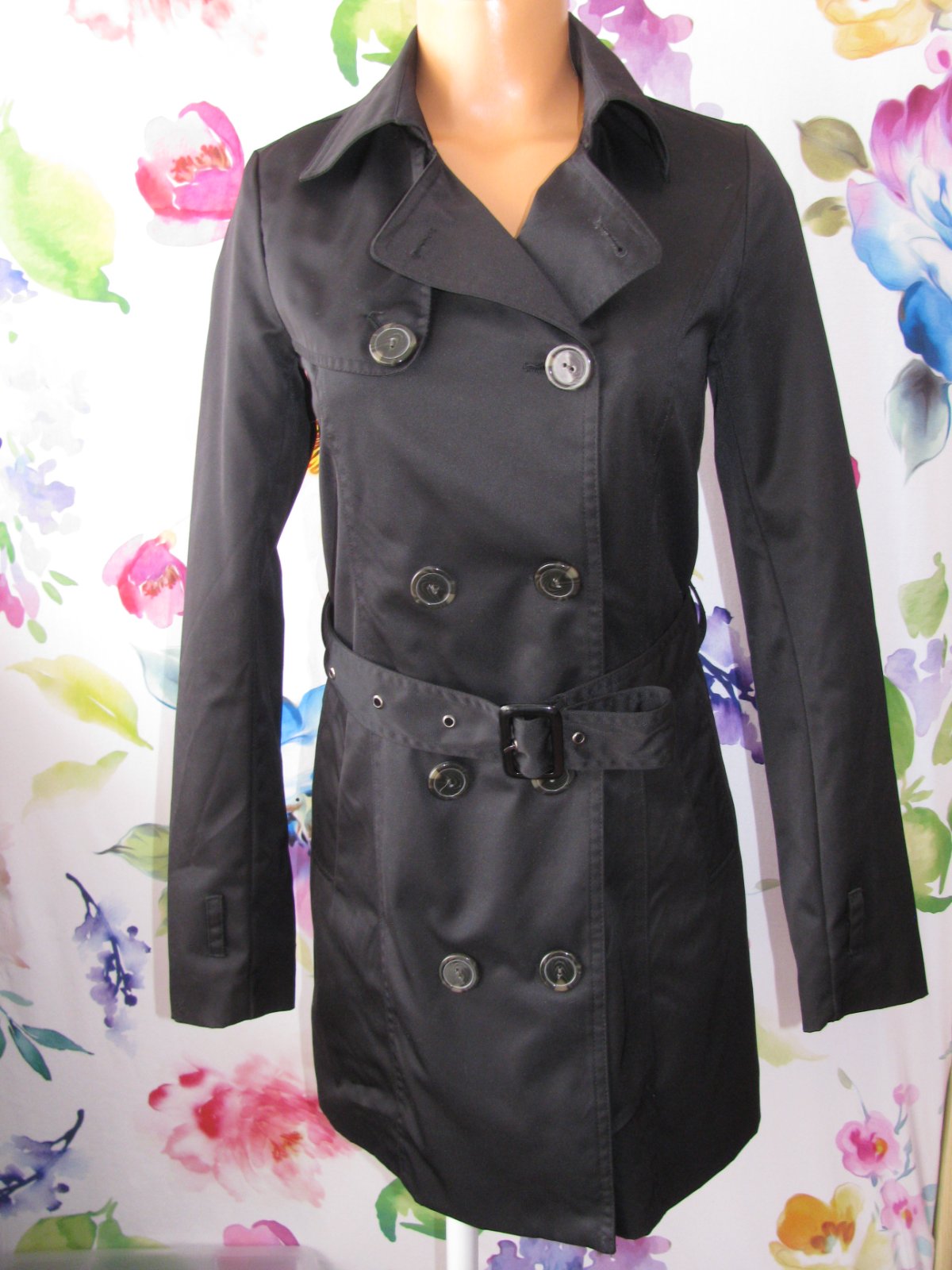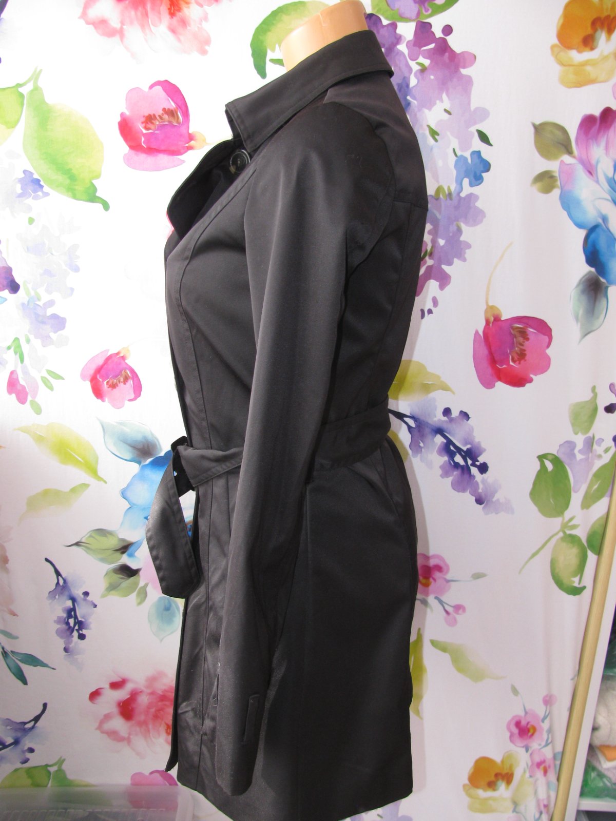 Luxusní černý dámský jarní kabát, s podšívkou, opasek - není nutno nosit, zap. na knoflíky, boční kapsy, 100% polyester. Top stav bez vady, málo nošený, velmi šetřený.