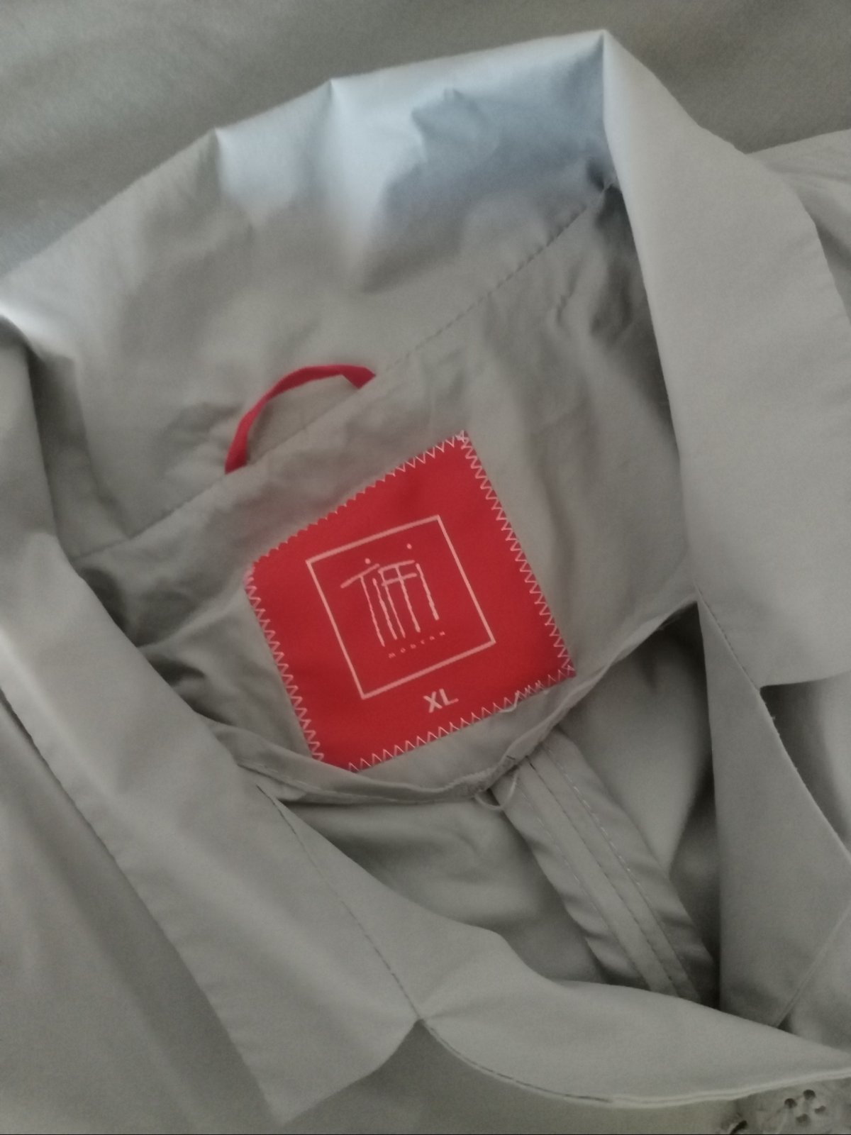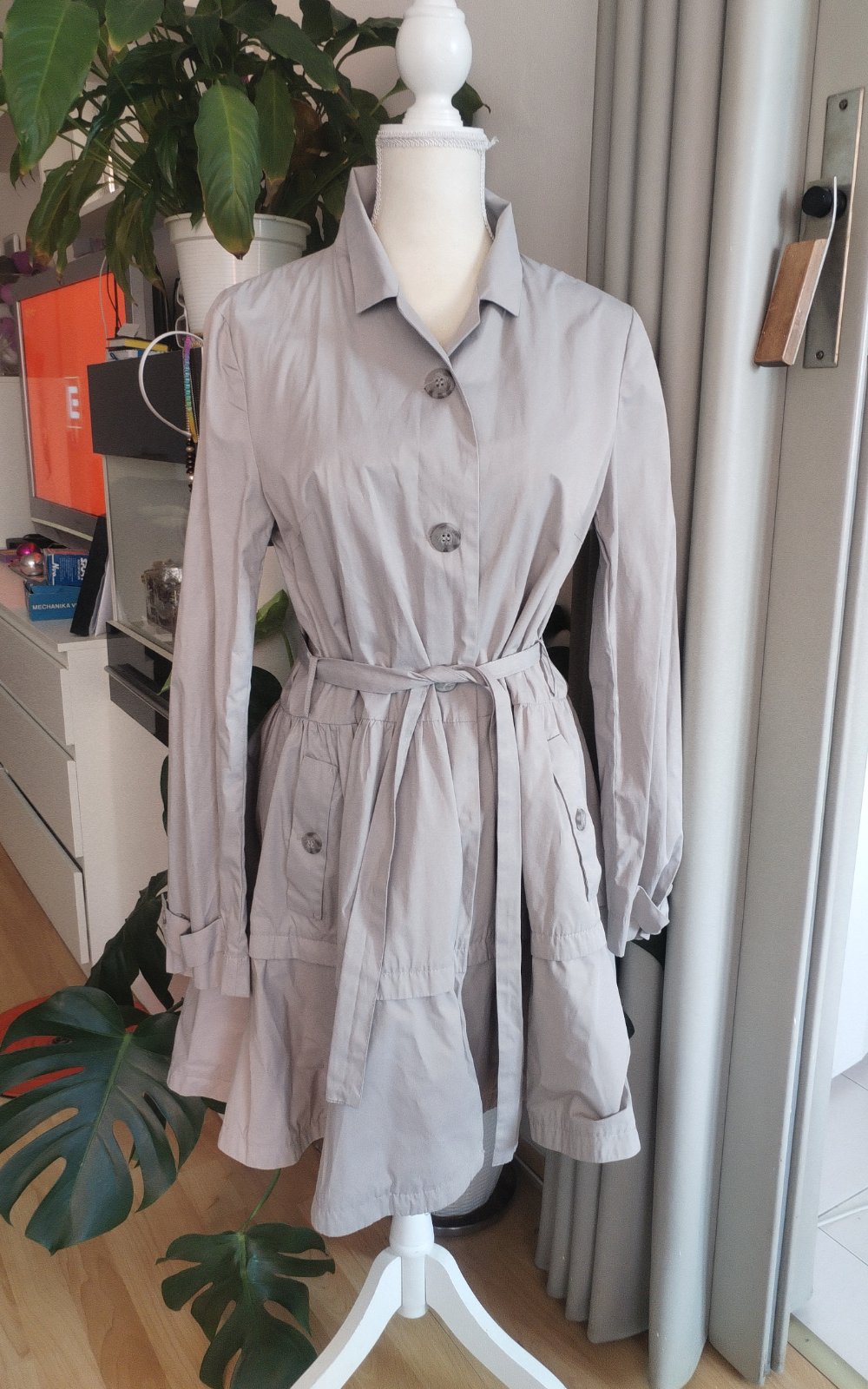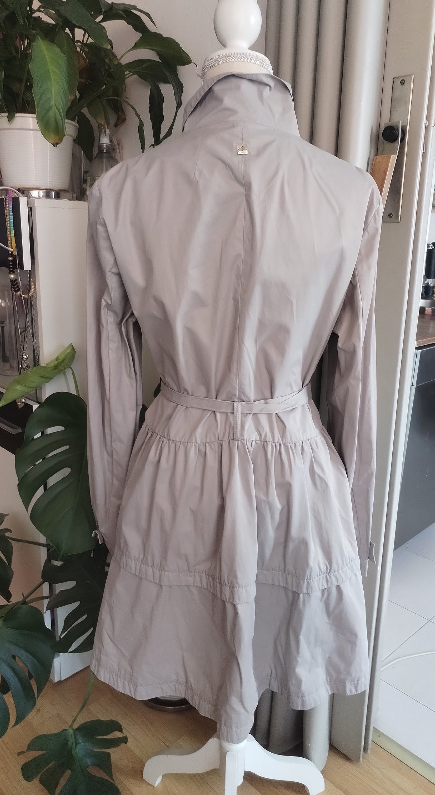 Vypadá úplně nový a naprosto bezva stav, kvalitní, velmi dobře vypadající a perfektně originálně propracovaný s kapsami. Délka 90cm, prsa do max.95cm, pas max.85cm ale dle potřeby se stáhne páskem a na štíhlejší postavě vypadá samozřejmě lépe, boky max.120cm, rameno 12+63cm mají rukávy. Mezi rameny na lopatkách 38cm. Psaná vel.XL ale lépe sedne na Lko a páskem i jako šato-kabát na Mko, prosím měřte. Focený na panně s vel.S-M. Materiál je lehce jakoby ,, pogumovaný" tudíž bude super odolný větru a mírnějšmu dešti, prostě super kousek od jara do podzimu.
