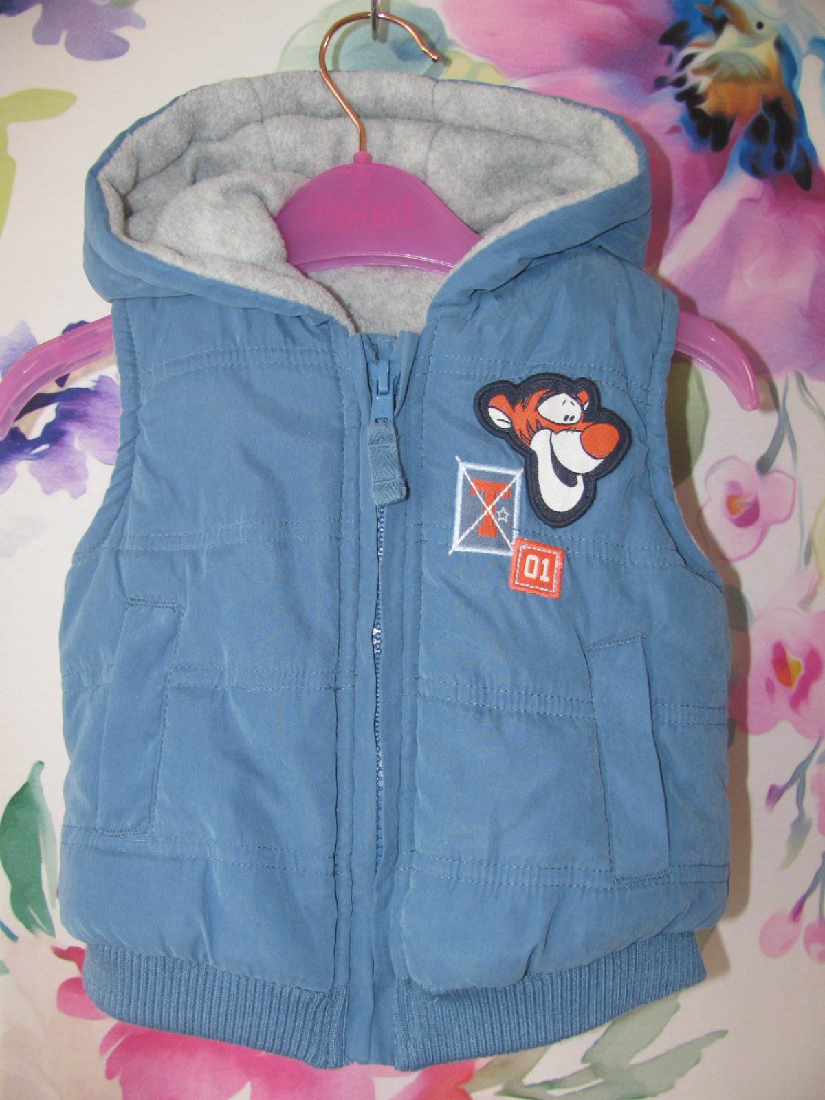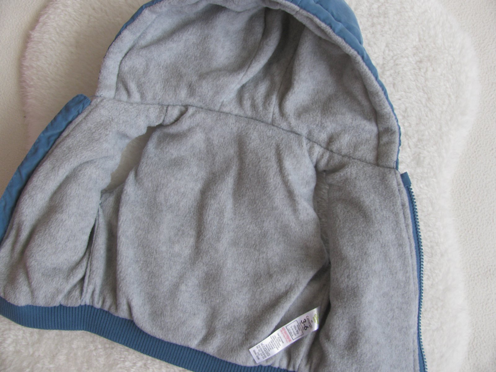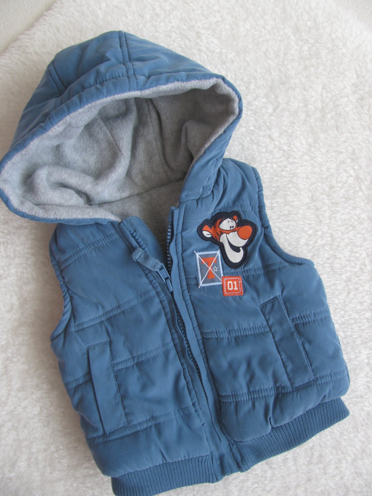 Krásná modrá chlapecká vesta, s hřejivou podšívkou, pružný lem, zap. na zip, kapsy jsou falešné, našitý obrázek, 92% polyester, 8% nylon, dále 100% polyester.