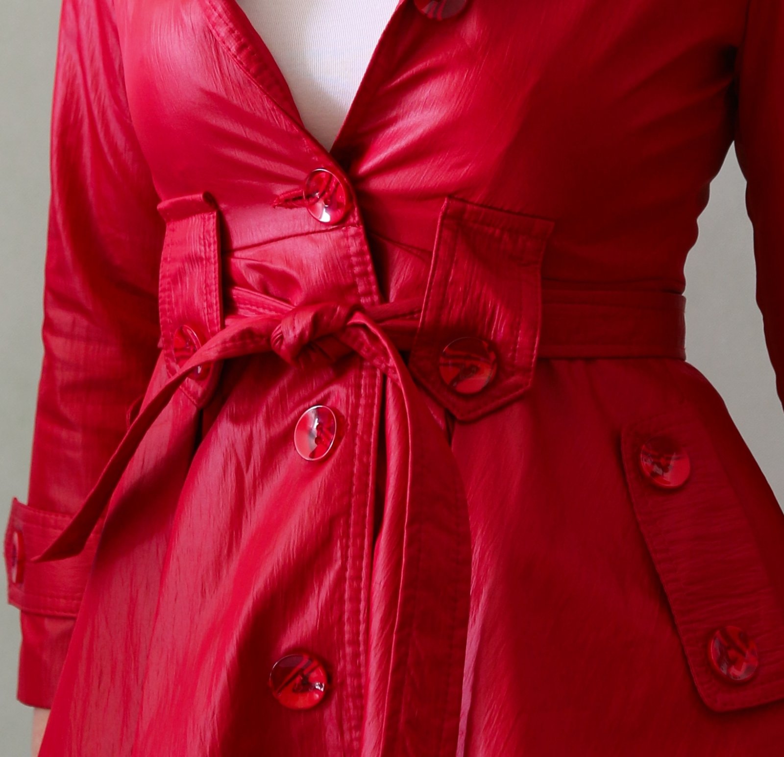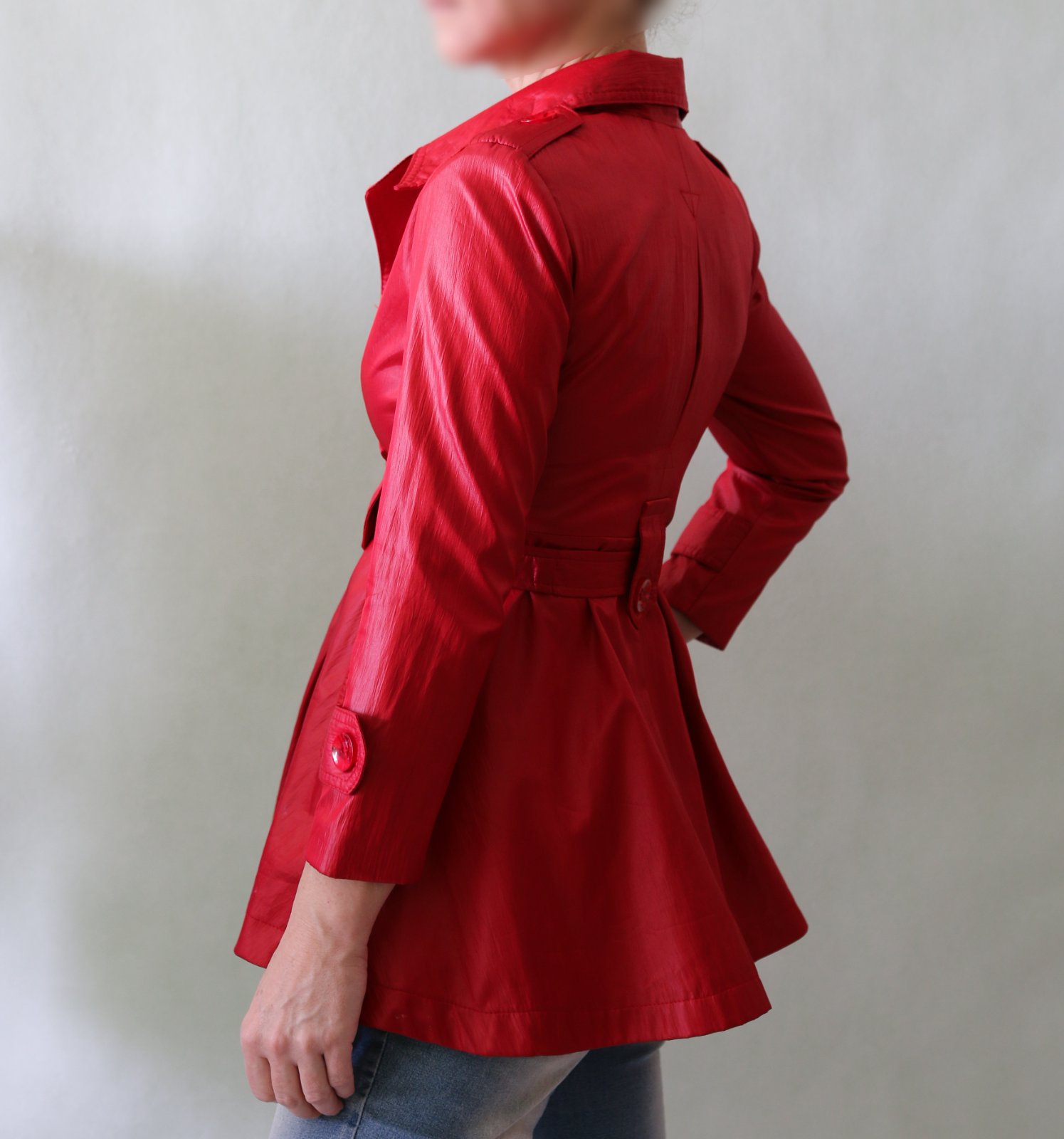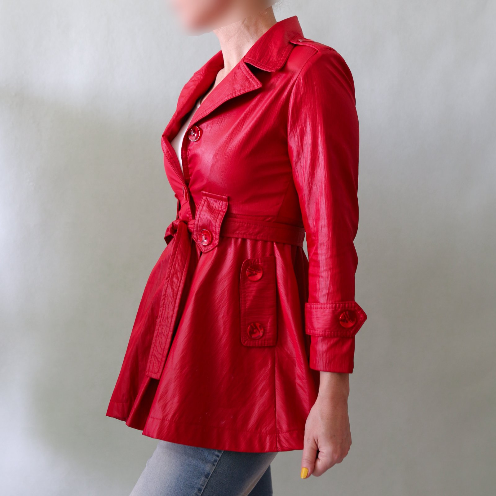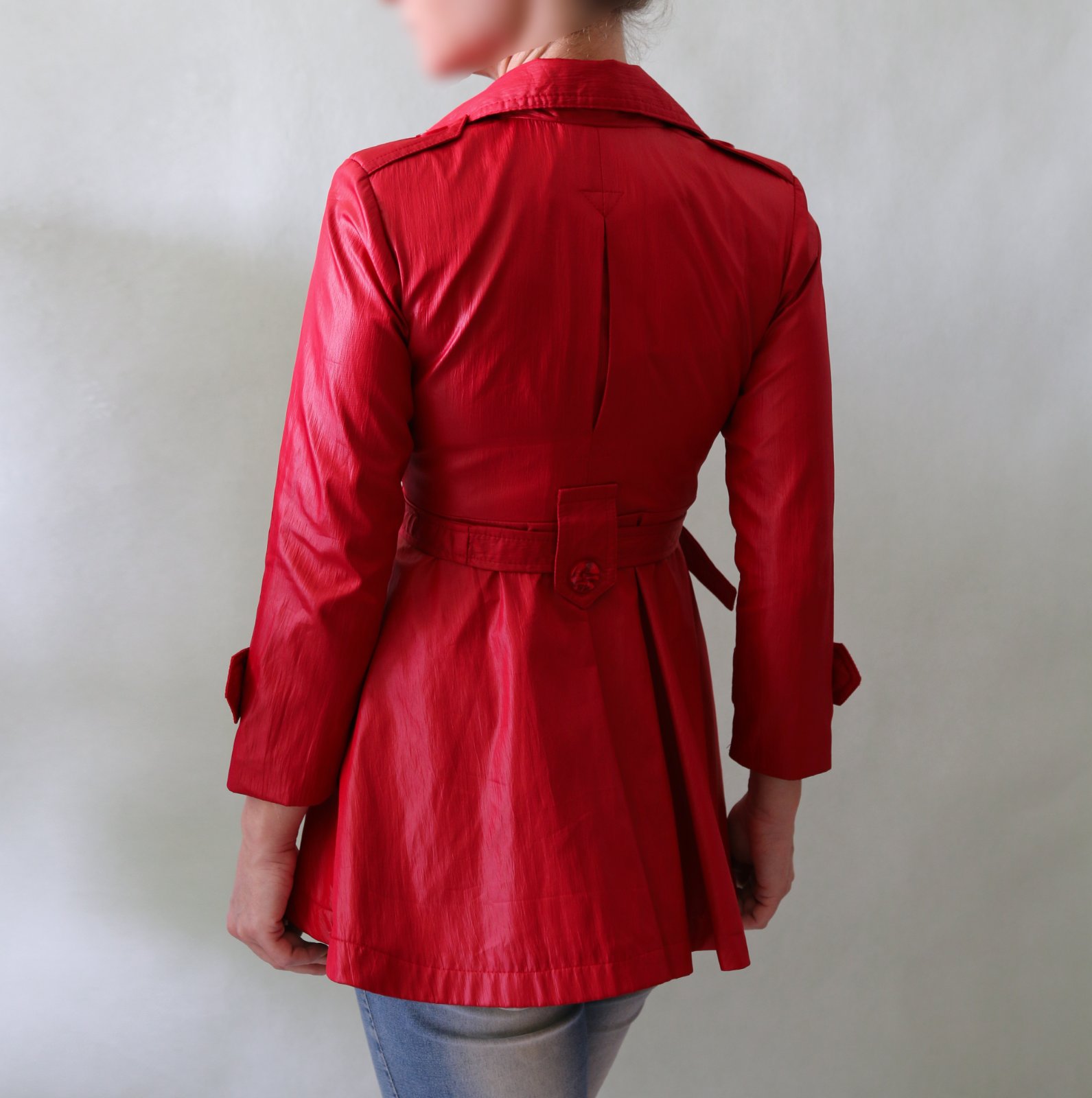Krásný červený jarní-podzimní kabátek s ženskou siluetou. Do pasu projmutý, od pasu se rozevírá bohatá sukýnka. Povrch na pohled působí jako koženka, ale je spíš šusťákový, mírně krčený. Barva chladnější červená, podšívka je pink růžová.
