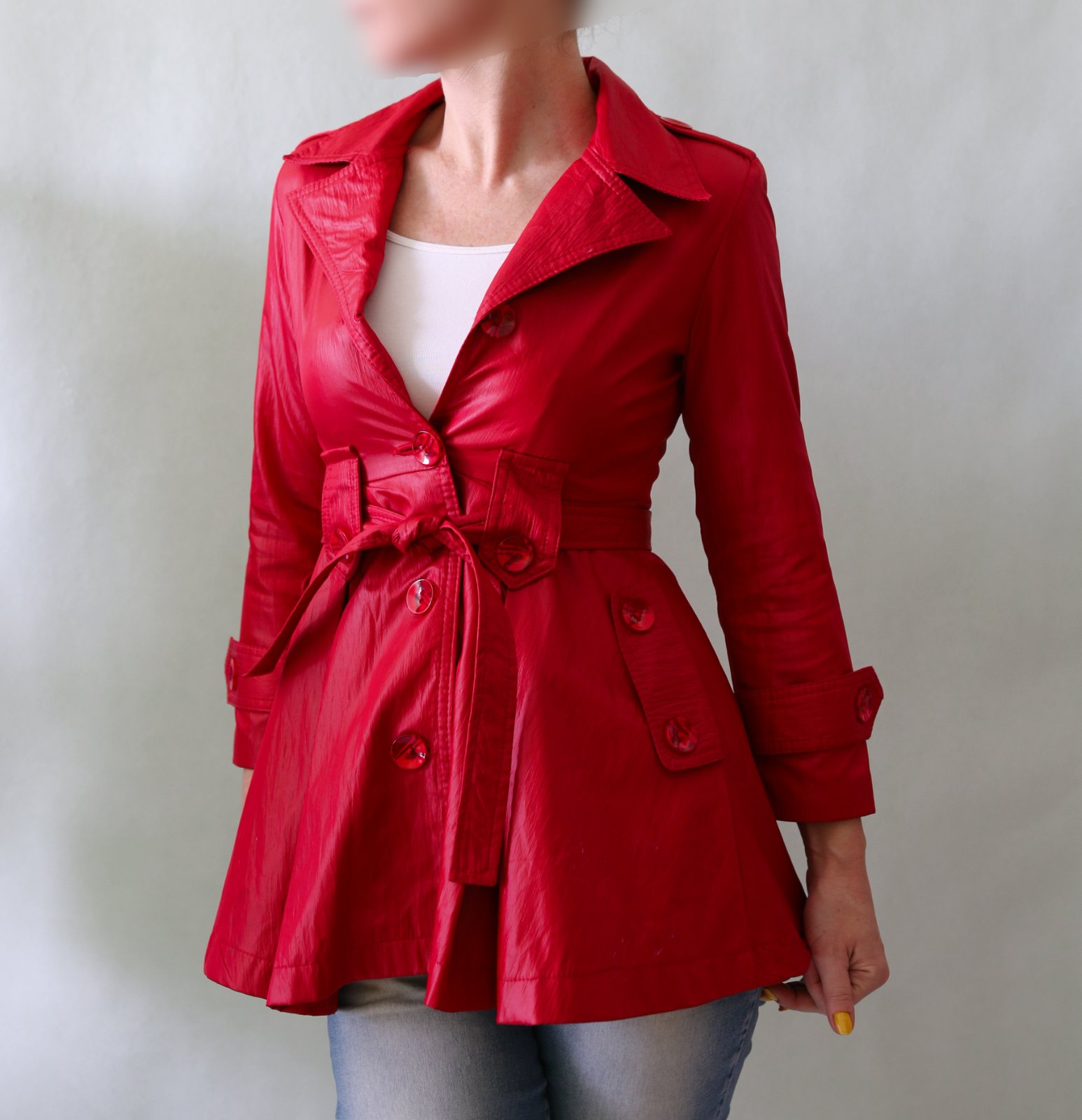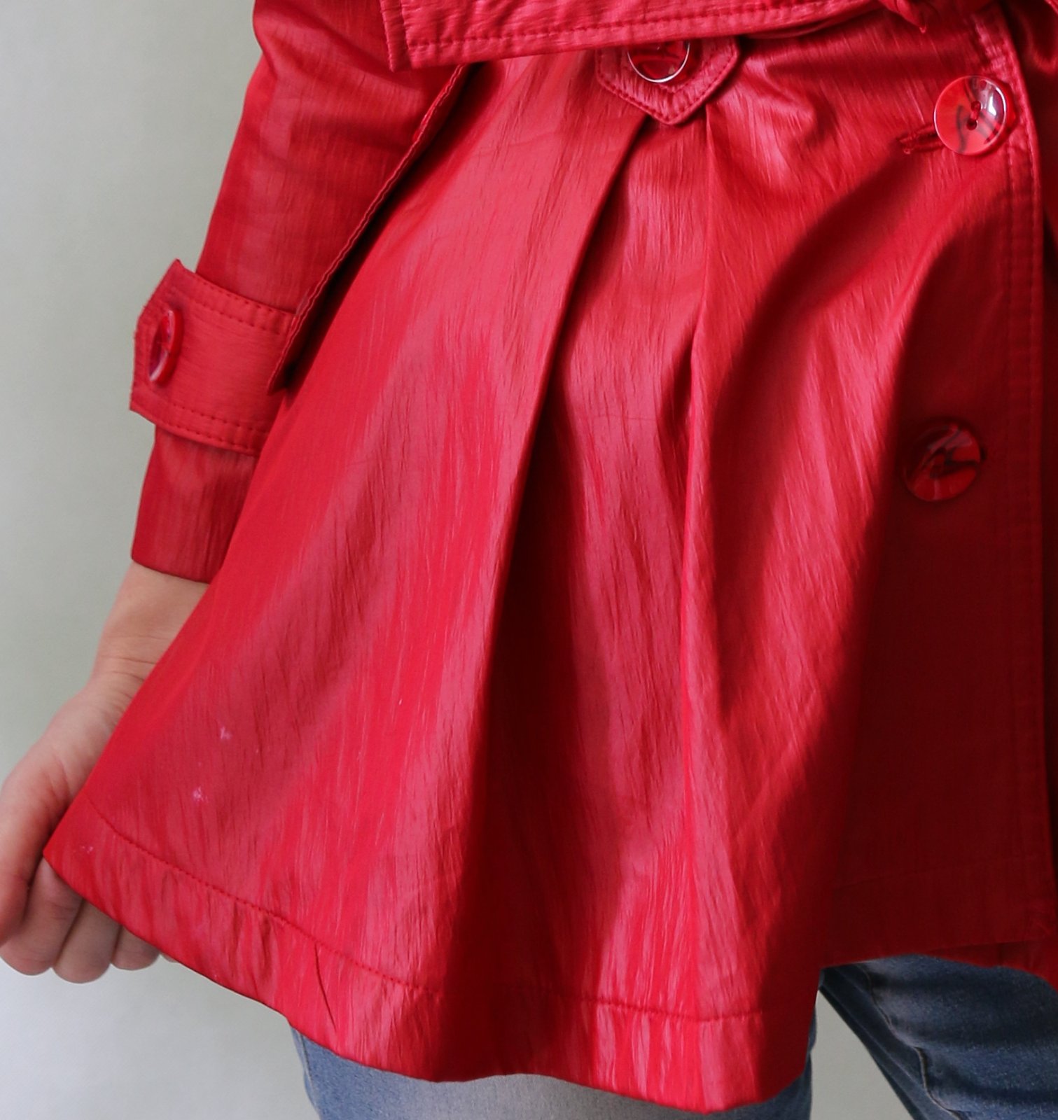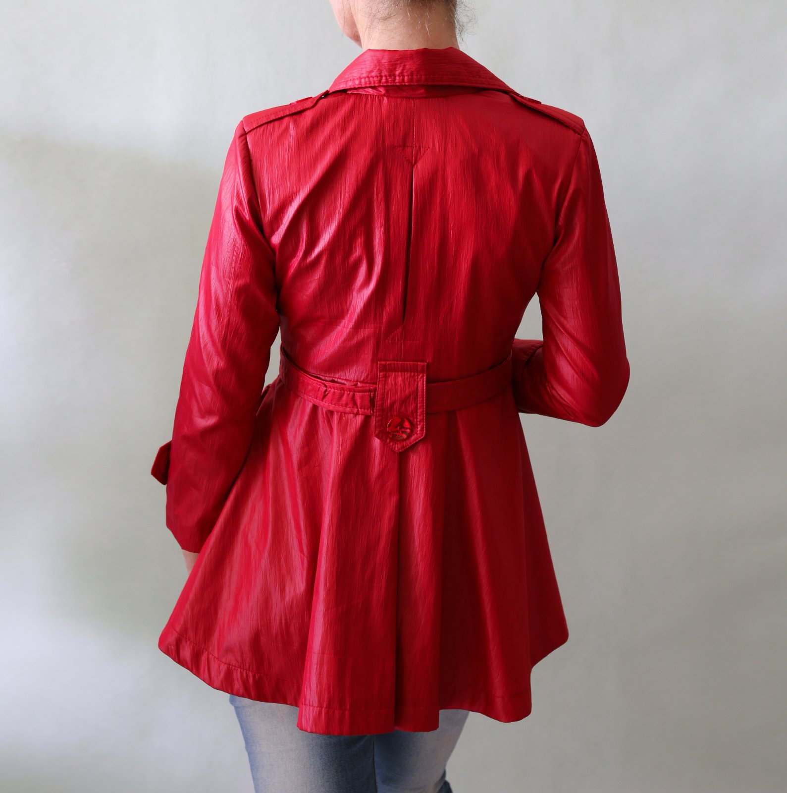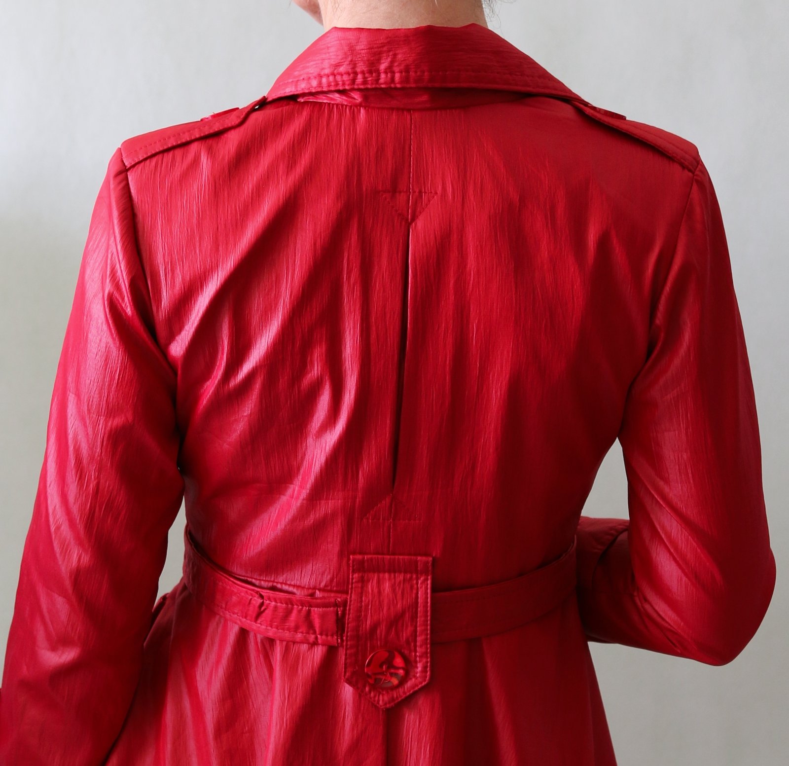Krásný červený jarní-podzimní kabátek s ženskou siluetou. Do pasu projmutý, od pasu se rozevírá bohatá sukýnka. Povrch na pohled působí jako koženka, ale je spíš šusťákový, mírně krčený. Barva chladnější červená, podšívka je pink růžová.