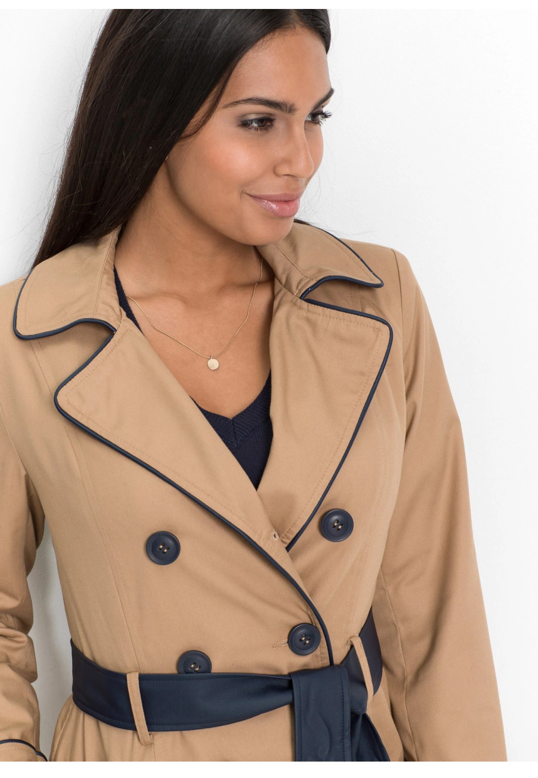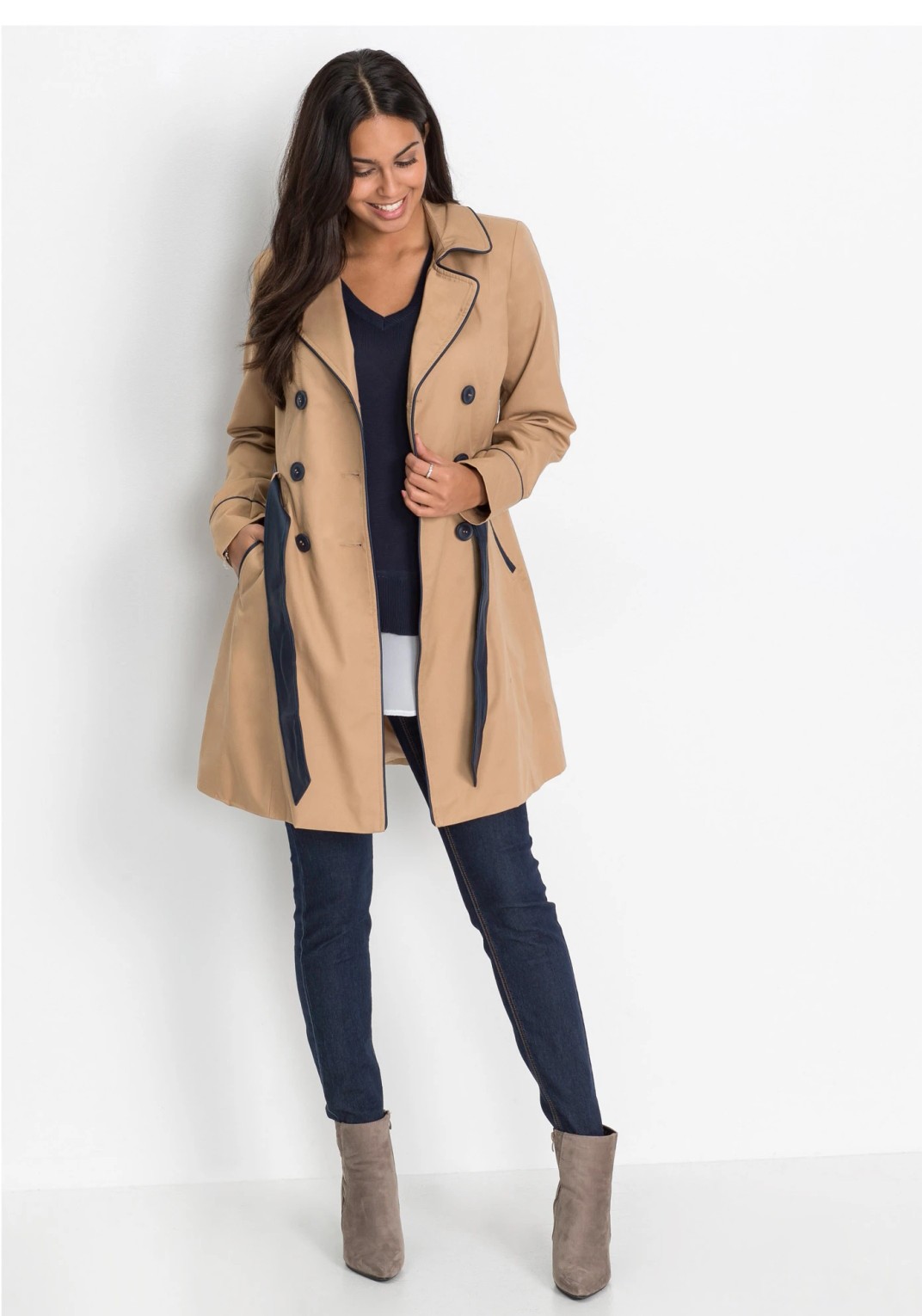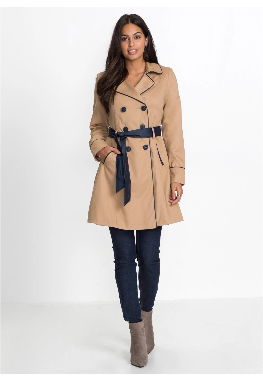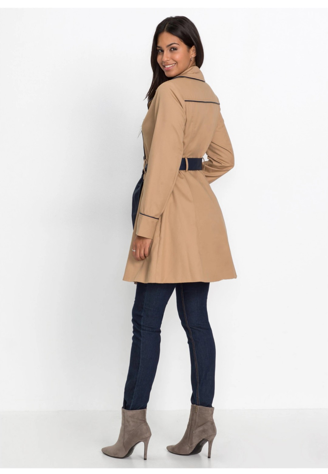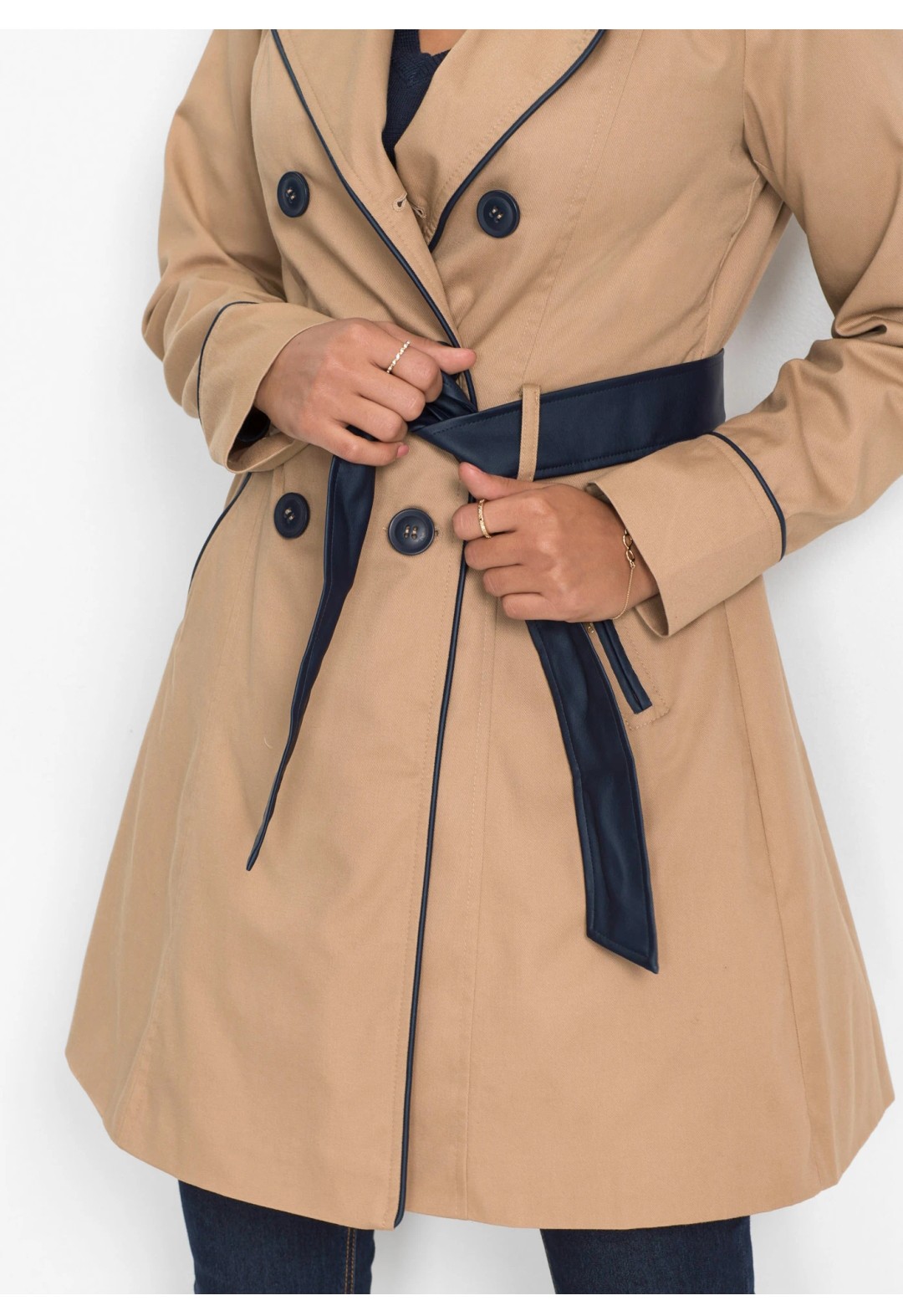 Módní trenčkot s nadčasovými barevnými kontrasty. Působivý trenčkot s klopou a dvouřadou knoflíkovou lištou. Vsadky z umělé kůže upoutají pozornost. S klasickým páskem v pase pro ženský vypasovaný vzhled.