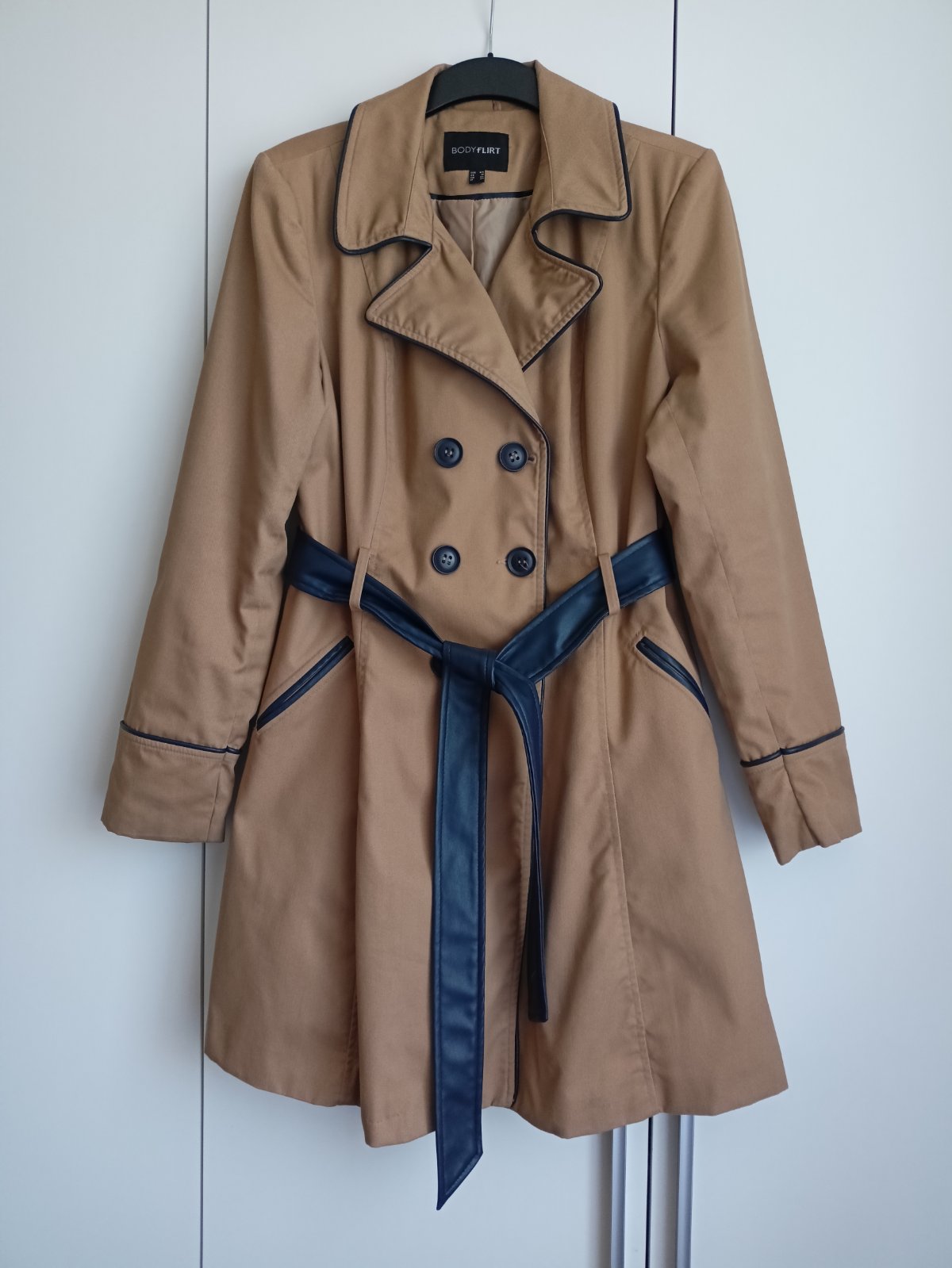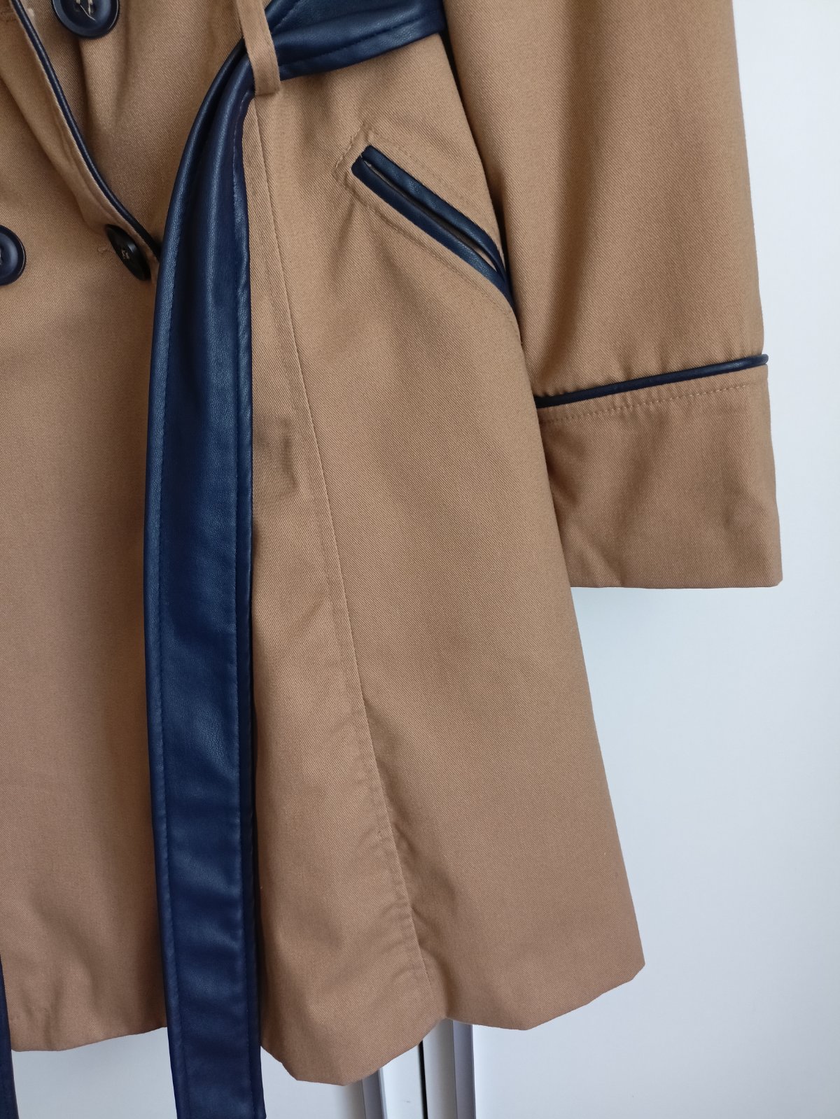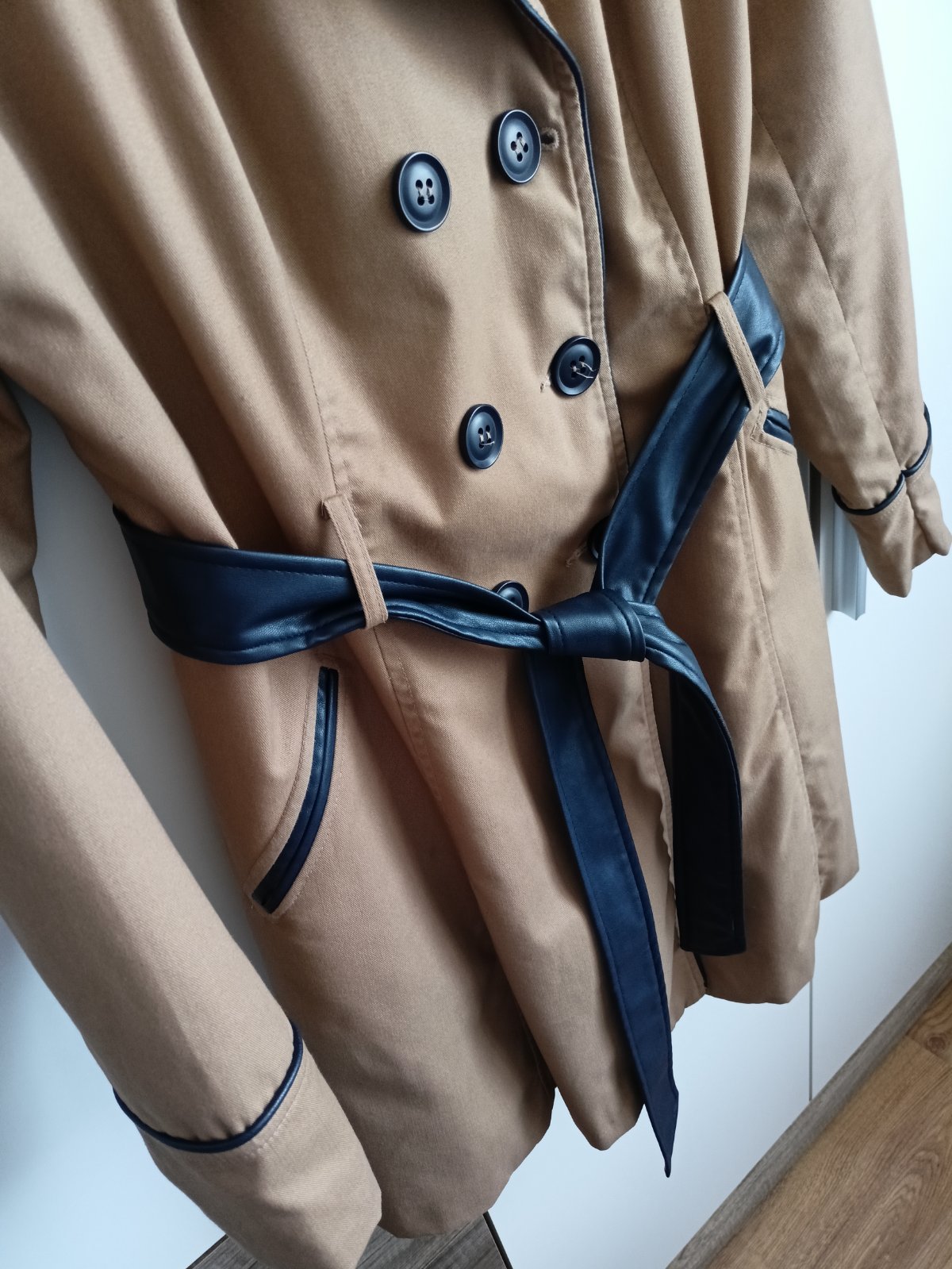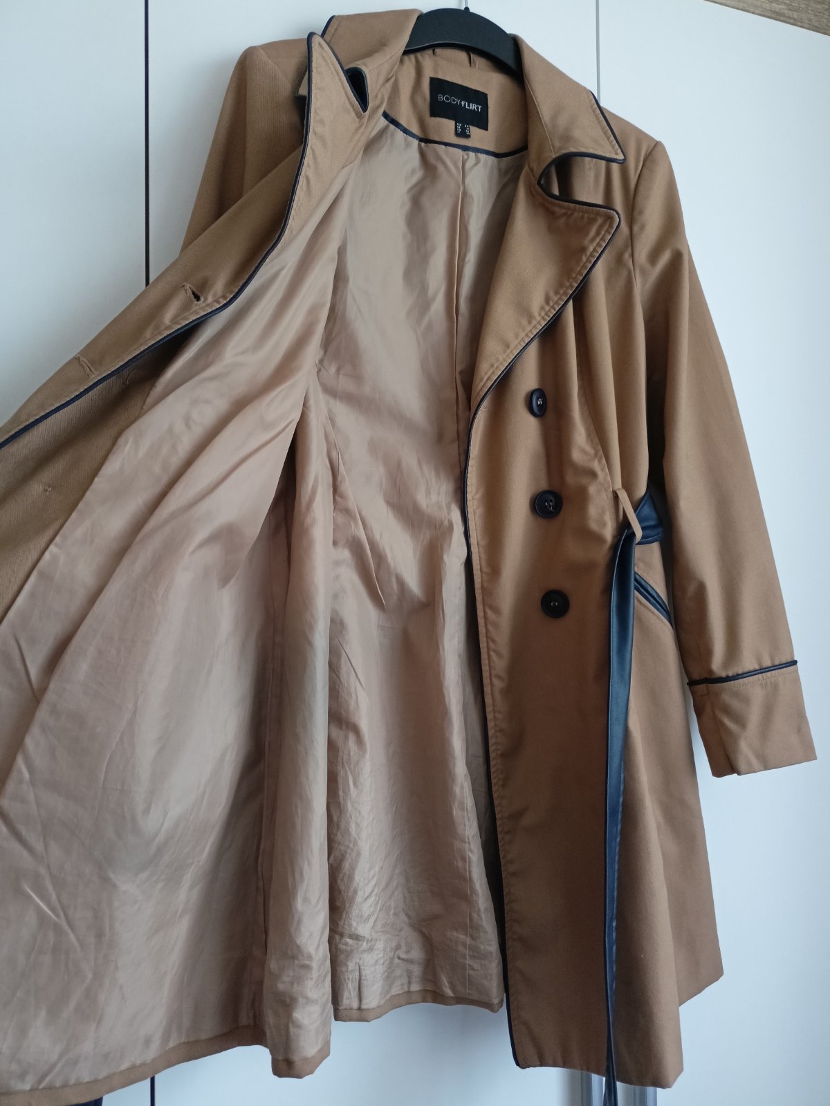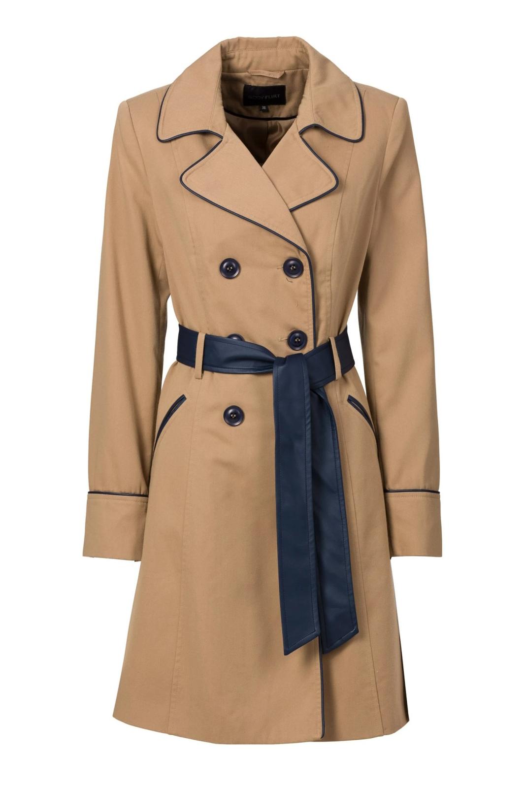 Módní trenčkot s nadčasovými barevnými kontrasty. Působivý trenčkot s klopou a dvouřadou knoflíkovou lištou. Vsadky z umělé kůže upoutají pozornost. S klasickým páskem v pase pro ženský vypasovaný vzhled.