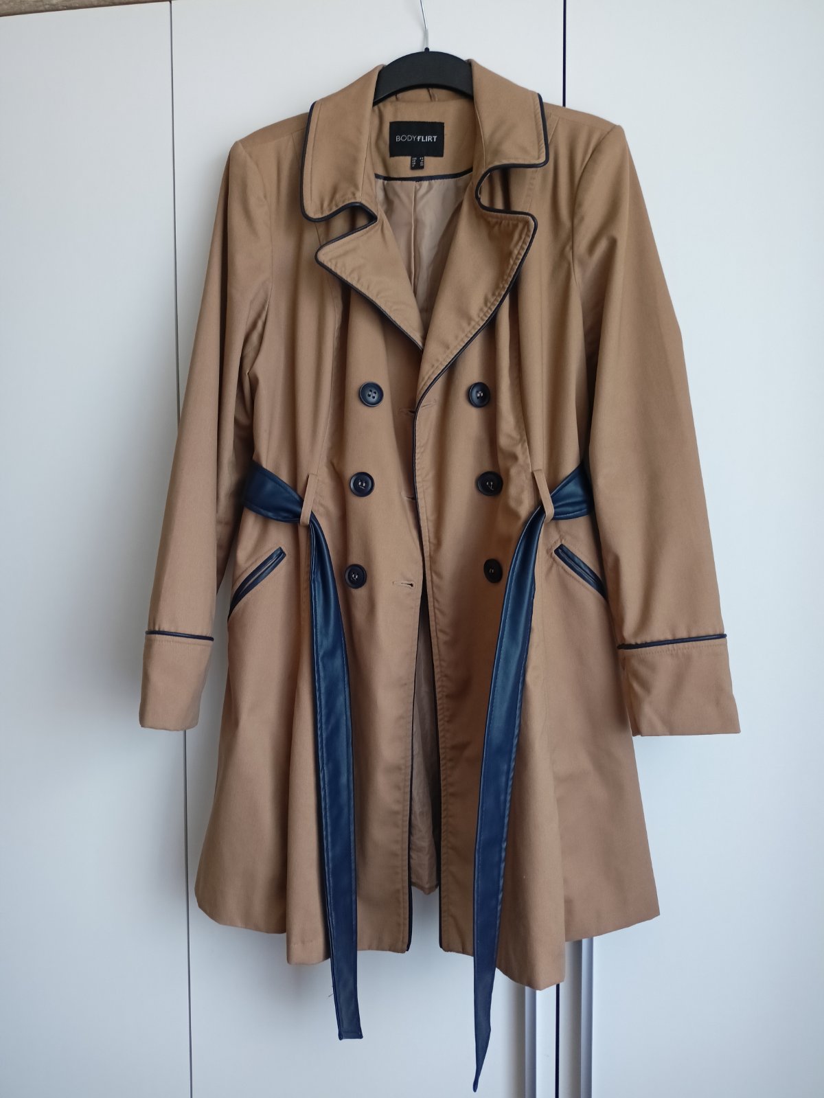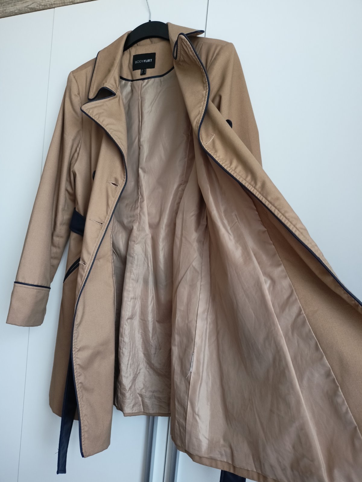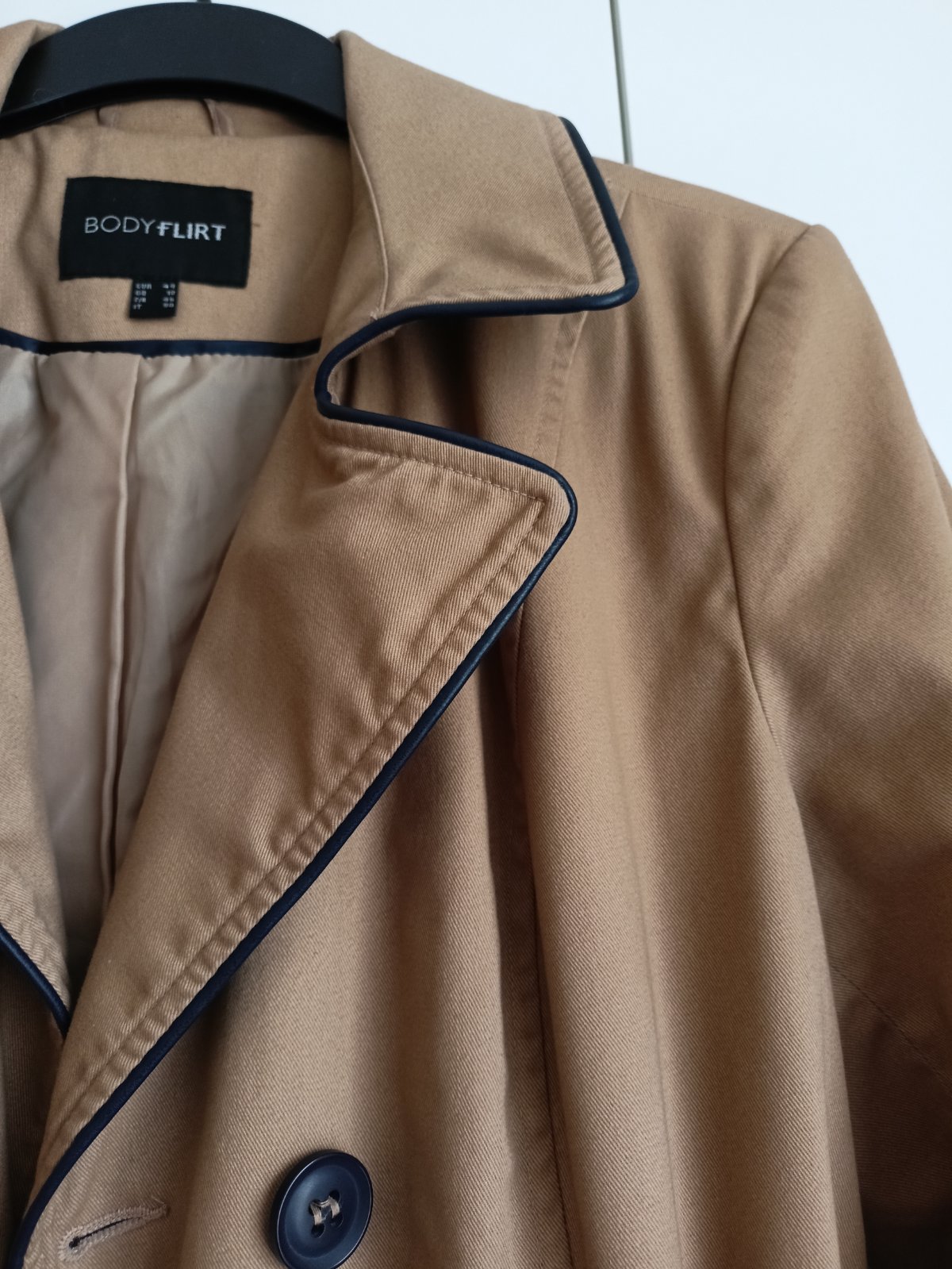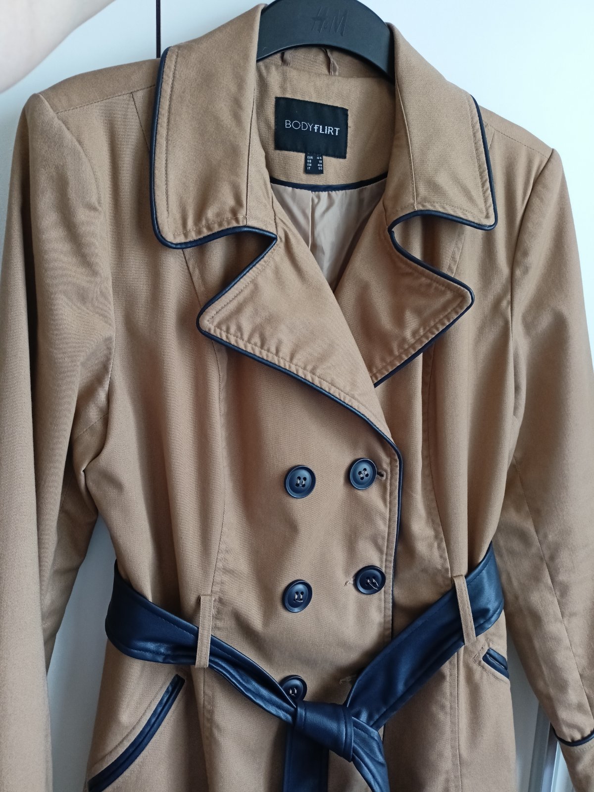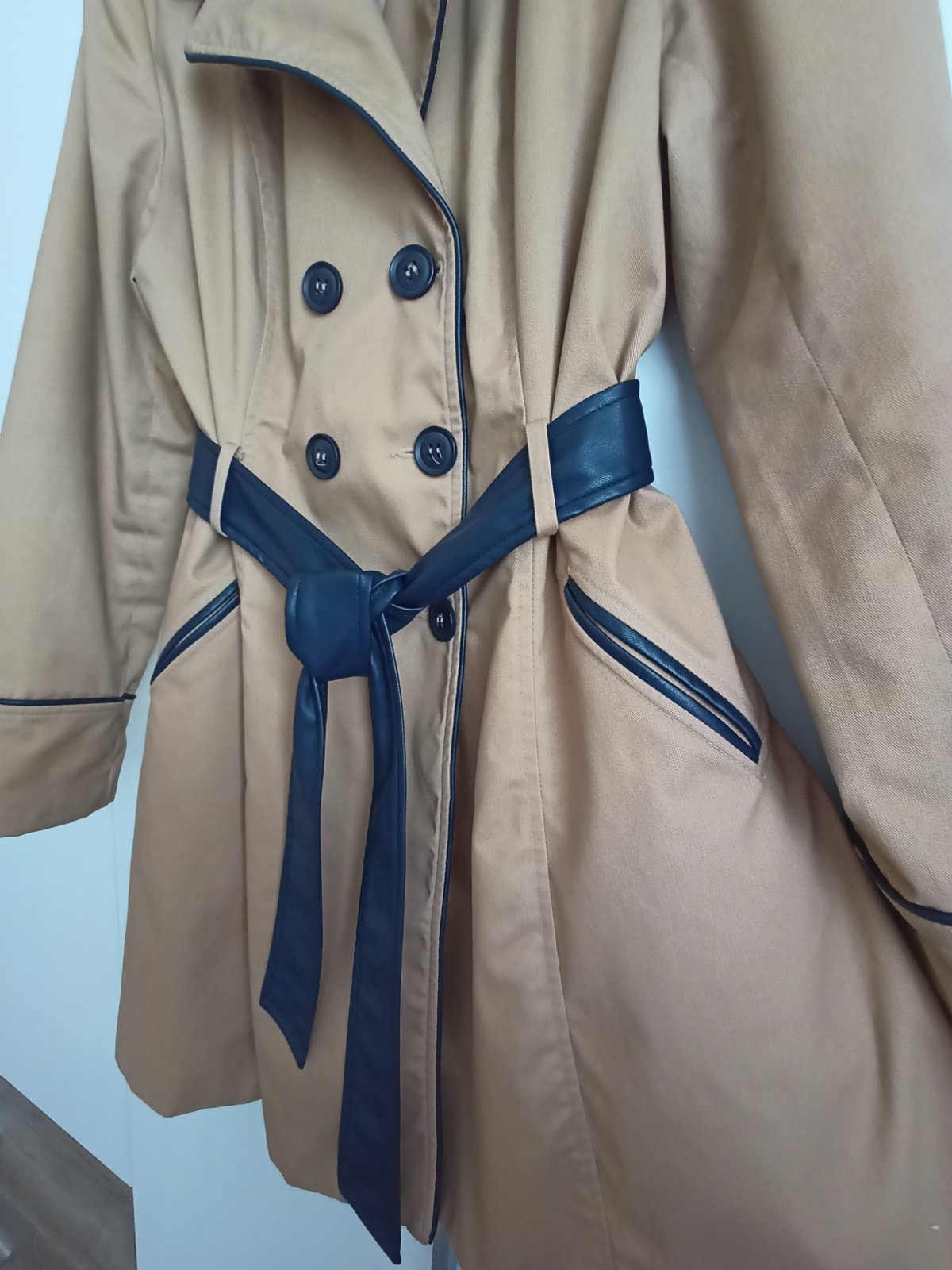 Módní trenčkot s nadčasovými barevnými kontrasty. Působivý trenčkot s klopou a dvouřadou knoflíkovou lištou. Vsadky z umělé kůže upoutají pozornost. S klasickým páskem v pase pro ženský vypasovaný vzhled.