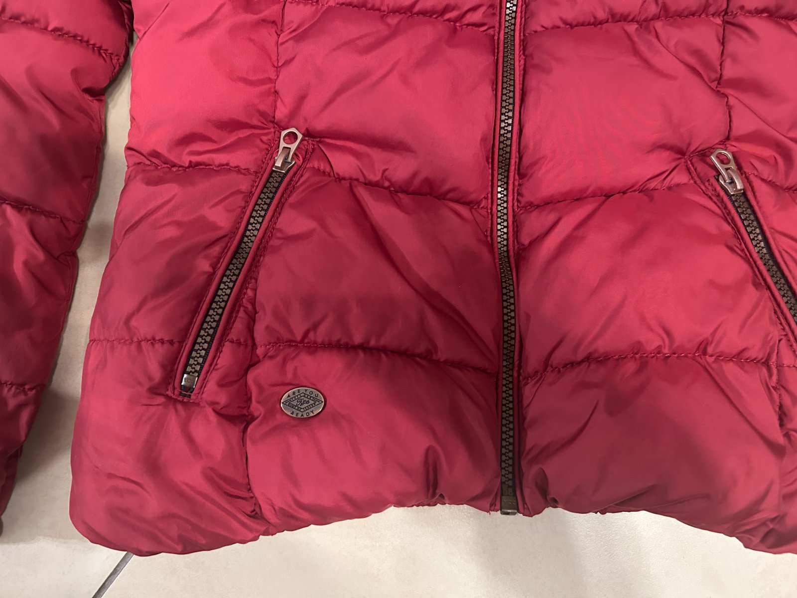 Pěkná vypasovaná bunda s odepínací kapucí, Délka rukávu 56cm, délka zad 57cm, přes hrudník 43cm. Velikost na bundě je vedena 157, podle me je menší - spíš 146-152.