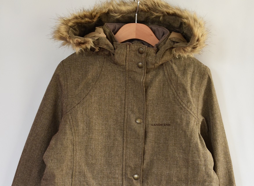Khaki zimní bunda Lands' End z pevnější nepromokavého materiálu.