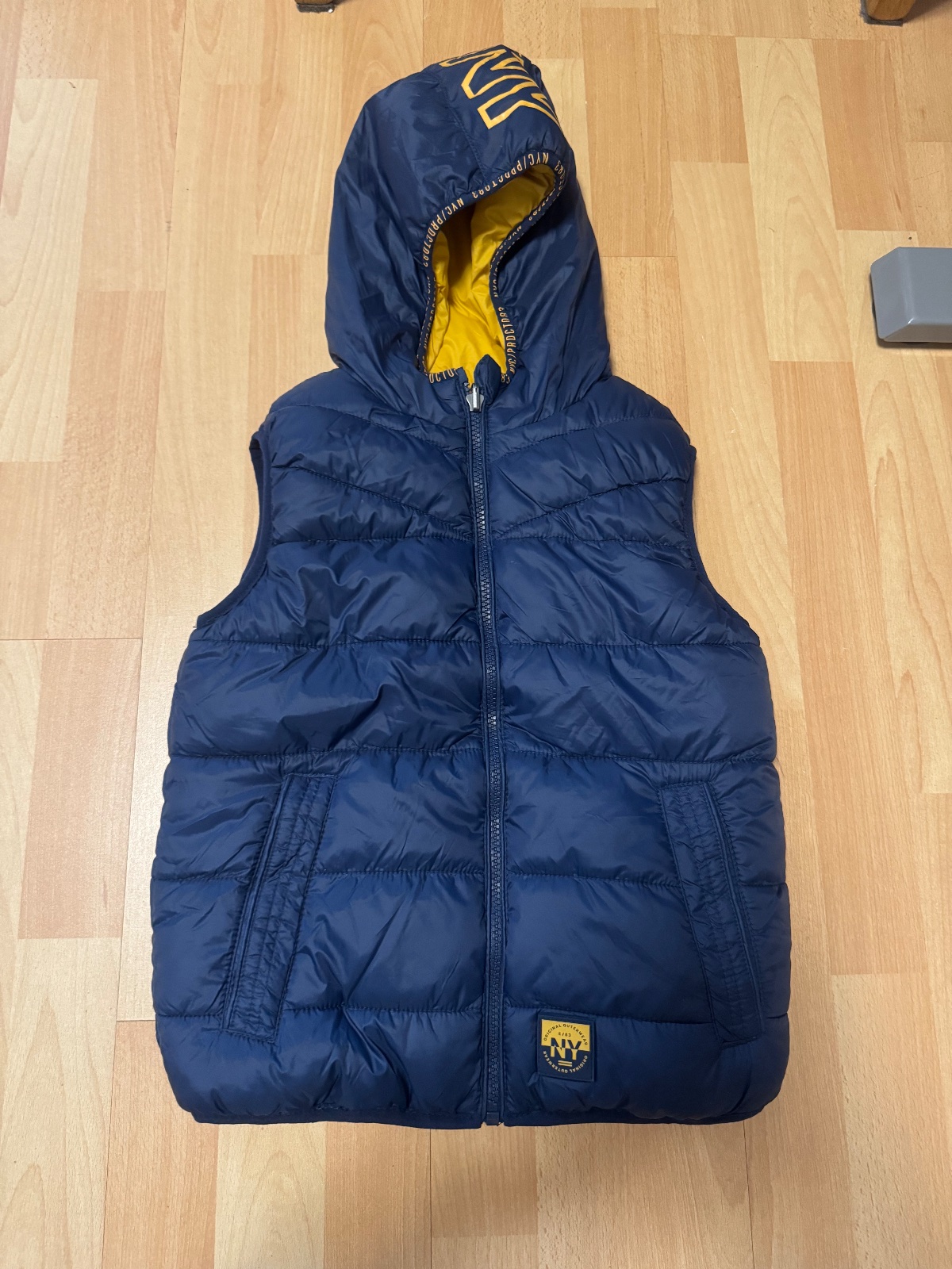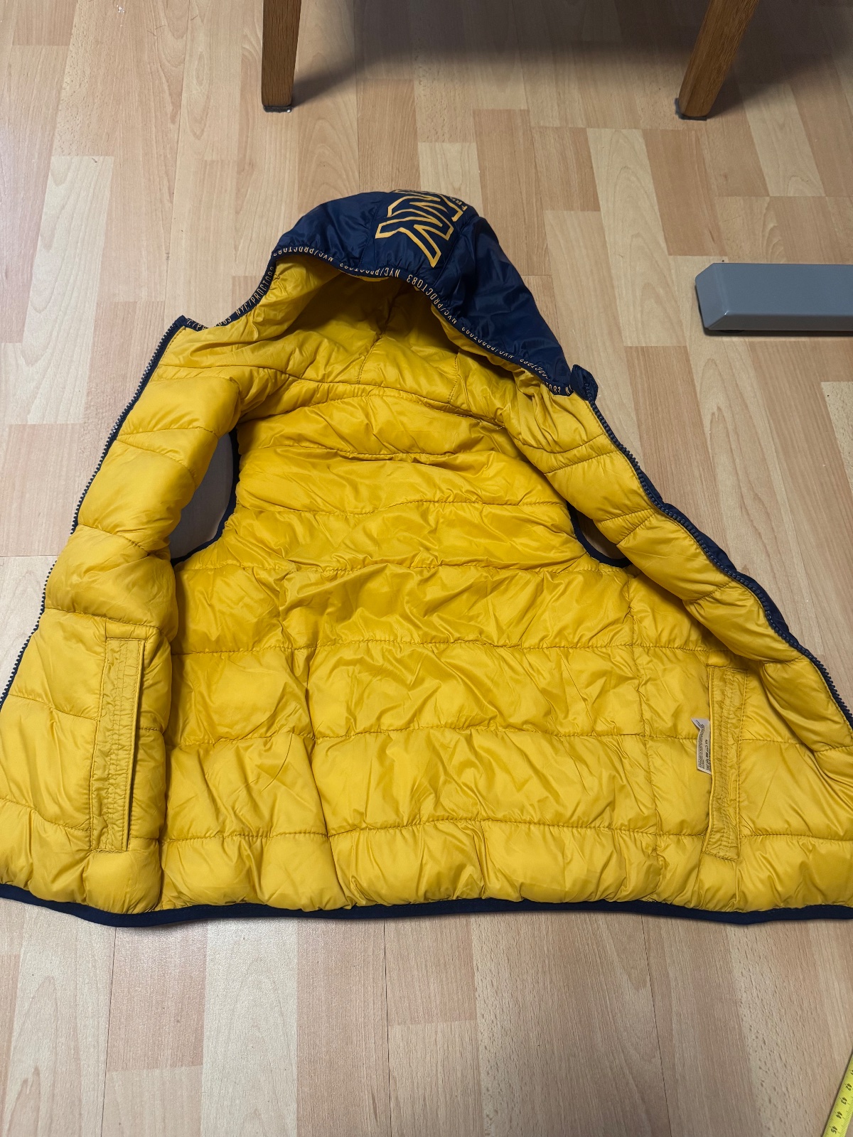 Příjemně měkká oboustranná vesta (žlutá/modrá). Je prakticky nenošená, jako nová.