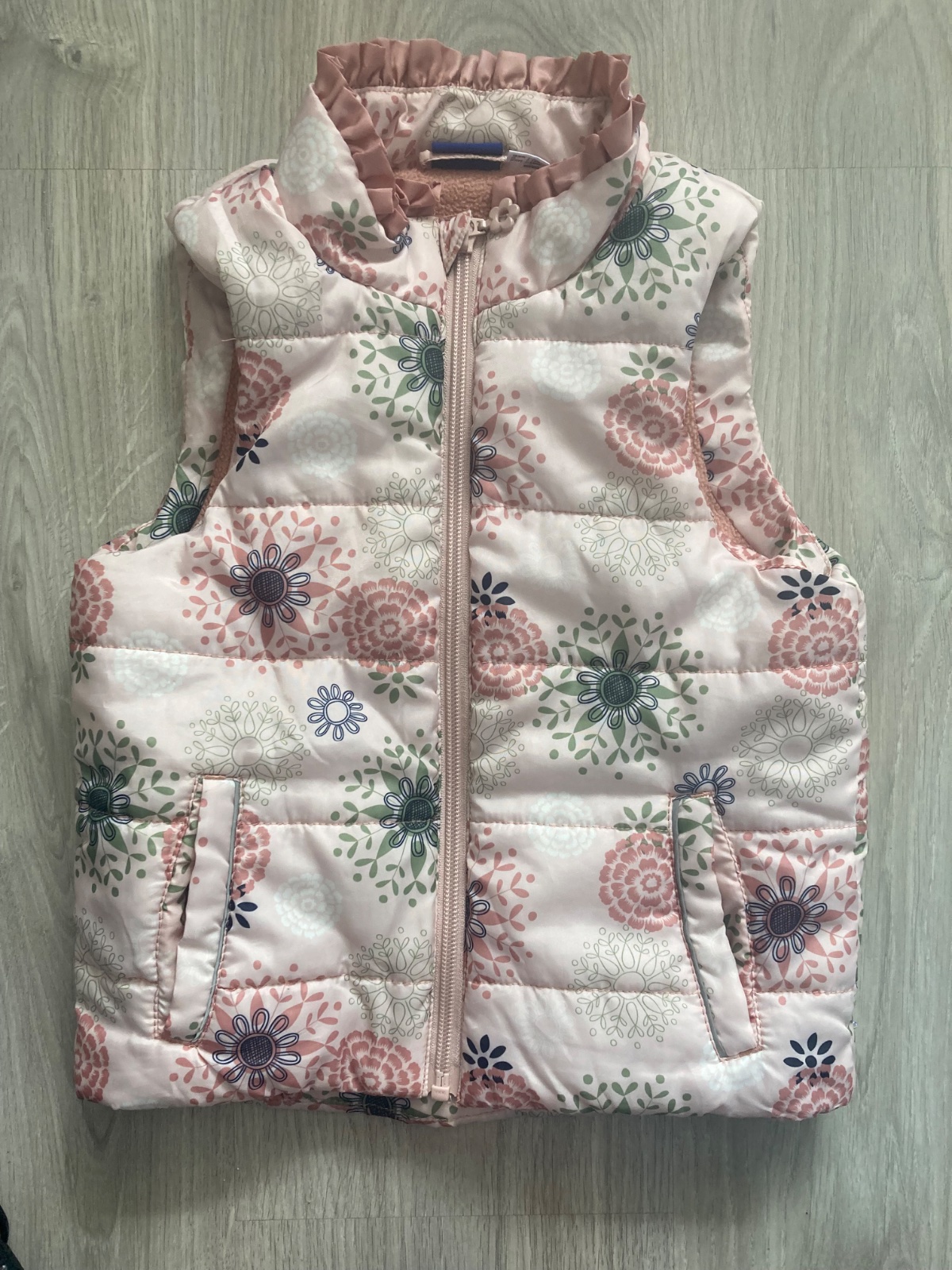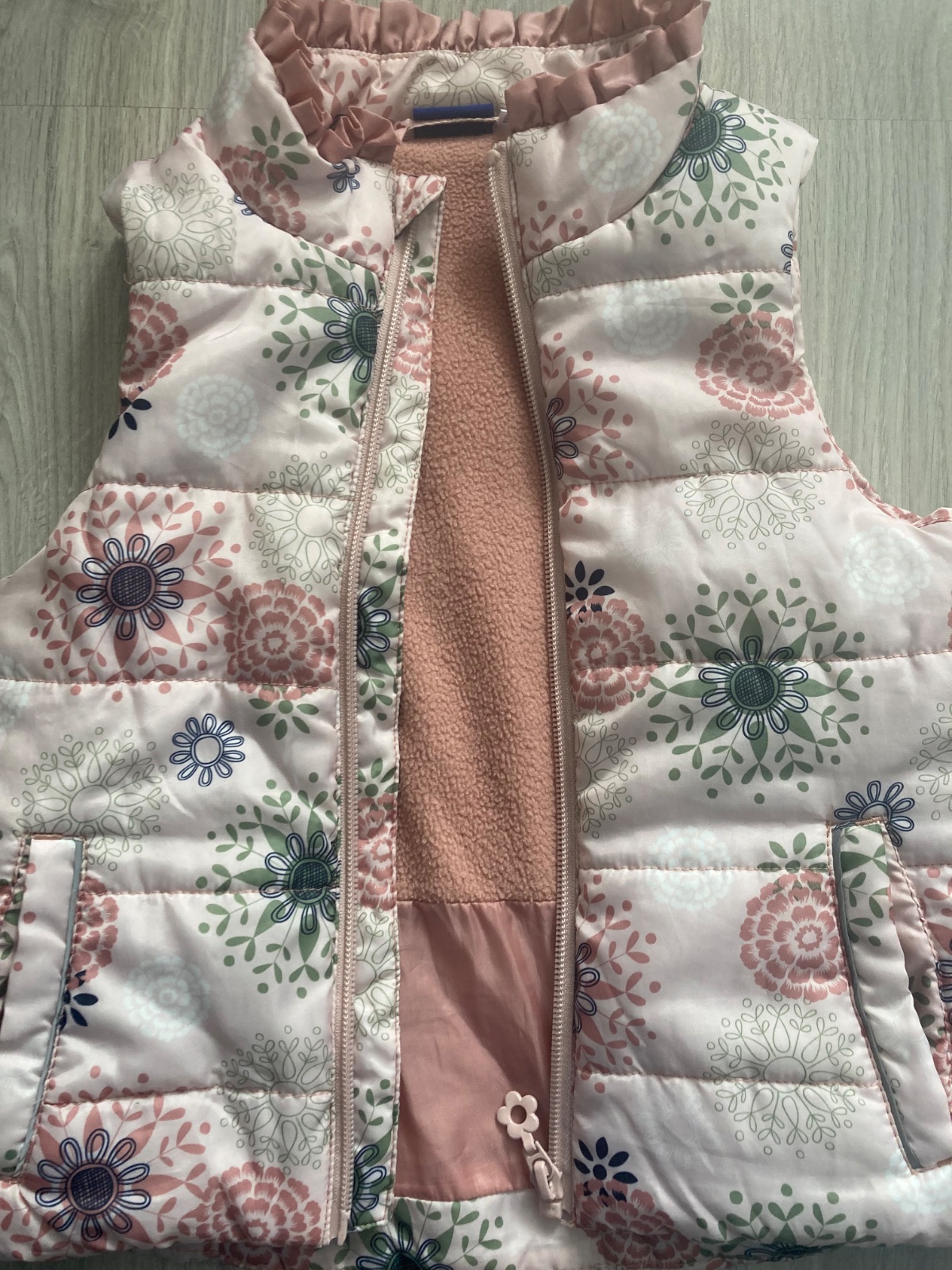 Vesta bez kapuce, funkční kapsy, uvnitř fleece. Značka Lupilu, velikost 98, 100% polyester. Vyrobeno v Myanmaru.