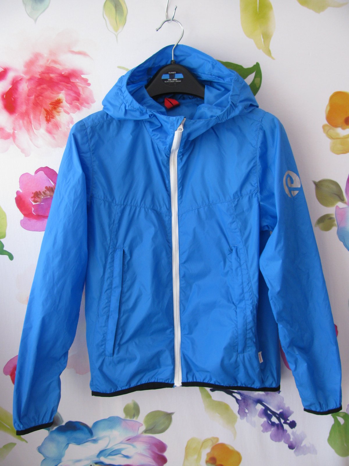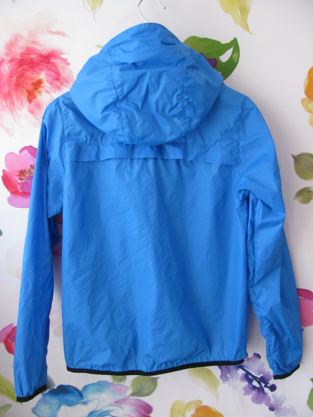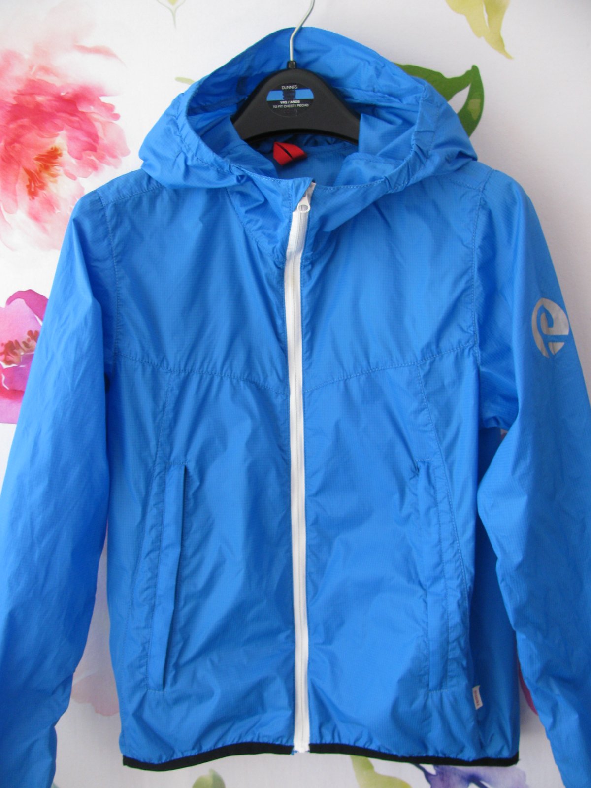 Luxusní bunda s kapucí-větrovka, pružné lemy kolem kapuce, konce rukávů a spodní okraj bundy, boční kapsy na zip, krytý zip pod krkem, záda prodloužená, logo na rukávu a na štítku. 100% polyamid. Součásti bundy je malá taštička se zipem, kde se dá bunda pohodlně složit do malého balíčku. Top stav bez vady, nošená je jednou, už je nám malá. PC vysoká.