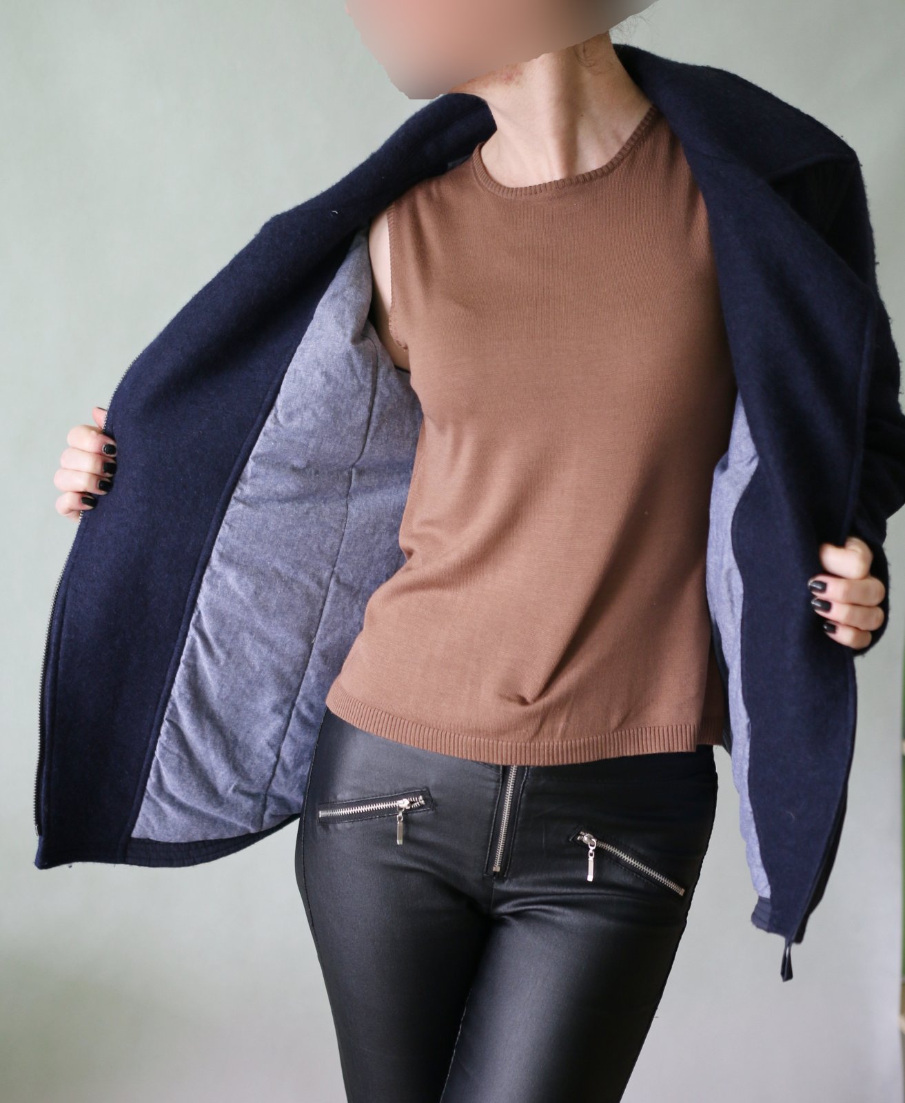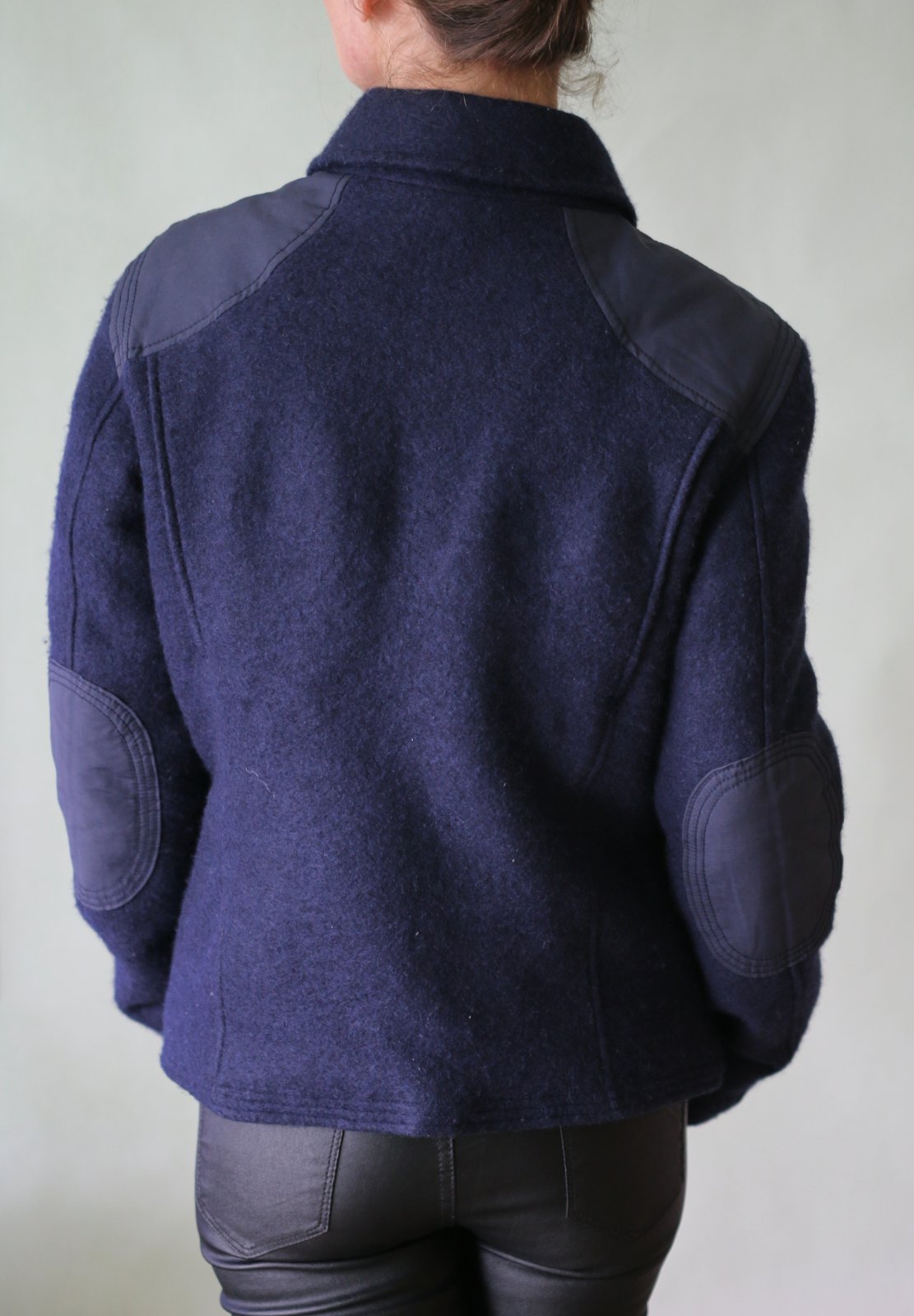 Tmavě modrá přechodová bunda/kabát - křivák Esprit z lodenu, tužšího materiálu s vyšším podílem vlny: 59% vlna, 32% polyester, 9% akryl. Podšitý světlou podšívkou, v těle čistá bavlna, v rukávech polyester. Aplikace na ramenou a na loktech připomínají tužší šusťák. Zapínání na šikmý zip a cvočky, asymetricky řešené kapsy.