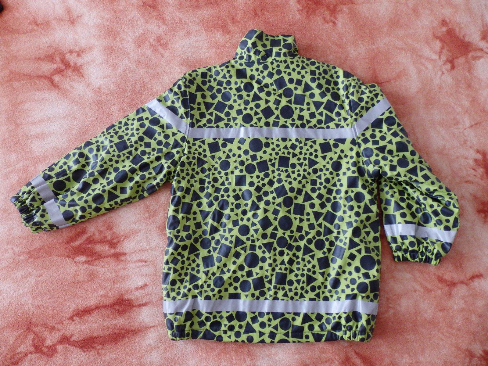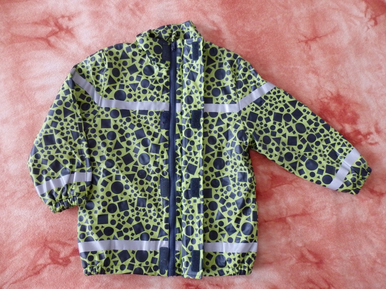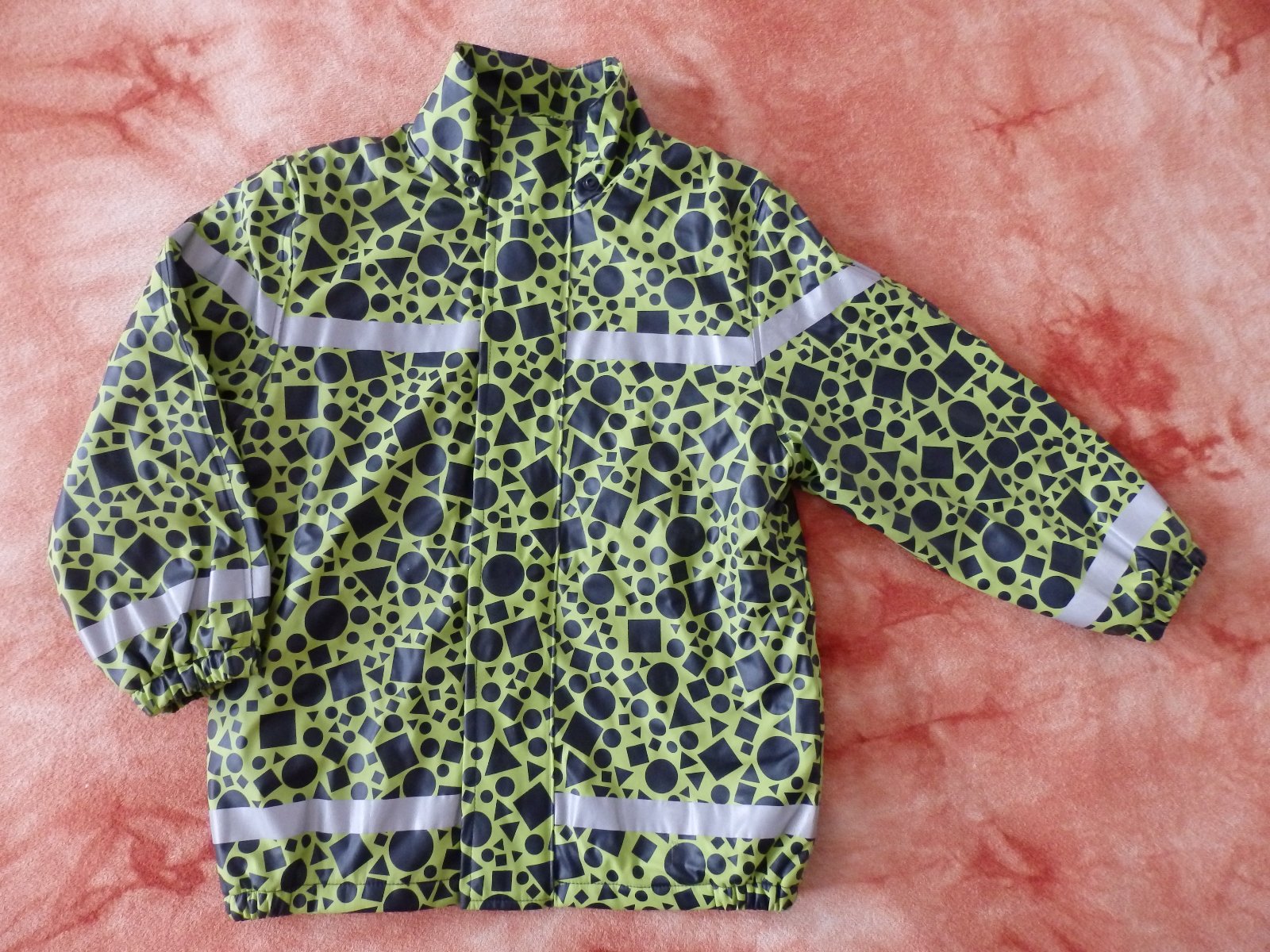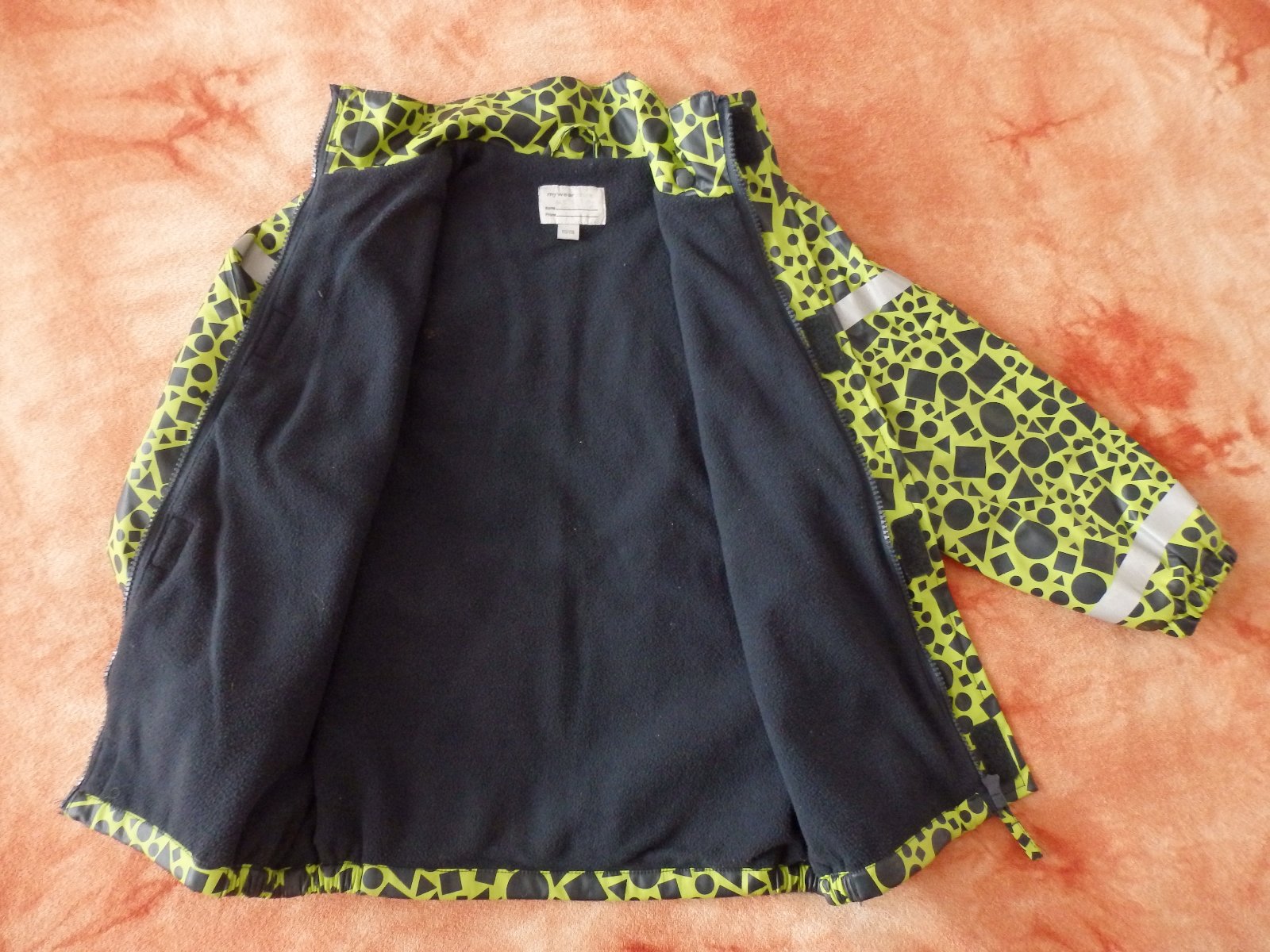 Zelenkavá bunda s geometrickými tvary, reflexní prvky, celkem voděodolná (sice starší, ale něco vydrží), zapínání na zip a suché zipy, bez kapucky, na konci rukávů do gumy, uvnitř zateplená flísem. Už je starší, má ve spodní části trhlinku, našla jsem flíčky na boku, ale určitě ještě poslouží. Velikost 110/116.