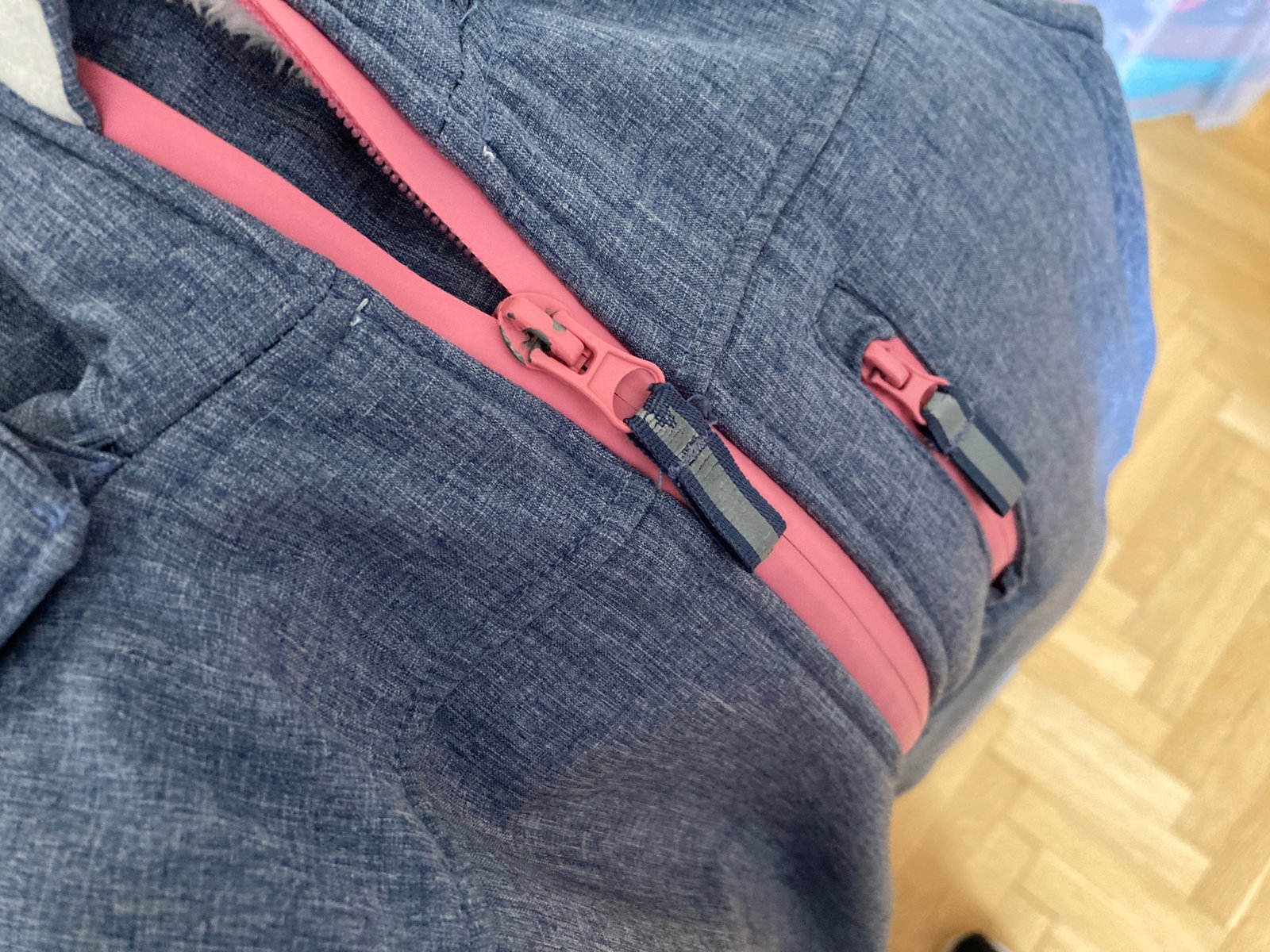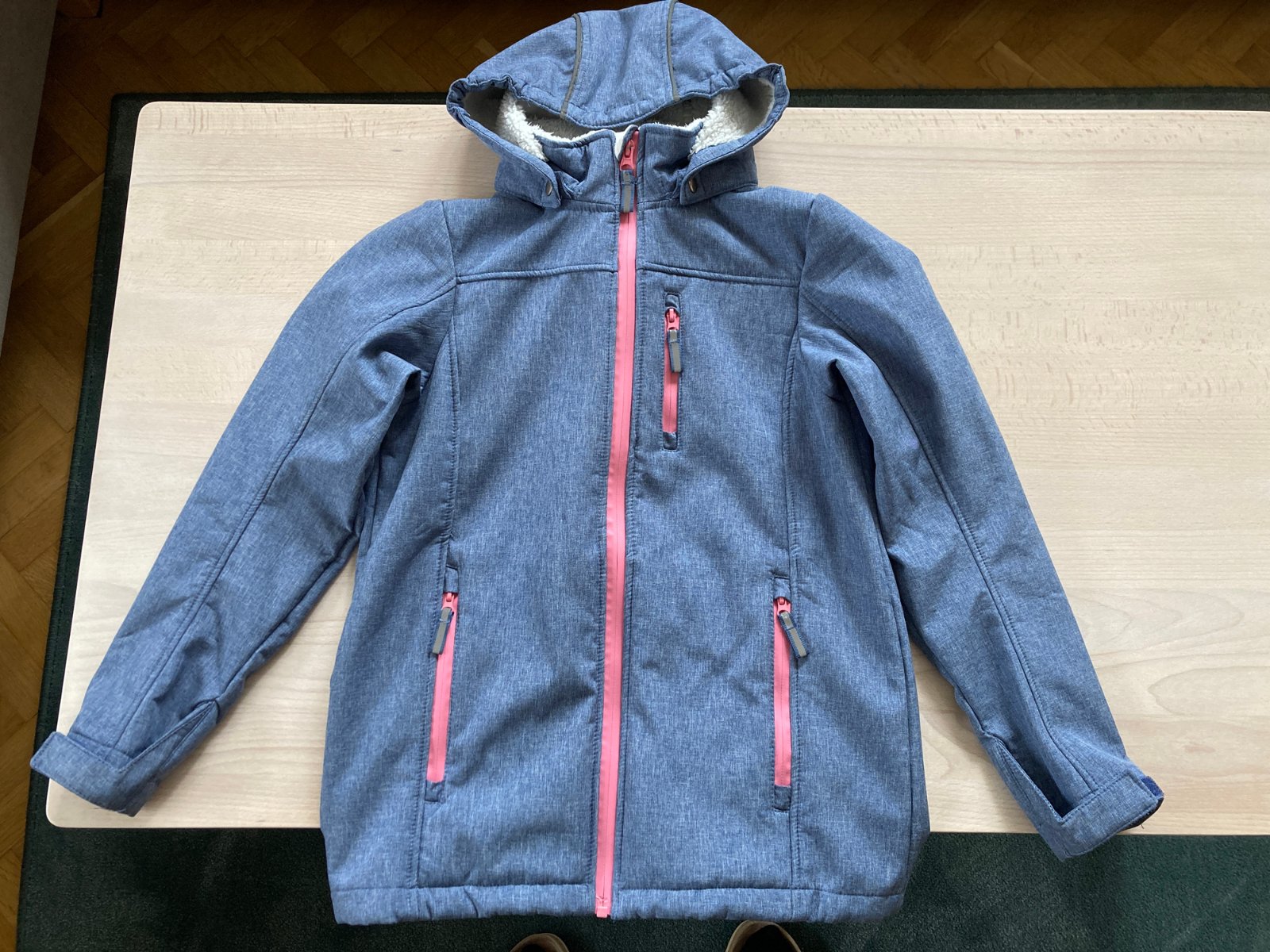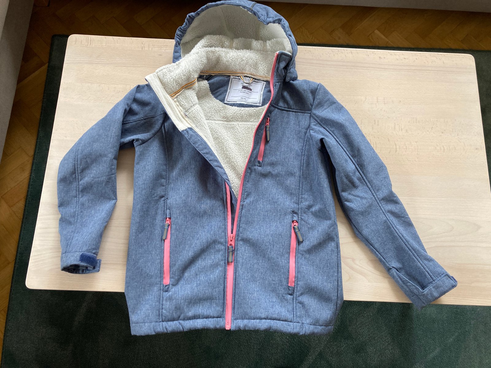 Dívčí softshellová bunda s bílým kožíškem na celé vnitřní straně a fleecem v rukávech a kapsách. Vhodná na jaro/podzim, vydrží i lehký deštík, příjemně teplá, neprofoukne. S odepínací kapucí a reflexními prvky na kapuci, zipech a zadní straně. Zn. Tchibo, velikost 146/152, cca 10-12let. Rozměry: celková délka od ramen k dolními okraji cca 60cm, šířka cca 45cm, délka rukávů cca 54cm. Ve velmi pěkném stavu, žádné vady, jen lehce ošoupaný přední zip (viz detail) a nadepsané jméno na vnitřní cedulce je zakryto permanentní fixou. Zašlu poštou (Balíkovna, Zásilkovna), nebo osobní odběr Praha 6-metro Bořislavka. PC 999Kč.