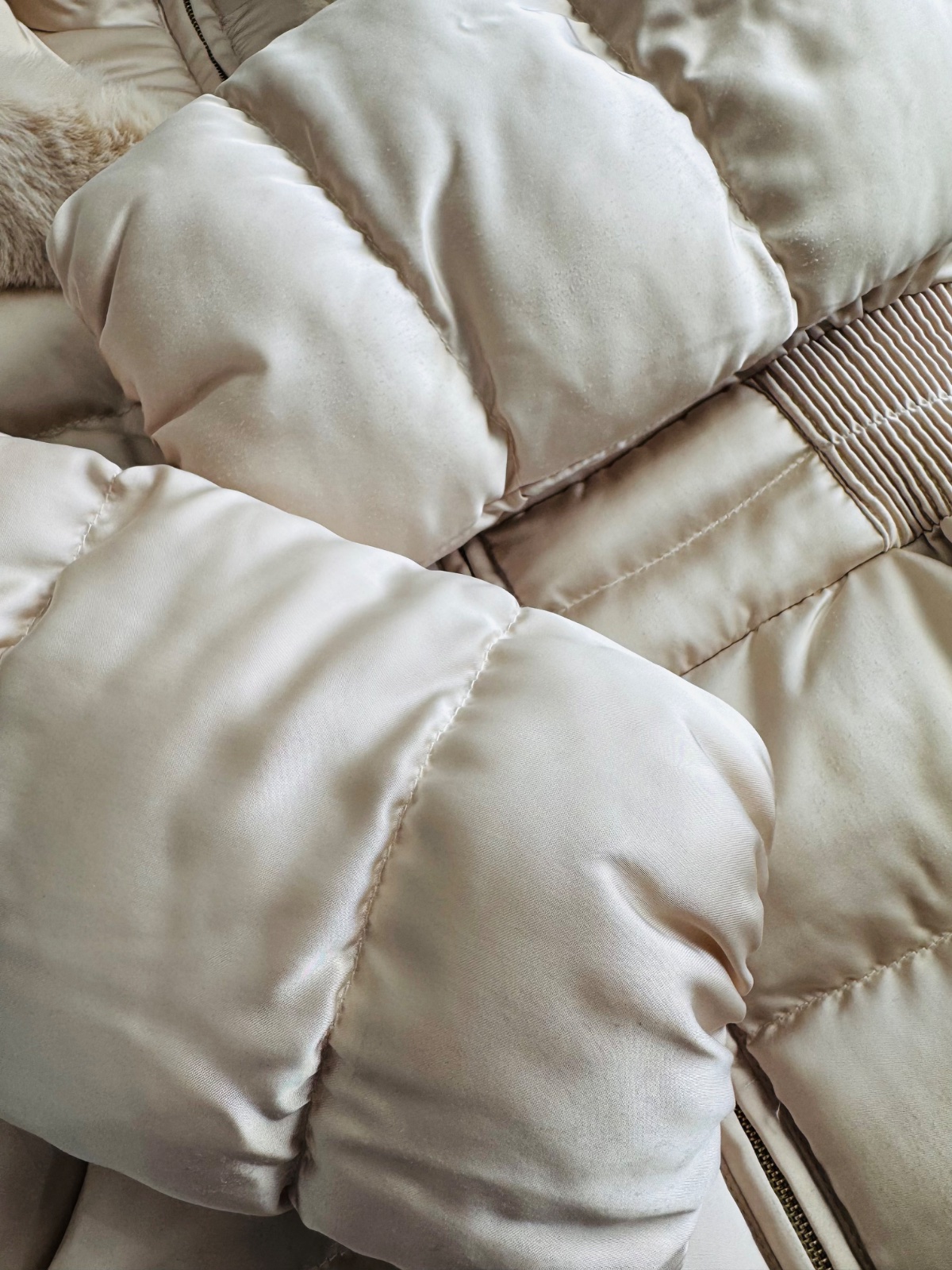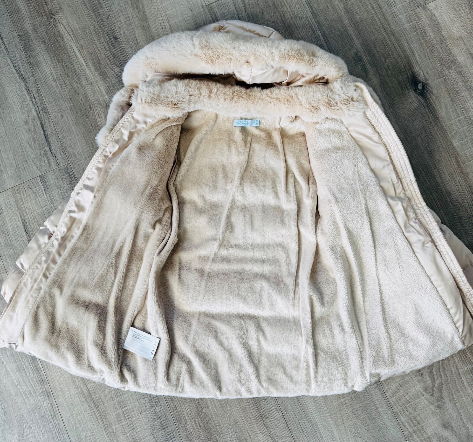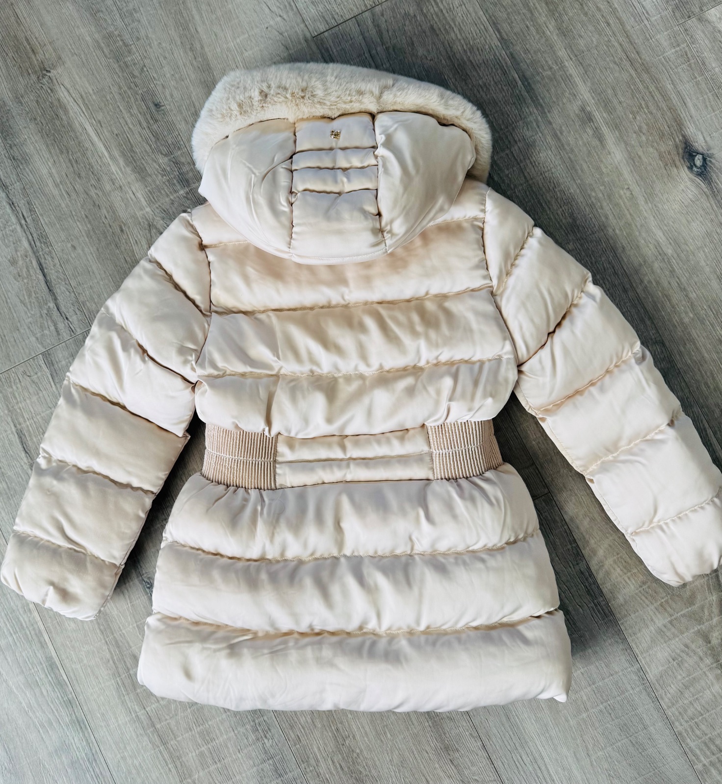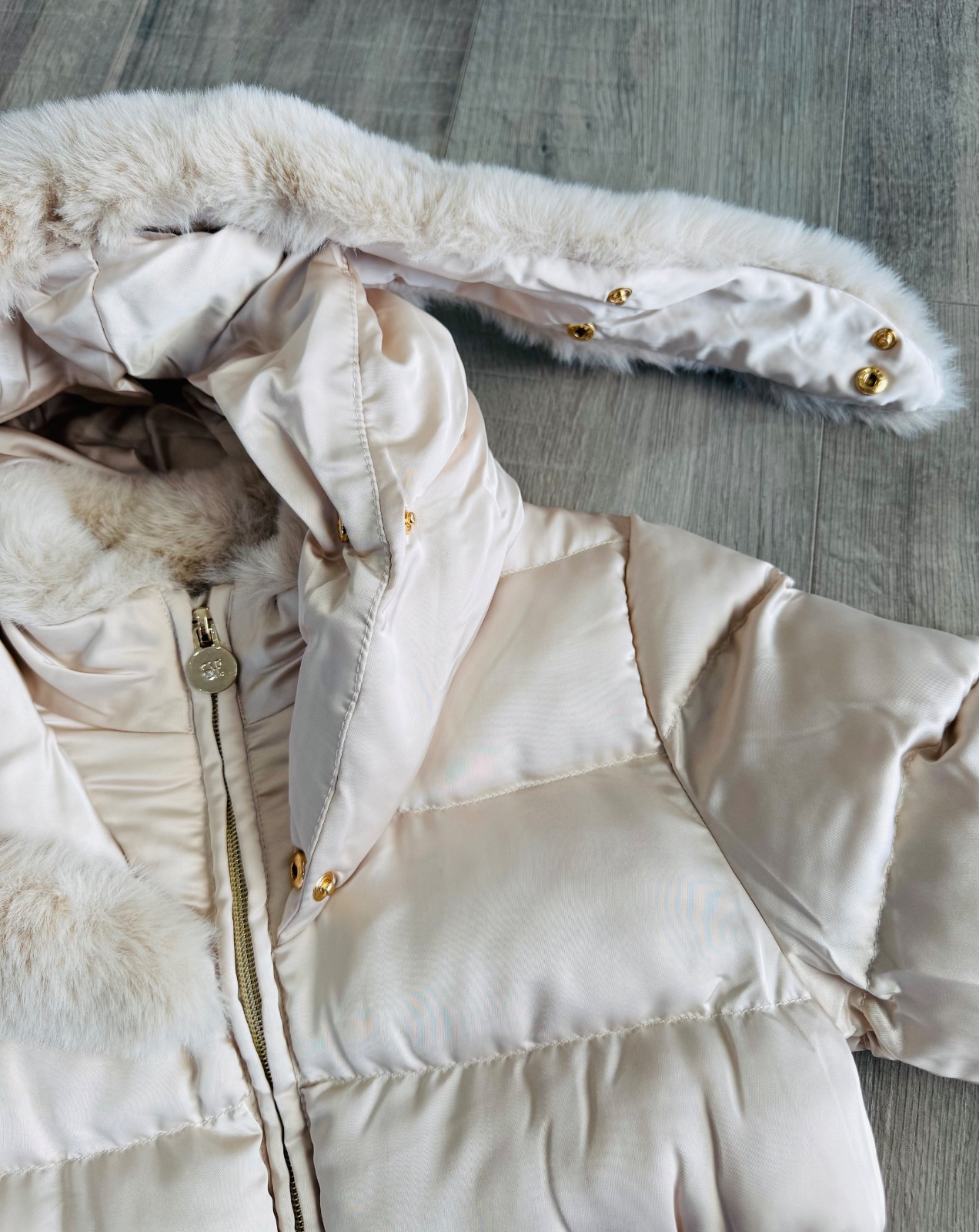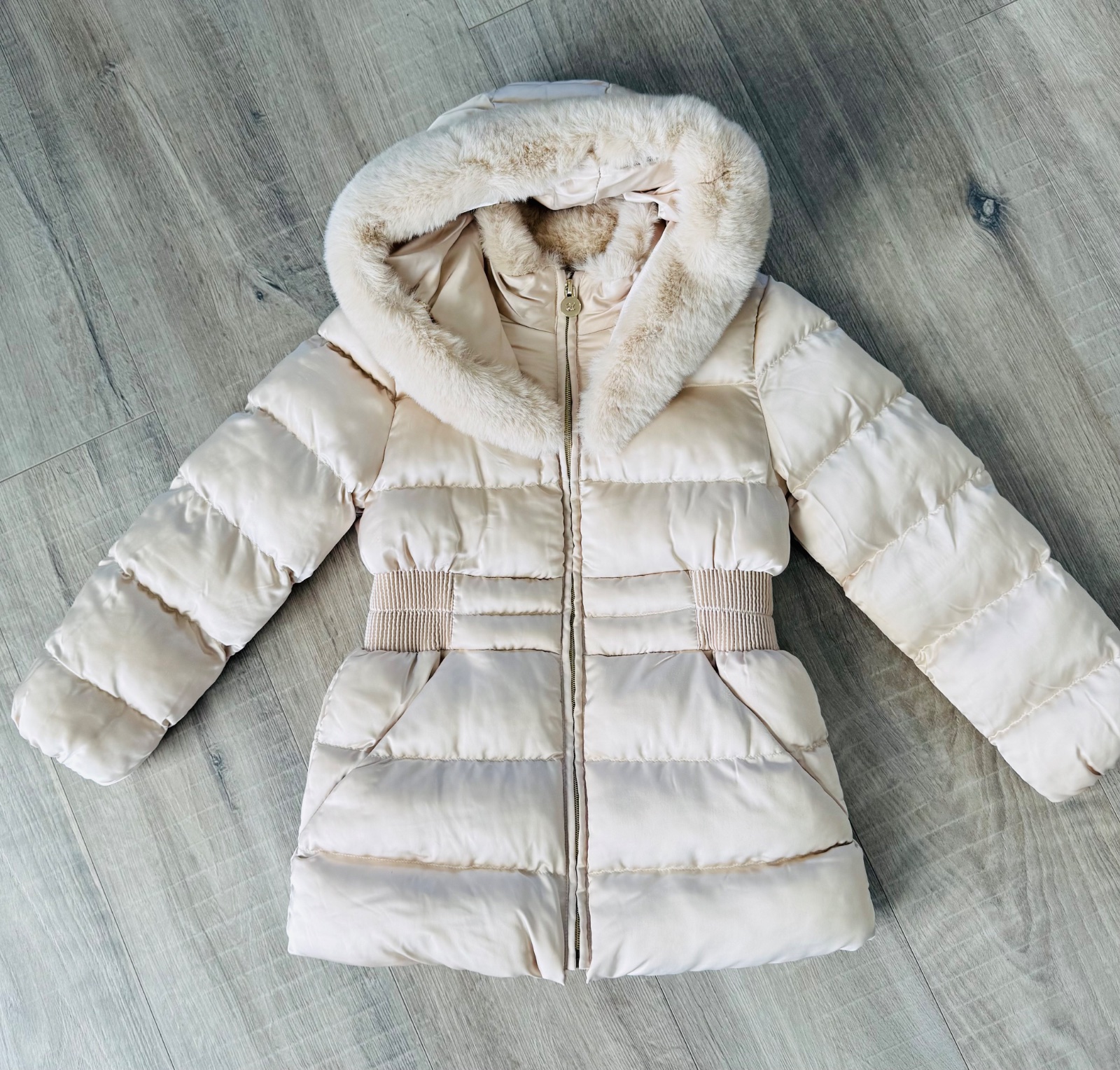 Krásná luxusní šampaň-zlatá zimní bunda s kožíškem uvnitř i v kapsách.