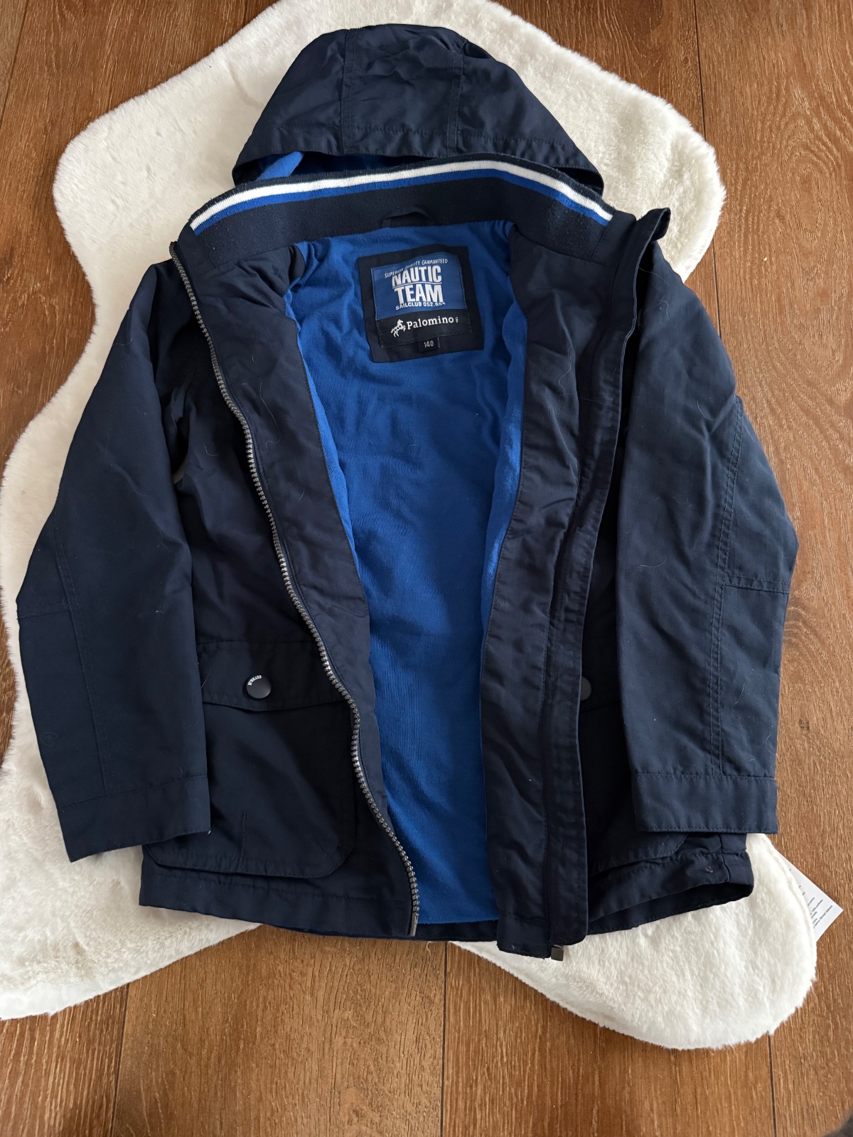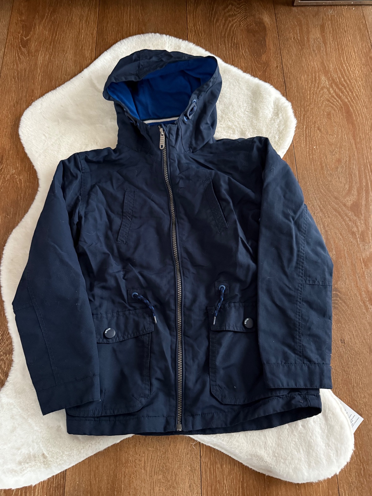bunda byla nošená, malé dírky jsou v materiálu kolem gumy na rukávech, materiál je tam ošoupaný, kapuce se dá schovat do límce, švy jsou lepené - neproteče skrz déšť, zipy ok...věk 9 - 10 let, ruká...