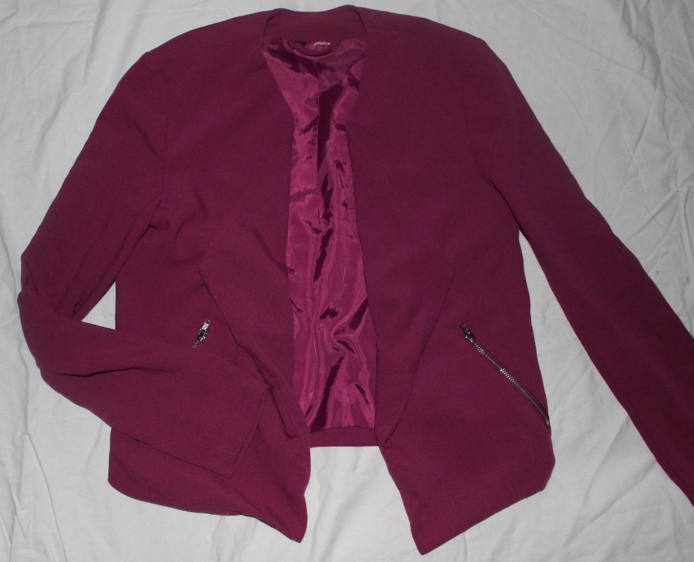 Velmi málo nošené. Lehké, zajímavý střih-sáčko bez zapínání, přední díl delší a pěkná ostružinová barva, 2 boční kapsy na uzávěr. Možno využít jako společenské.