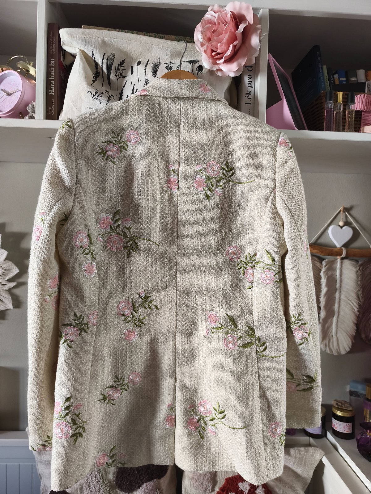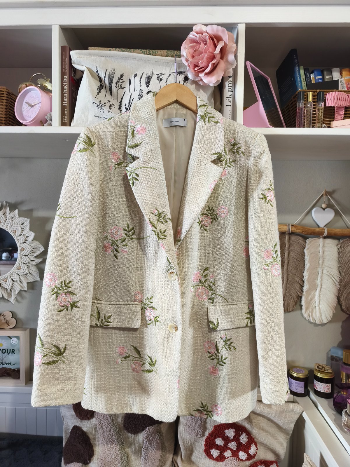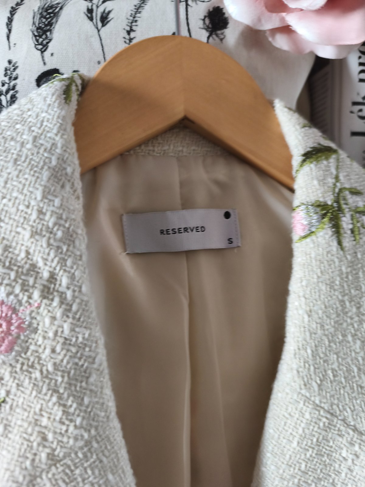 Jednou vzaté nádherné krémové tvídové sako s květinami. Vel S, sedí spíš M. Podklad krémový, světle růžové kytičky. Limitovaná kolekce Reserved.