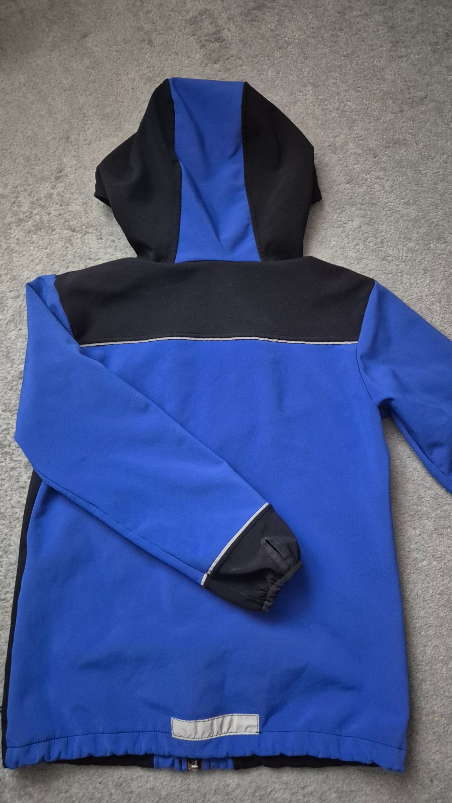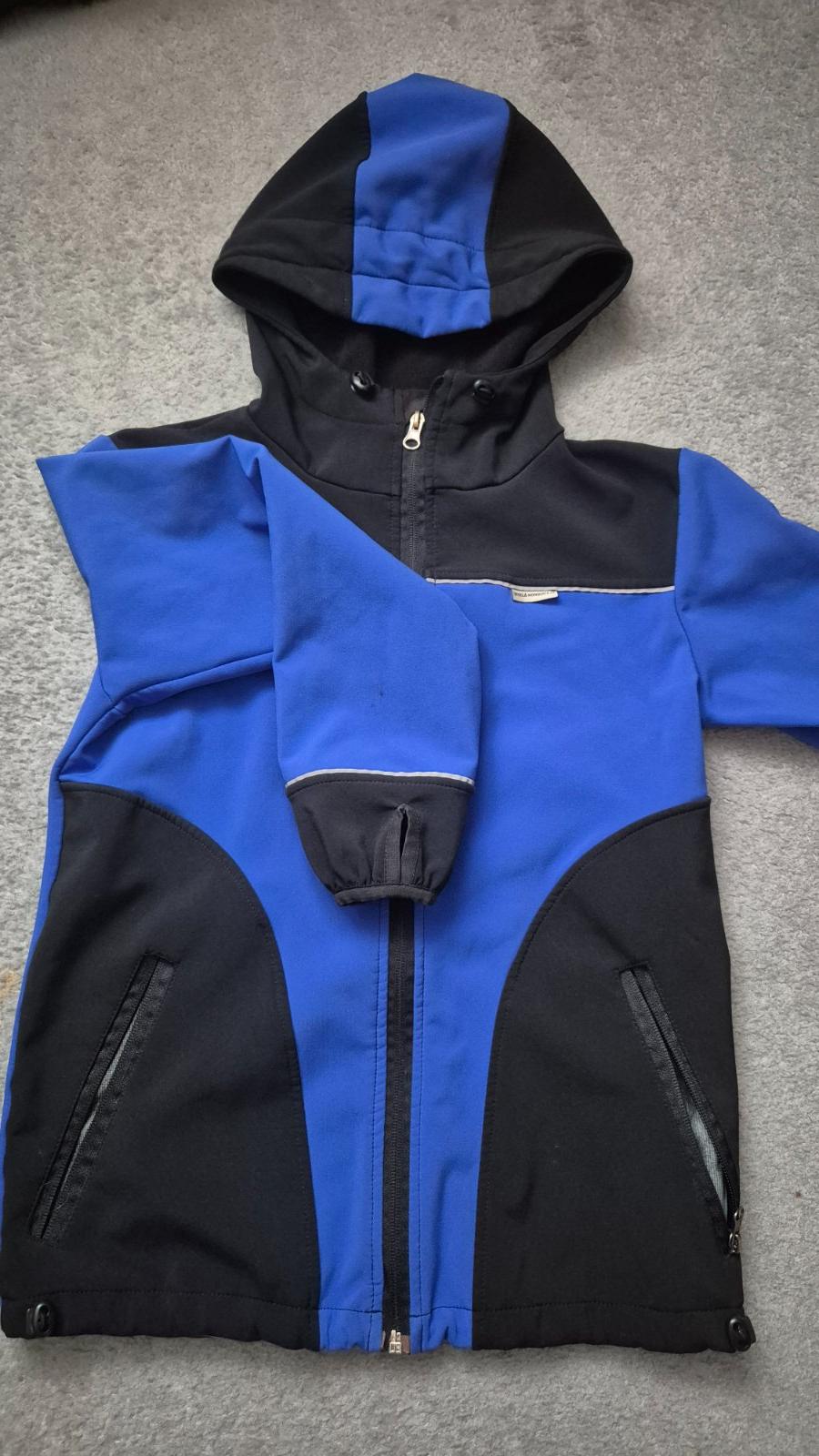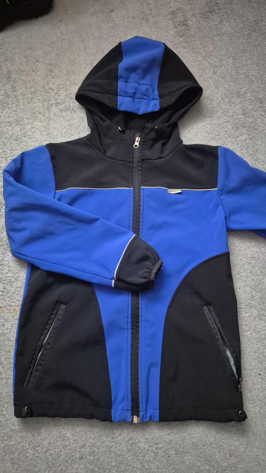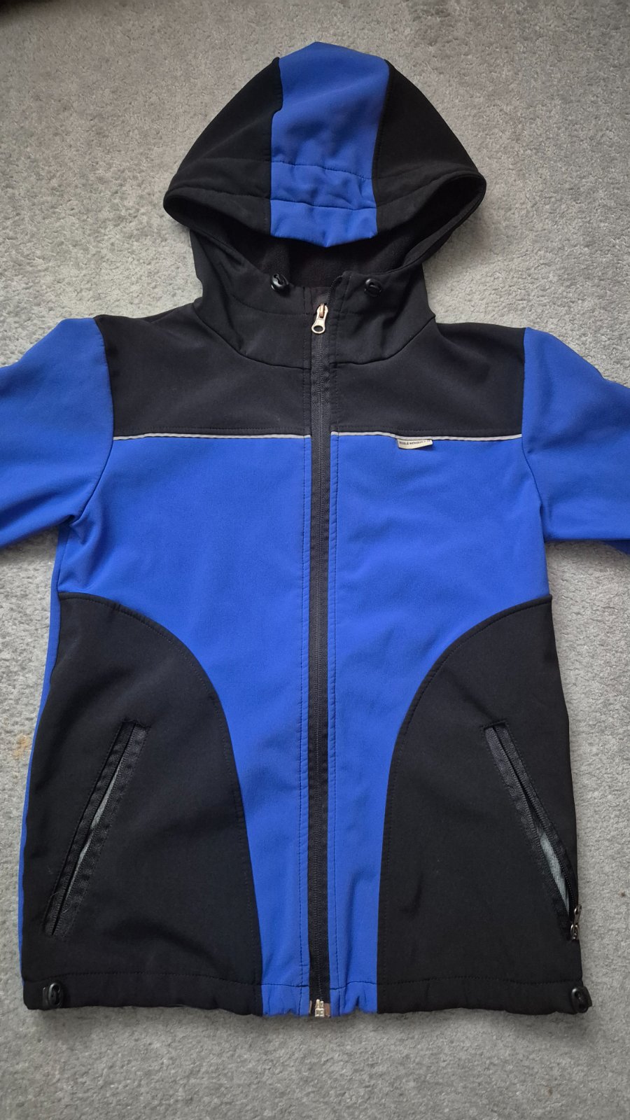 Celoroční softshelová bunda s kapucí a dvěma kapsami.zn. Veselá Nohavice. Vel. 140 cm. Modro černá barva. Díry na palce. Reflexní prvky. Vodní sloupec 8000 mm, prodyšnost 5000 g/m2/24h.