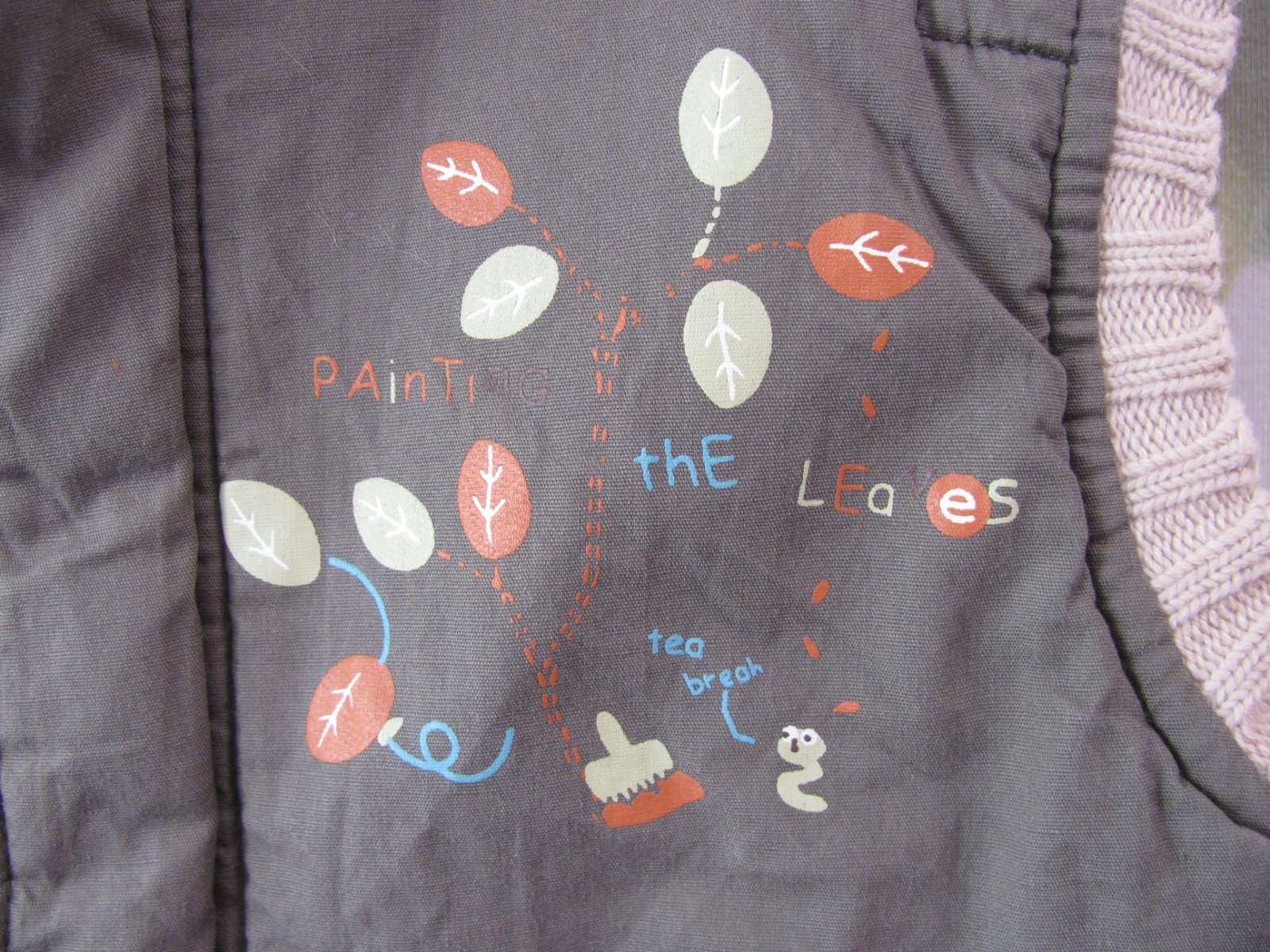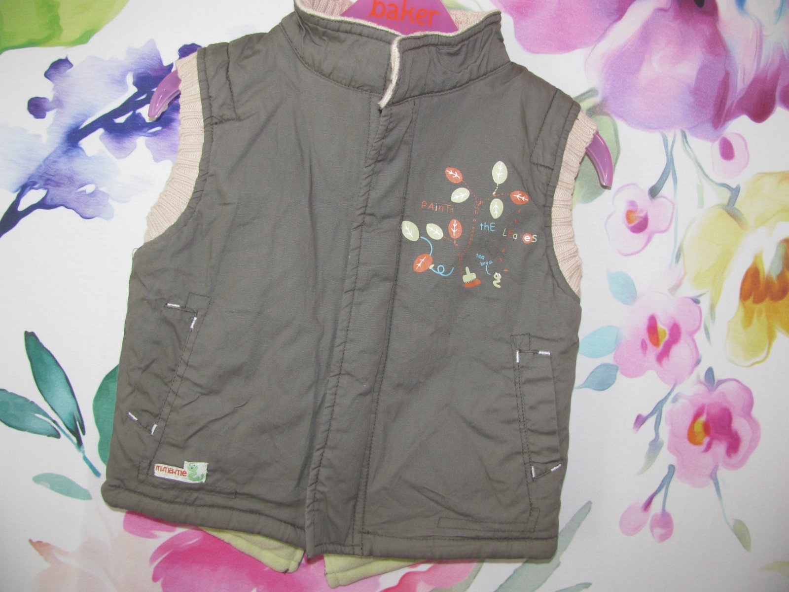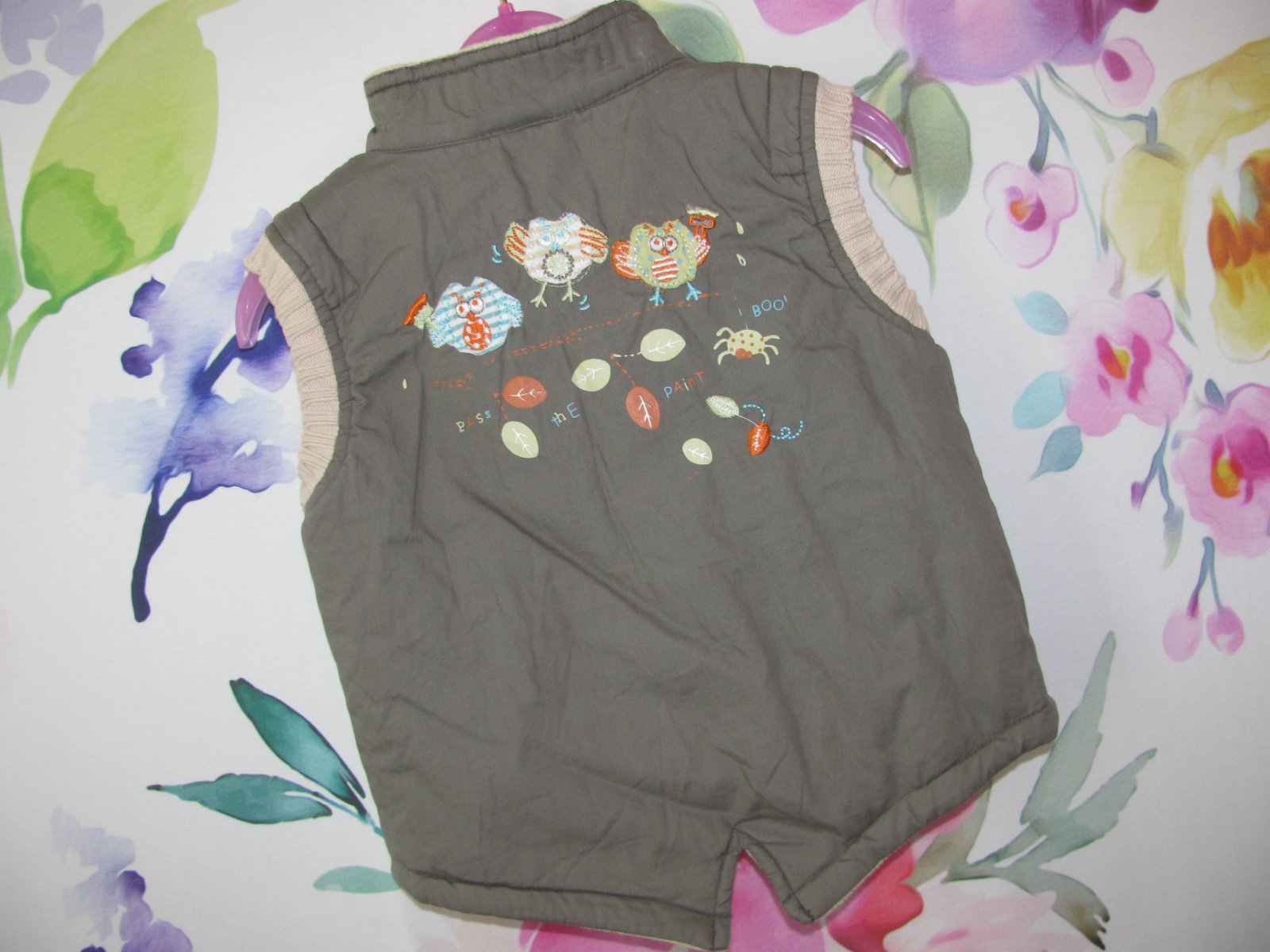 Hezká ,lehká , šedá vesta, s hřejivou podšívkou, pružné lemy z nápletu, boční kapsy, tištěné obrázky, zap. na zip, 100% polyester.