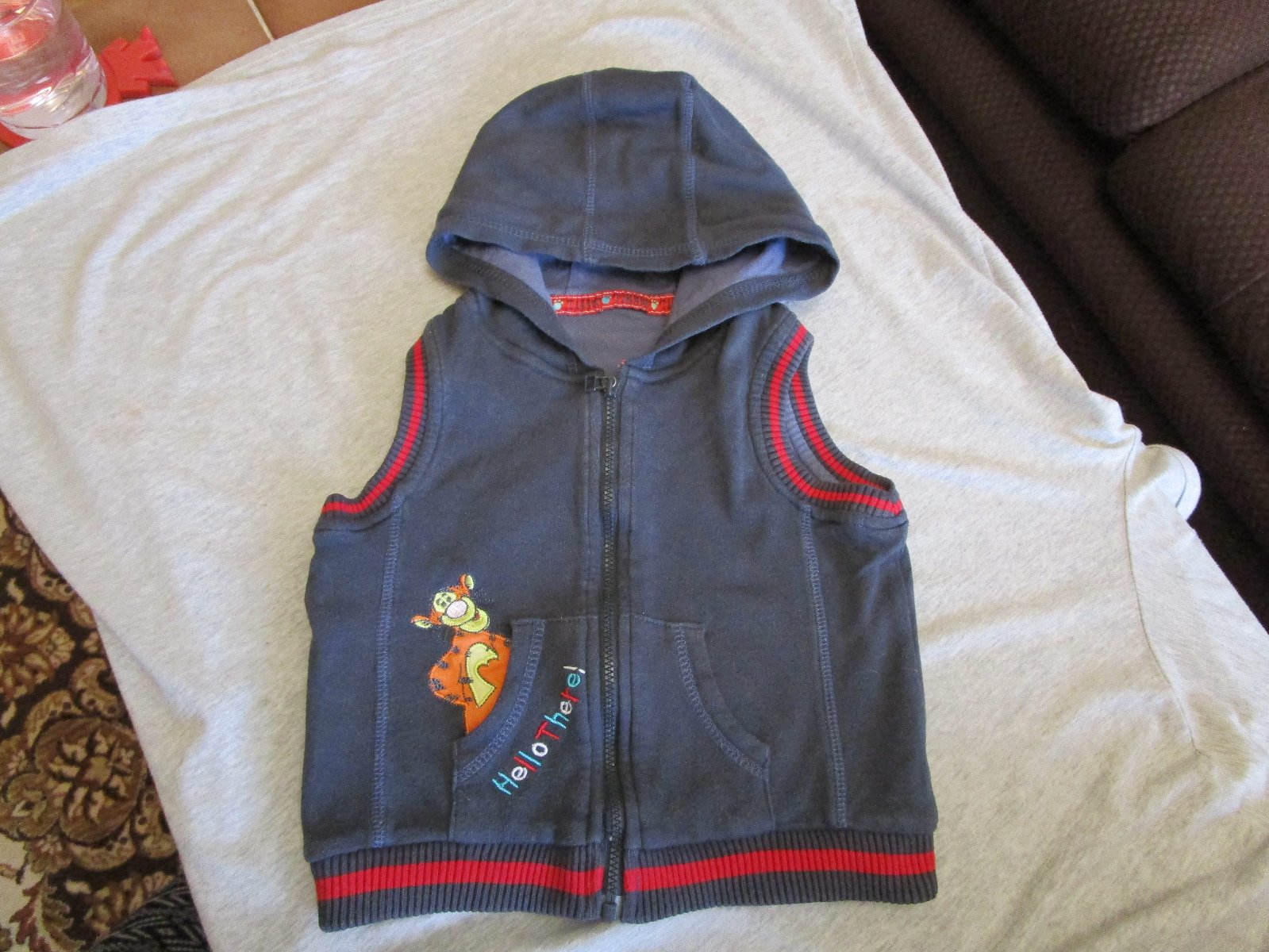 Pěkná tm. modrá bavl. vesta s kapucí, zapínání na zip, vel. 80-86 (12-18 měsíců), zn. Disney by George, cena jen 49 Kč, s tygrem od medvídka Pú.